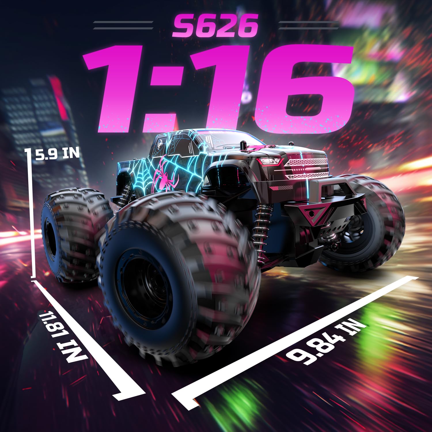 ["Glowing remote control car for boys: The striking spider graffiti and recessed LED lights of this RC car exude a strong sense of freedom, casting a captivating light in the dark and transporting kids into the exciting world of RC racing. With every turn of the controller, the RC car responds precisely, skillfully mastering obstacles and overcoming challenges. Start an exciting adventure with this glowing RC car!","Built for rough adventures: This remote-controlled car is made of high-quality PVC materials and has a robust composite chassis designed to withstand the rigors of wild driving. The improved drive system allows for stunning jumps and speeds of over 15 km/h on rough terrain. Equipped with front bumpers that provide crucial collision protection, this RC car delivers outstanding performance and durability.","Endless fun within reach: Enjoy around 30 minutes of driving pleasure powered by a powerful pair of 3.7V 1500mAh rechargeable batteries! The thoughtful design allows for easy battery replacement, so you'll spend minimal time waiting for charging. This ensures uninterrupted enjoyment is always within reach. Equipped with TPR rubber tires for excellent grip, it effortlessly tackles various terrains like sand, grass, mud, and rocky paths.","PERFECT SIZE AND CONTROL DISTANCE: The 1:16 scale RC car is the perfect size for indoor use. The maximum control distance between the RC car and the controller is 60 meters.","GIFT FOR KIDS: Toy cars for kids are suitable for playing, racing, or decorating. Classic RC cars can be used as Christmas gifts, birthday gifts, and prizes for 6, 7, and 8-year-old boys and girls who love electric RC cars and enjoy trying out new and exciting toys."]