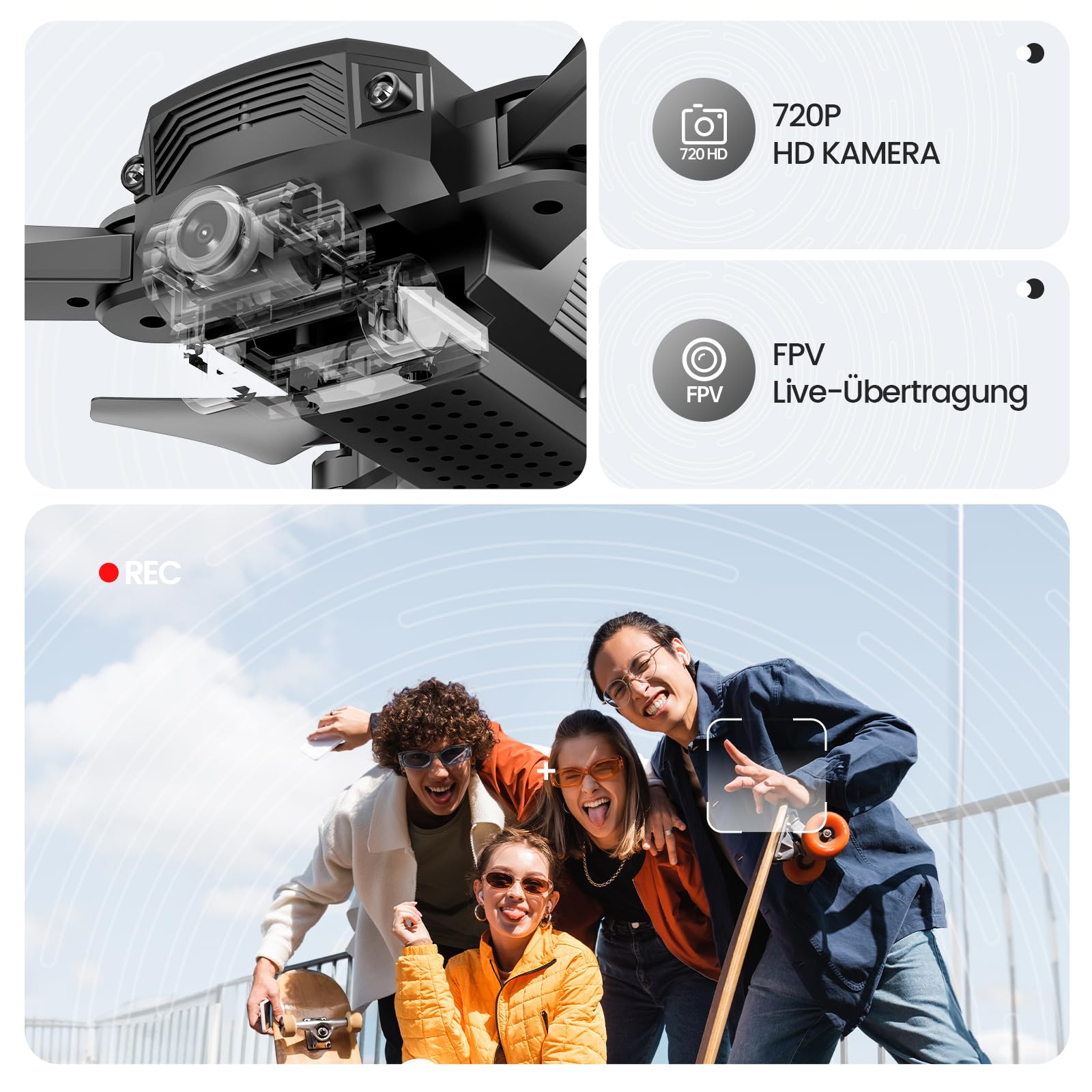 "720P HD FPV Camera: Who wouldn't want to see the world from above? With the FPV drone, which has a 720P, 90° swivel camera with live transmission, you can realize it, experiencing your connection to nature from a bird's eye view.