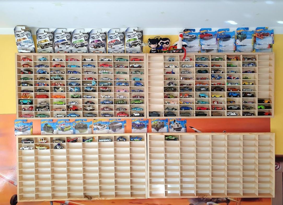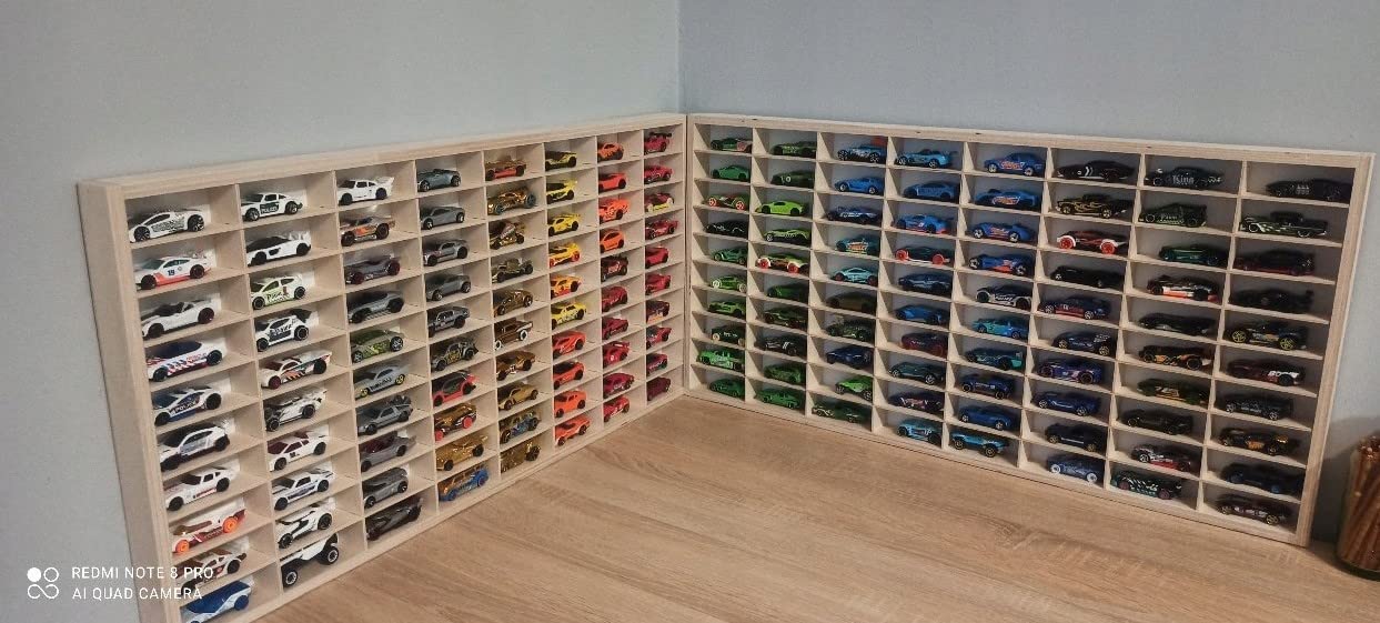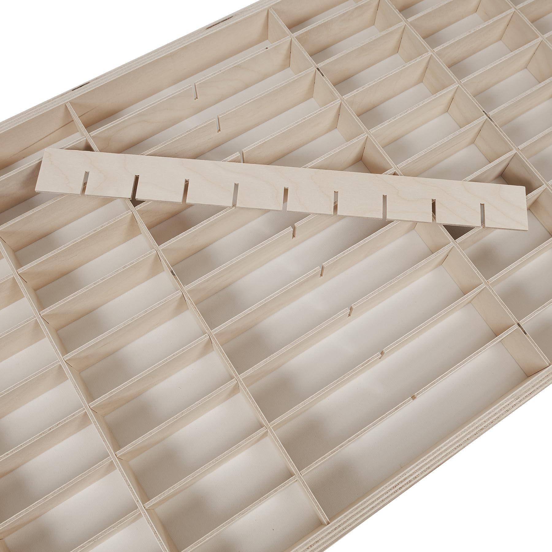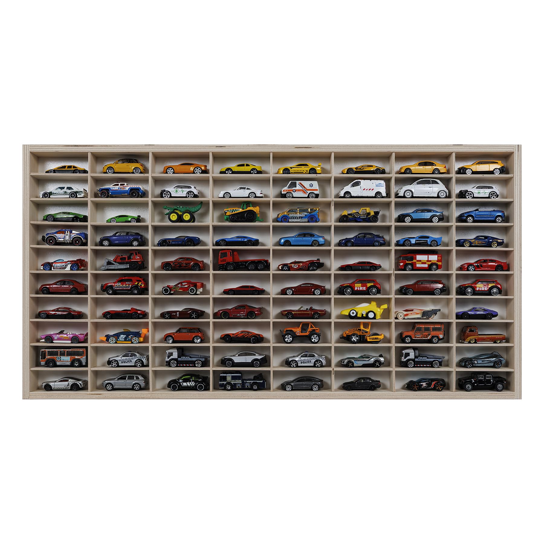 ["Wooden organizer with compartments","Dimensions: 30.9 x 15.7 inches","Compartment depth: 1.6 inches","Dimensions of compartments: 3.8 x 1.4 inches","Number of compartments: 80","Shelf backs white","Removable shelves provide more space for larger cars"]