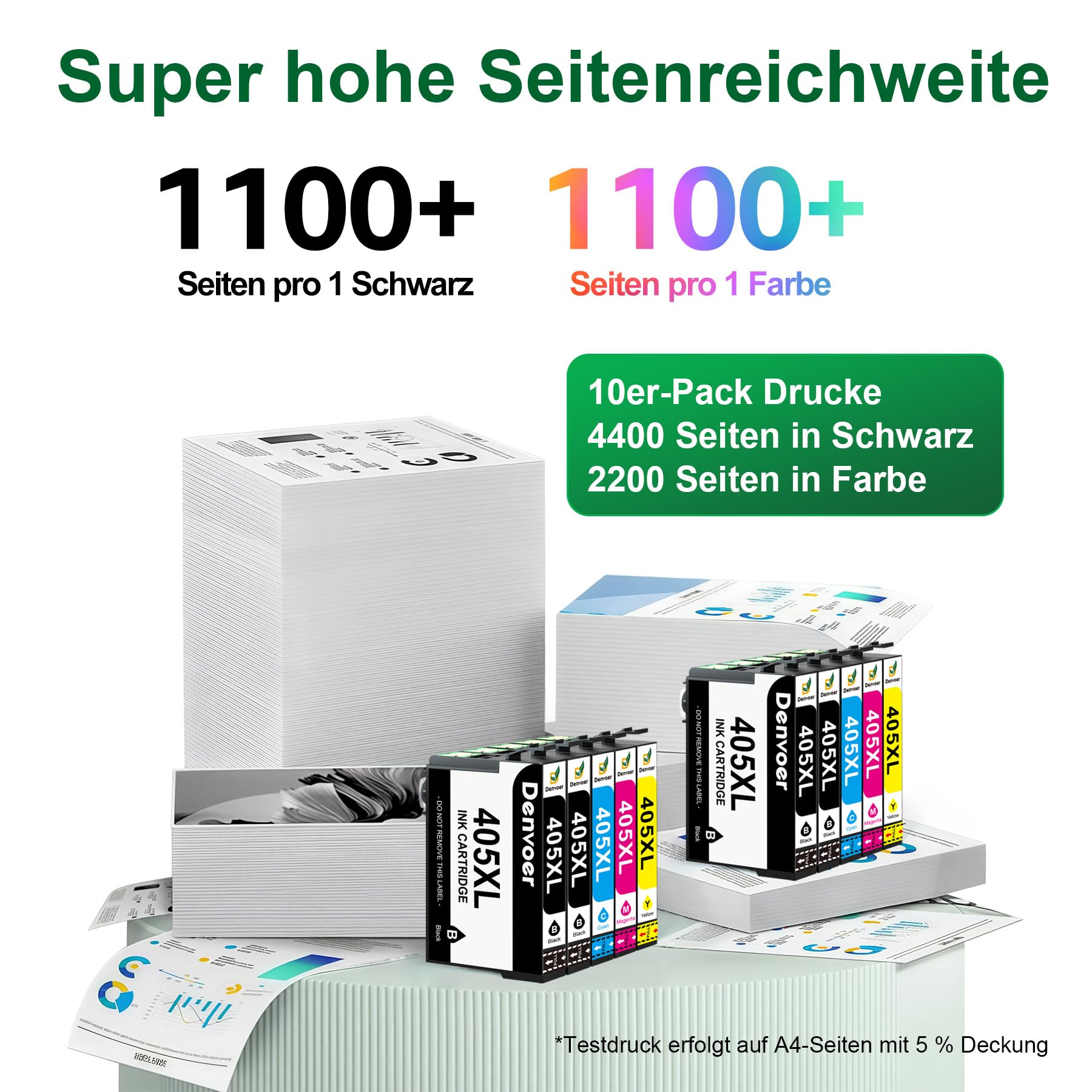 High page yield: The compatible for Epson 405xl Black delivers up to 1100 pages, and each compatible for Epson 405xl color ink cartridge delivers up to 1100 pages (based on 5% coverage). 10-pack 405xl ink cartridges for a total of 4400 pages black and 2200 pages color. With our high-quality Denvoer ink cartridges, you get more performance for your money, print more pages, and last longer.