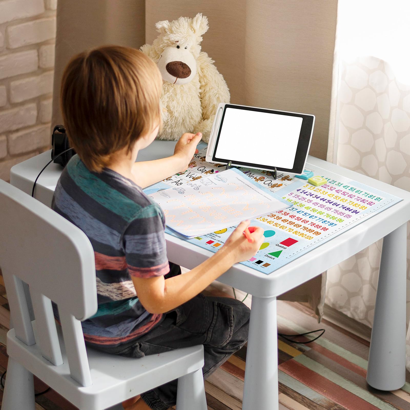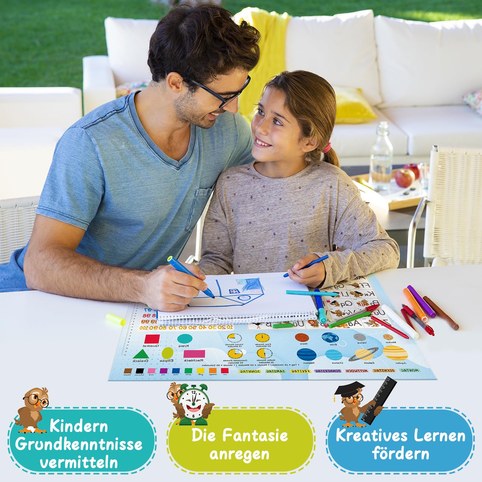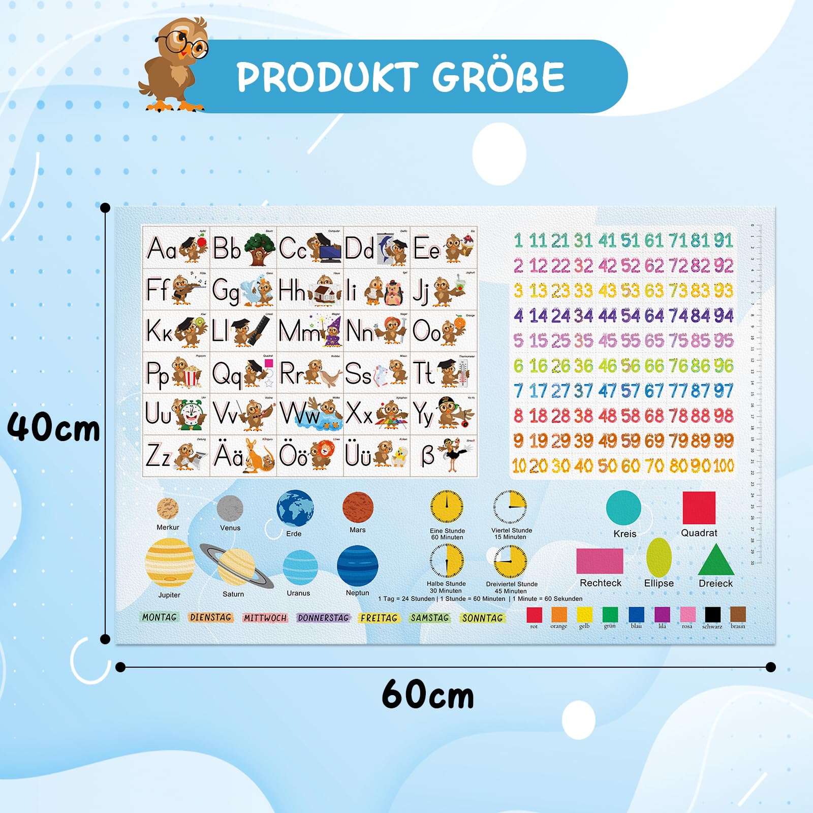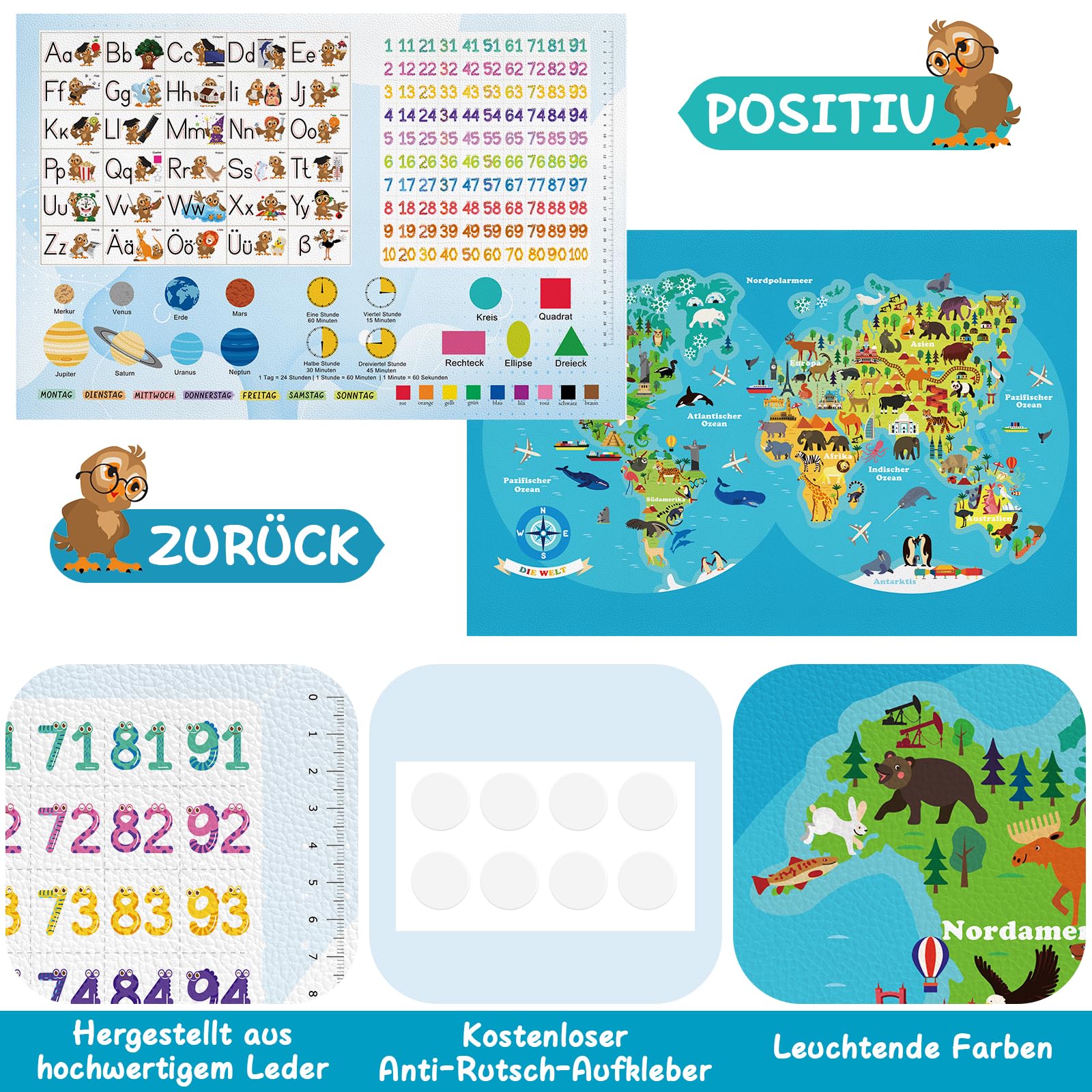["【Double-sided design】 - Features a fun alphabet design on one side and a vibrant world map on the other side, inspiring playful exploration of animals, landmarks, and natural wonders around the globe","【Child-Friendly Learning】 - Designed for elementary school children, the desk pad combines the alphabet with animals to make learning exciting and easy. The back side provides additional knowledge with a world map to spark curiosity","【Practical and durable】 - Waterproof and wipeable, perfect for dealing with stains from colored pencils, watercolors, glue, or crumbs. The anti-slip patches on the back ensure the mat stays securely on the table","【Educational Content】 - In addition to the alphabet, the mat includes numbers, months, weekdays, time, and geometric shapes, providing children with essential knowledge as they learn","【Collapsible Storage Design】 - Home travel takes up no space, suitable for family use, and your kids to learn and paint together!"]