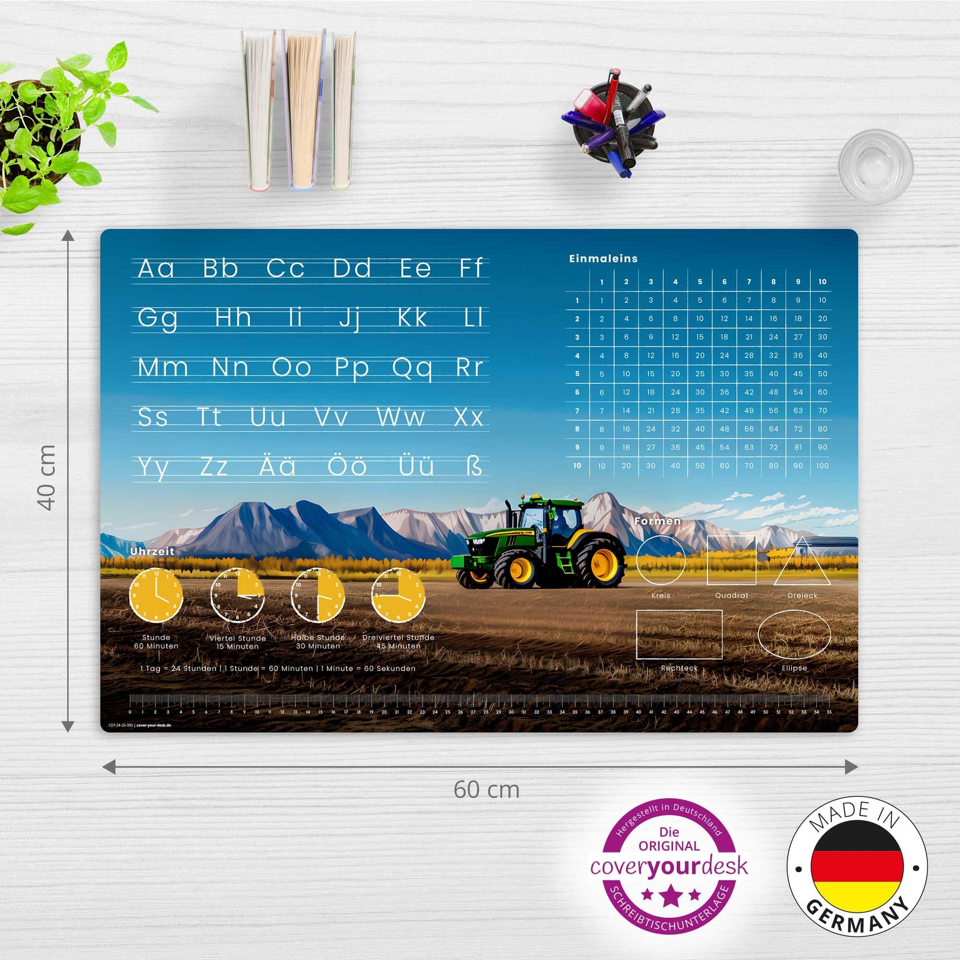 Desk pad for children - learning pad for starting school in various designs - ABC, times tables, clock - 60 x 40 cm - made of wipeable vinyl - Made in Germany (tractor design)