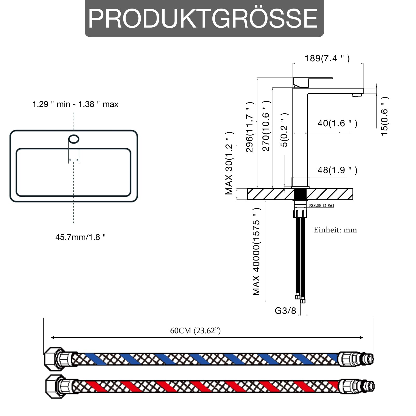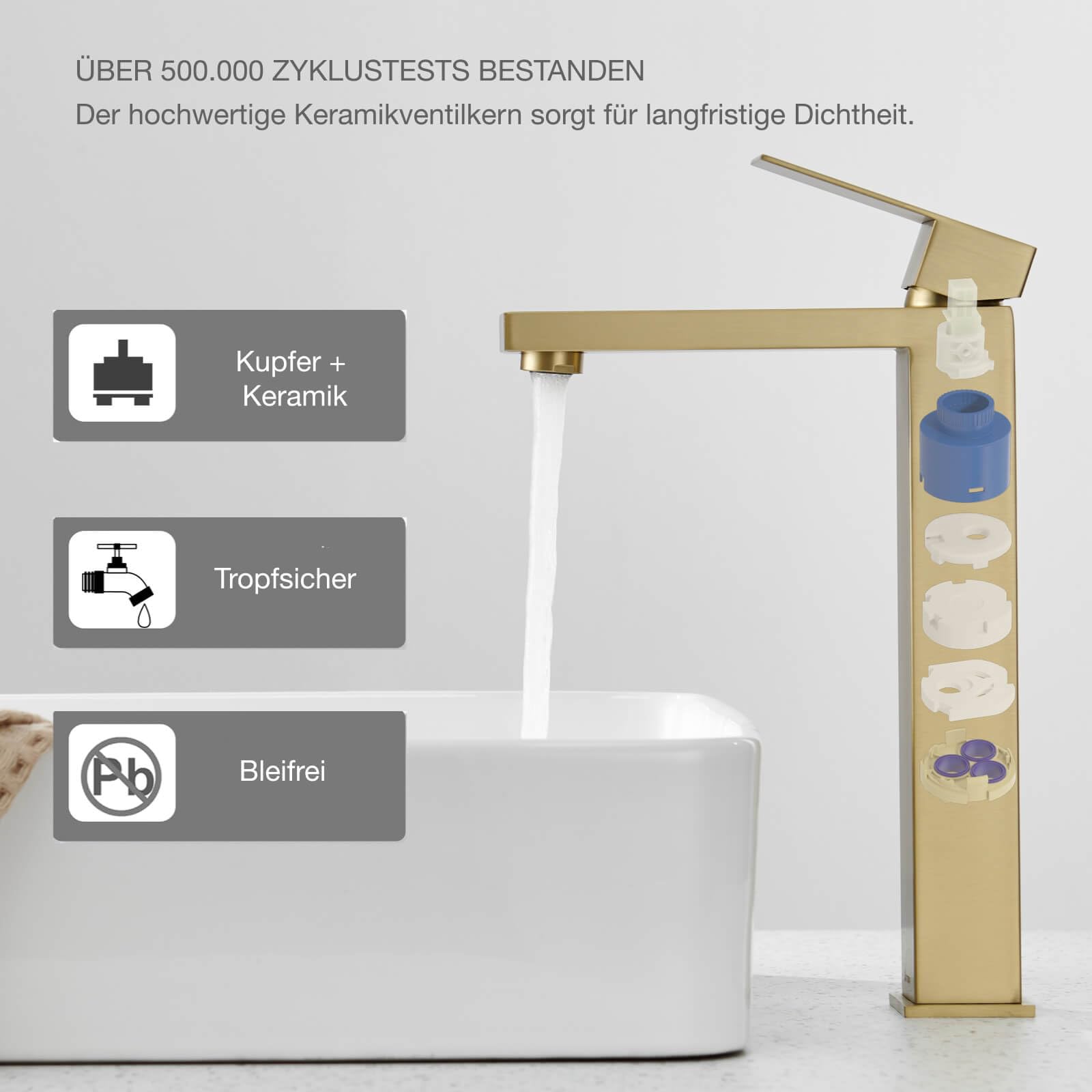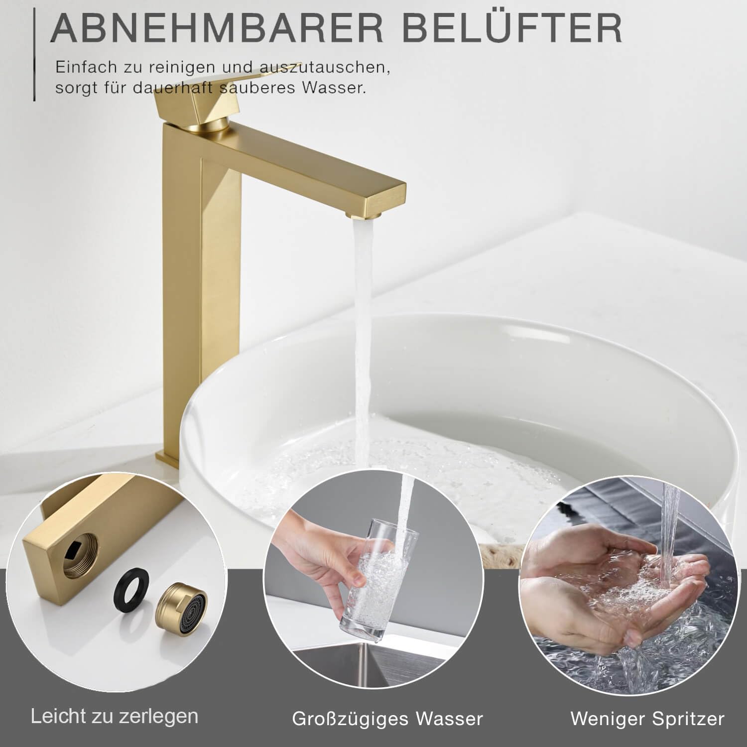 ["Robust and durable: DETBOM bathroom faucets are made of high-quality 304 stainless steel, which is corrosion-resistant and does not easily rust. The brushed gold color ensures that the faucet does not easily show fingerprints and water stains, and is easy to clean. The stylish and simple gold appearance can bring elegance to the bathroom.","Drip-proof: This bathroom faucet features a high-quality ceramic valve core, which has good sealing performance, wear resistance, and aging resistance, ensuring that the faucet does not leak or drip with prolonged use. Avoid losses due to leaky faucets.","Water and energy saving: The high-density aerator ensures a soft water flow, high flow rate, and less splashing; the high filtration performance ensures that the family is supplied with lead-free, healthy, and clean water.","Flexibility and comfort: This washbasin faucet supports hot and cold water and can meet the water needs of the whole family in different seasons. The nozzle height is 250 mm, which is very suitable for the sink in the family bathroom. Whether you are brushing your teeth or washing your face, this washbasin faucet provides a more comfortable experience.","Economical and efficient: This high washbasin faucet has the standard size of European bathroom sinks. Includes standard G3/8 interface and 60 cm long hot and cold water pipes as well as connectors and mounting accessories. And with installation steps and videos, anyone can easily perform the installation.","Quality assurance: The product quality of the faucet is directly related to the water health of people. Therefore, DETBOM always strictly controls the product quality of the faucet. If you encounter any problems, feel free to contact us."]