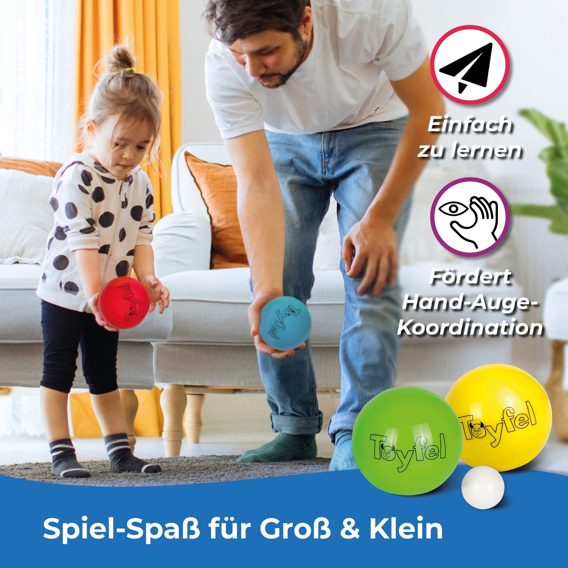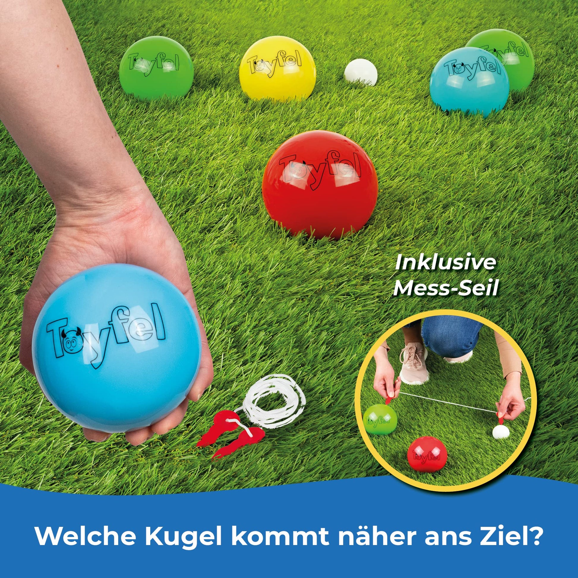 "π₯πππ¦ππ‘π¦π£πΓ FΓR DIE GANZE FAMILIE - The Toyfel Boule game requires accuracy. The goal is to get as close as possible to the small target ball with the larger balls or to push the opponent's balls away from the target. With the practical measuring tape, you can determine the distance of the balls precisely and determine a winner or team."