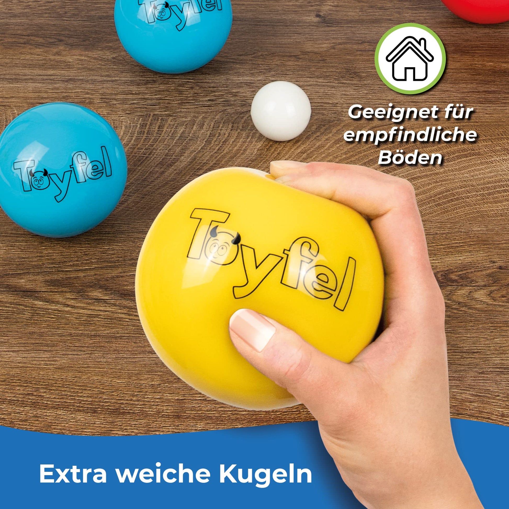 "πͺπππππ π¦π’ππ§-KUGELN (ΓΈ ca. 4 inches) - The robust indoor and outdoor boule balls (700 grams per ball) are made of high-quality plastic. The large and soft balls fit comfortably in the hand and provide long-lasting fun, without scratching your floor when playing indoors. You can fill the Toyfel Leo Boccia game with air individually using the included valve."