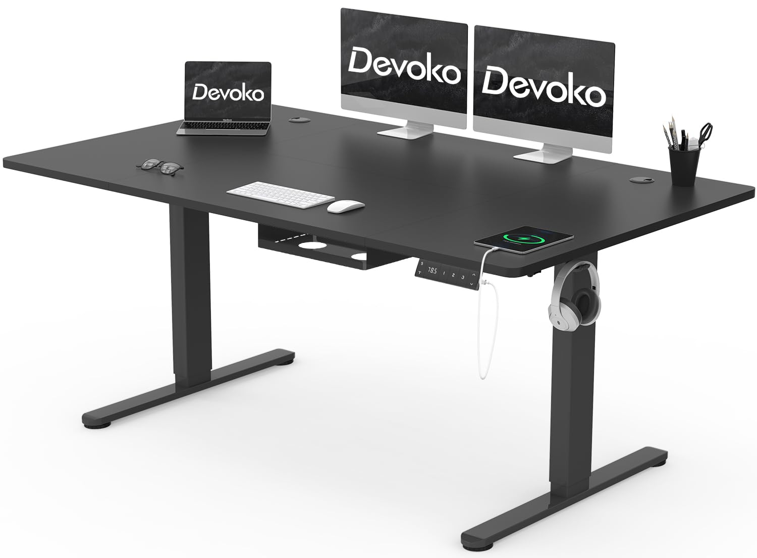 Devoko Height Adjustable Desk 160x80cm with Type-C Charging Port, Electric Height Adjustable Desk, Mobile Electric Computer Desk with Cable Management Tray, Black