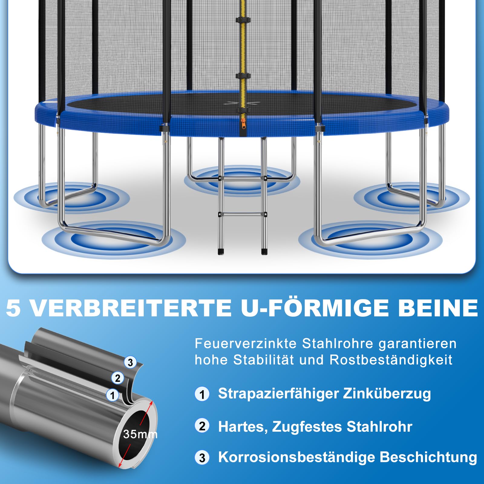 ["Better Protection for Children"] Our garden trampoline is safety certified. The heavy-duty polyethylene safety net covers the entire jumping area and has a height of 180 cm with additional zippers and safety clips for extra protection. The edges are padded with thick EPE foam and the poles are also padded with EPE foam to provide extra protection while jumping.