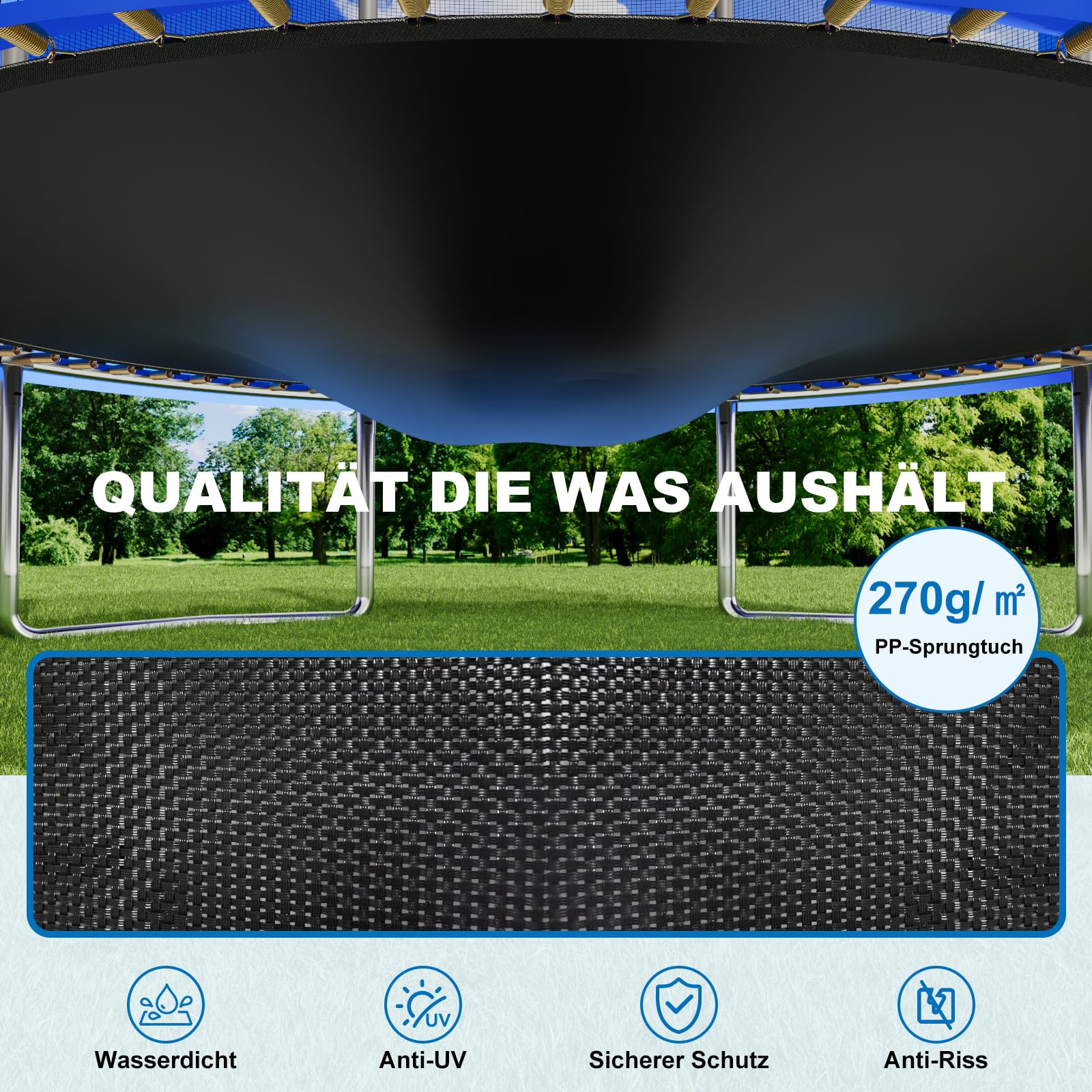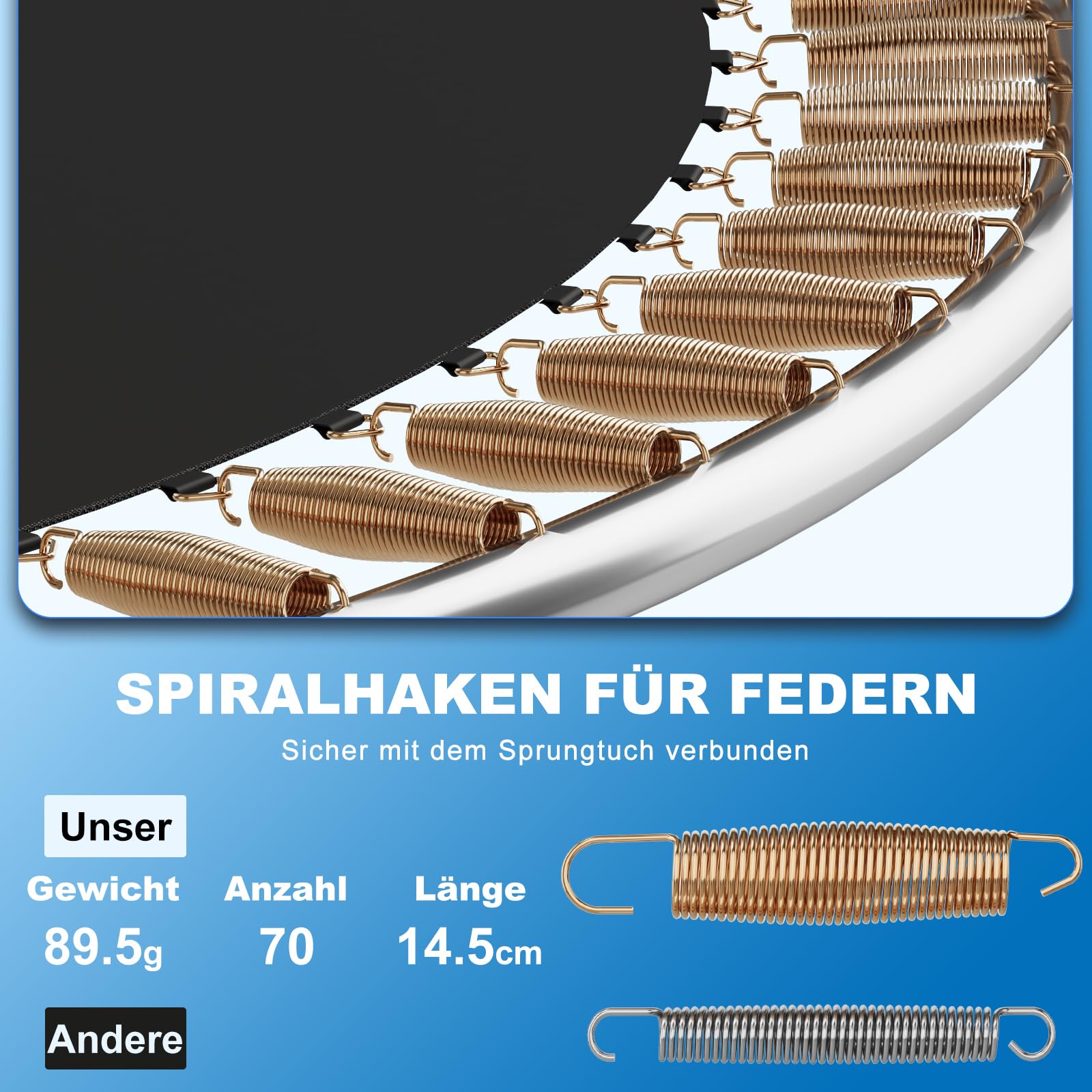["More Durability and Bounce"] The trampoline is made of high-strength, galvanized steel springs. The 366 cm long trampoline comes with 70 sturdy springs with coil hooks securely attached to the jumping mat. The outdoor trampoline has a total jumping diameter of 323 cm and features a PP UV-resistant jumping mat, which allows for higher and more controlled bouncing.
