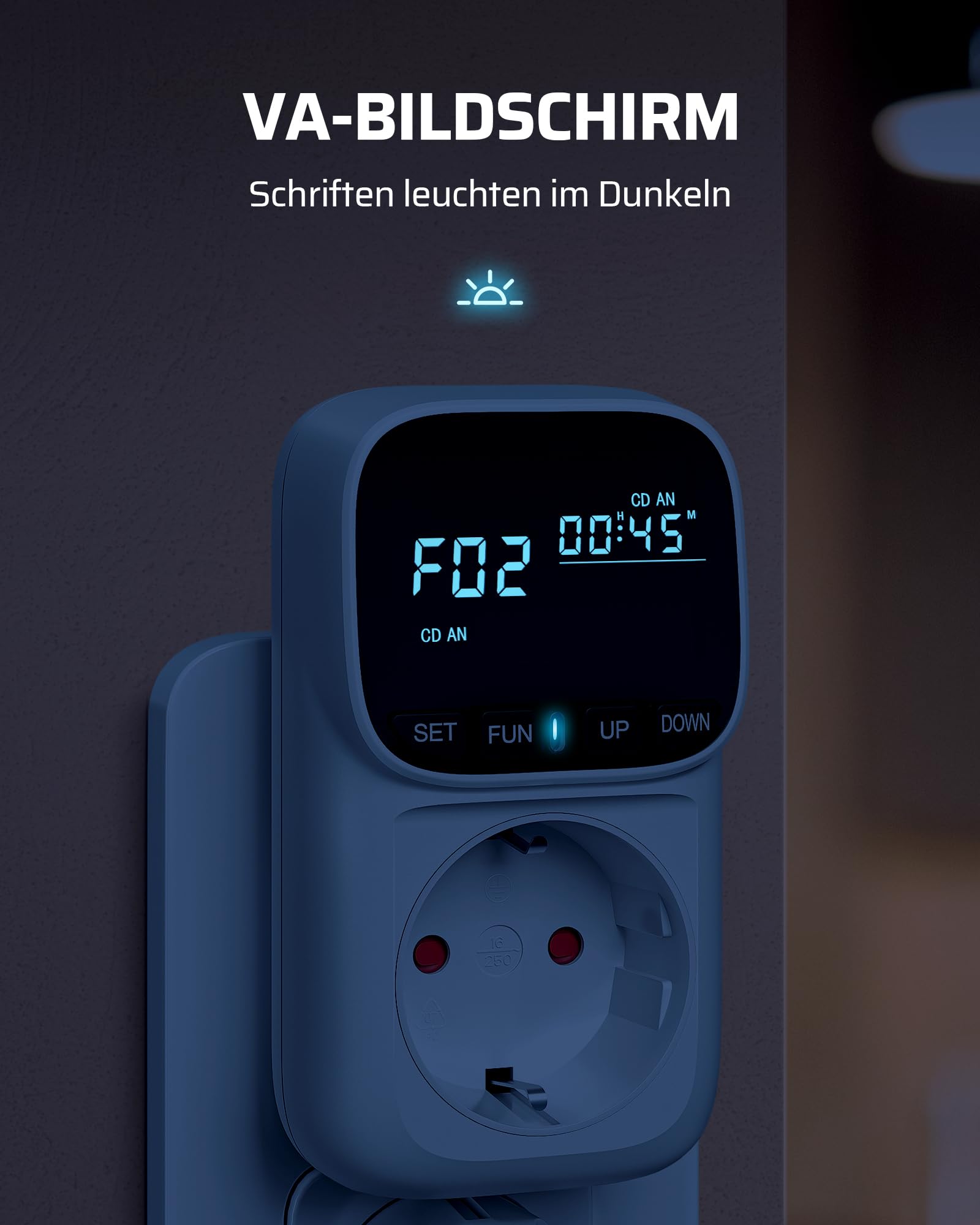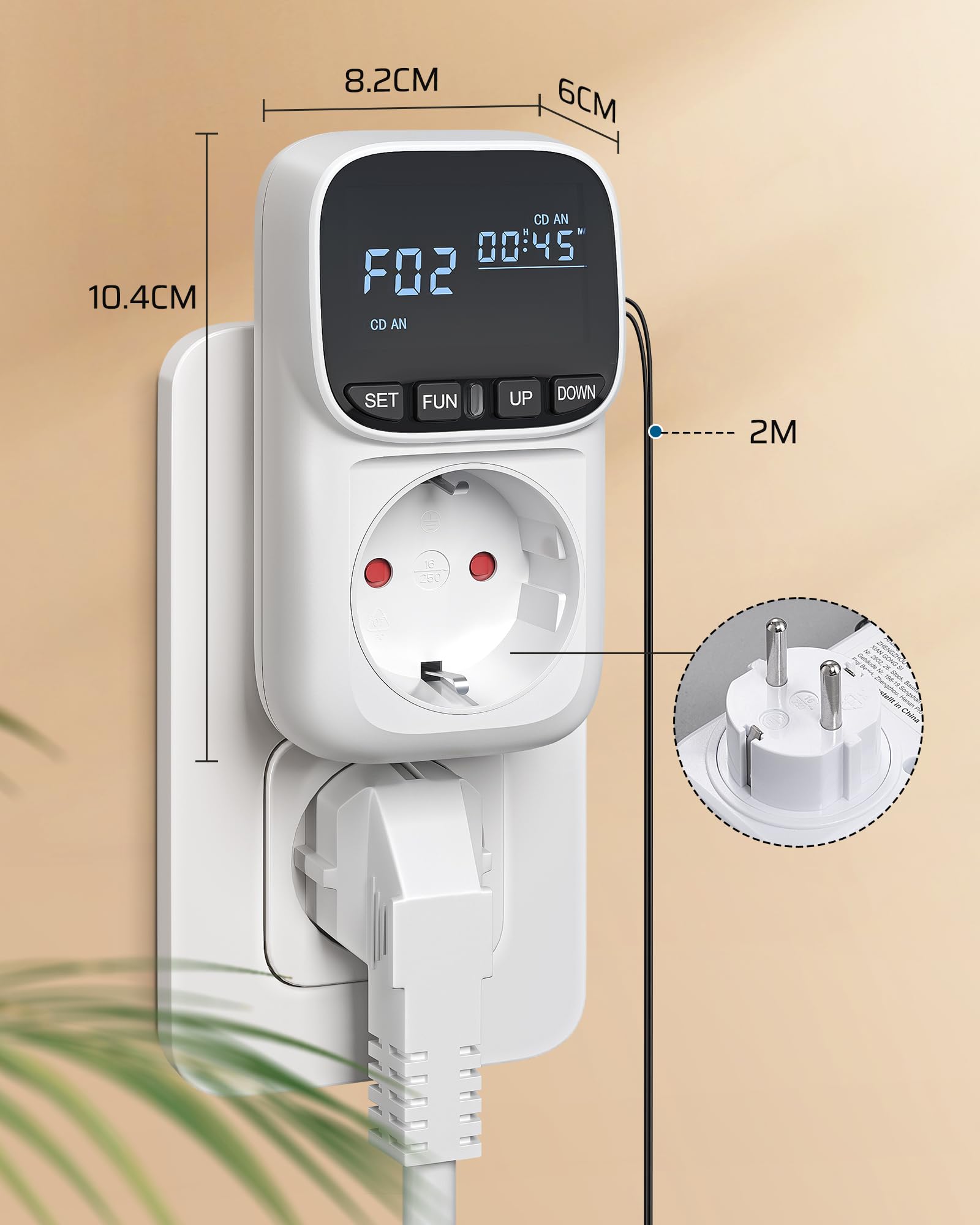 ["VA-LCD display with German display: The digital temperature controller socket with large VA screen in German language ensures clear readability, even in low light; operation is user-friendly","Temperature controller: Supports both cooling and heating modes and automatically switches between them, depending on the set temperature ranges; control your heating and cooling devices to ensure a comfortable temperature","Multifunctional temperature switch: Memory function that is automatically restored after a power failure; temperature calibration to correct deviations; four timer modes: Cyclical timer, countdown on, countdown off, and countdown on/off","Technical data: Thermostat socket, 16A, 230V; Temperature control range: -40°C to 120°C; Temperature accuracy: 0.1°C; equipped with a sensitive metal sensor for precise temperature control","Wide application: Ideal for incubators, reptile rooms, radiators, greenhouses, refrigerators, aquariums, fans, and ovens - anywhere precise temperature and time control is needed, provides convenient and automatic temperature control"]