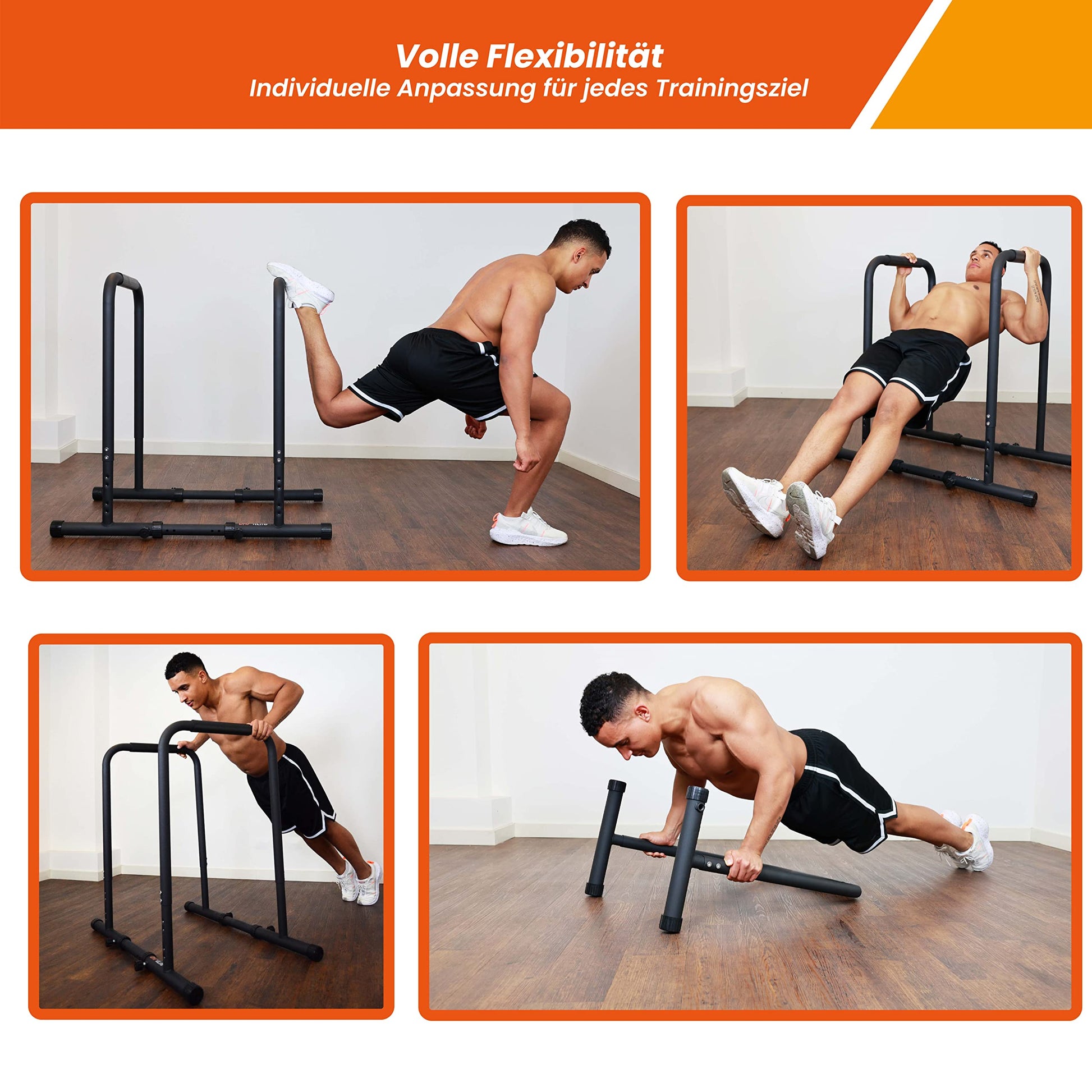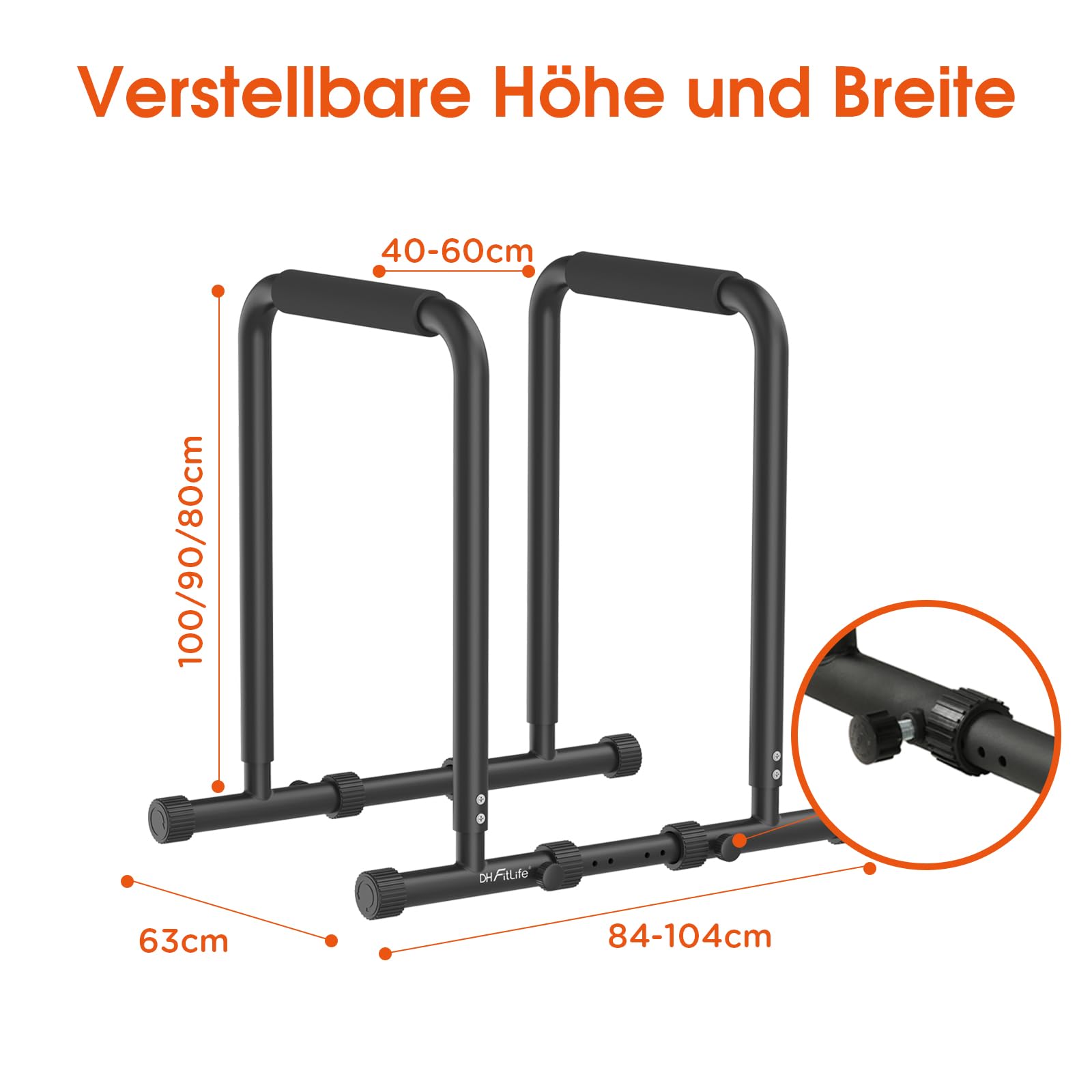 ["FAST SET-UP: The fitness bars are easy to assemble and ready for use quickly. After use, they can be easily disassembled and stored in a space-saving way. An ideal training device for your home gym.","FULL STABILITY: The dip bars are made of high-quality material and offer a dynamic load of up to 200 kg and a static load of up to 500 kg. The connecting bars between the two bars guarantee maximum stability during your training. Thanks to adjustable anti-slip caps, the dip stand stays firmly in place during each exercise.","HEIGHT AND DISTANCE INDIVIDUALLY ADJUSTABLE: The power tower offers many possibilities. The dip bars height can be adjusted between 80/90/100 cm. The distance between the parallel bars can also be adjusted by changing the length of the connecting bars.","ERGONOMIC DESIGN: The power station is designed according to ergonomic concept. The anti-slip handles are gentle on your wrists. Whether using the multipress or doing chin-ups/pull-ups, the fitness tower comfortably and safely helps you achieve your muscle-building training goals.","GERMAN DISTRIBUTOR WITH 30-DAY RETURN POLICY: DH FitLife is a German brand with distribution and customer service in Hamburg. We work with reliable and qualified teams and trainers and place great emphasis on the satisfaction of our customers. You can contact us at any time with questions or problems."]