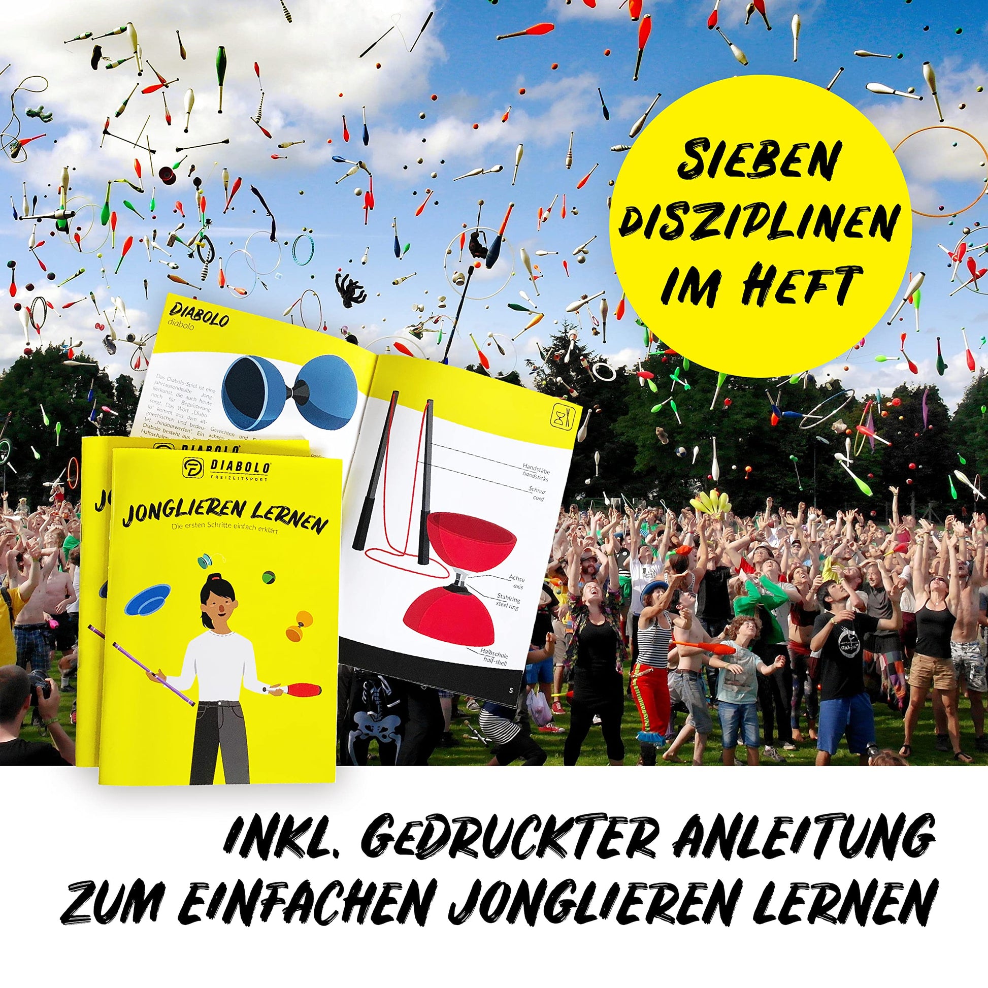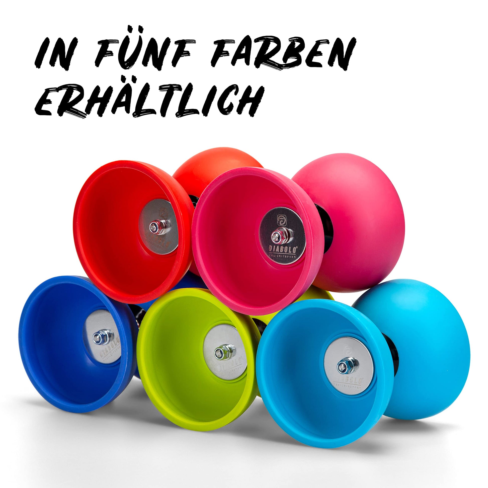 ["WITH ONE-WAY CLUTCH - Thanks to the ball-bearing one-way clutch axle, the diabolo maintains its momentum longer, runs more smoothly, and the string wears out less quickly.","ROBUST & DURABLE - The softer diabolo half-shells make less noise when dropped and don't scratch as easily as diabolos made of hard plastic.","WITH HANDSTICKS & SPARE STRING - The aluminum handsticks have a soft grip & rounded tips, preventing the string from fraying at the edge. An extra 160cm long spare string is included.","WITH JUGGLING INSTRUCTIONS - In addition to the diabolo set, a printed juggling instruction manual is included to help you quickly learn exciting and spectacular tricks.","ALL-IN-ONE PACKAGE - The set includes: Diabolo (Ø 105mm, L: 120mm, 200gr) with 2 aluminum handsticks with rubber grips (L: 32.5cm, 80gr), 2 strings (160cm, 1.3mm thickness), juggling instructions & gift packaging"]