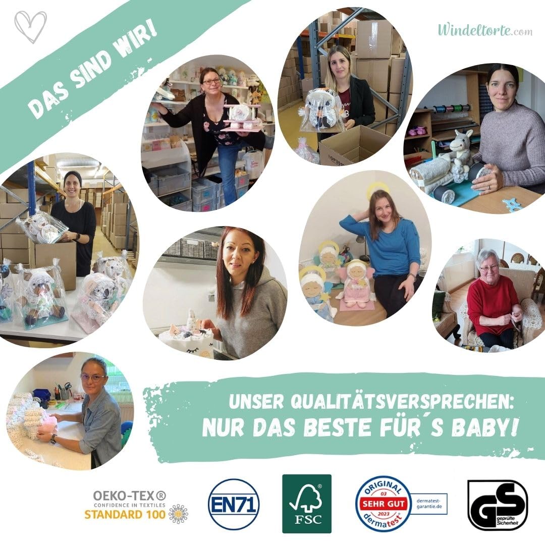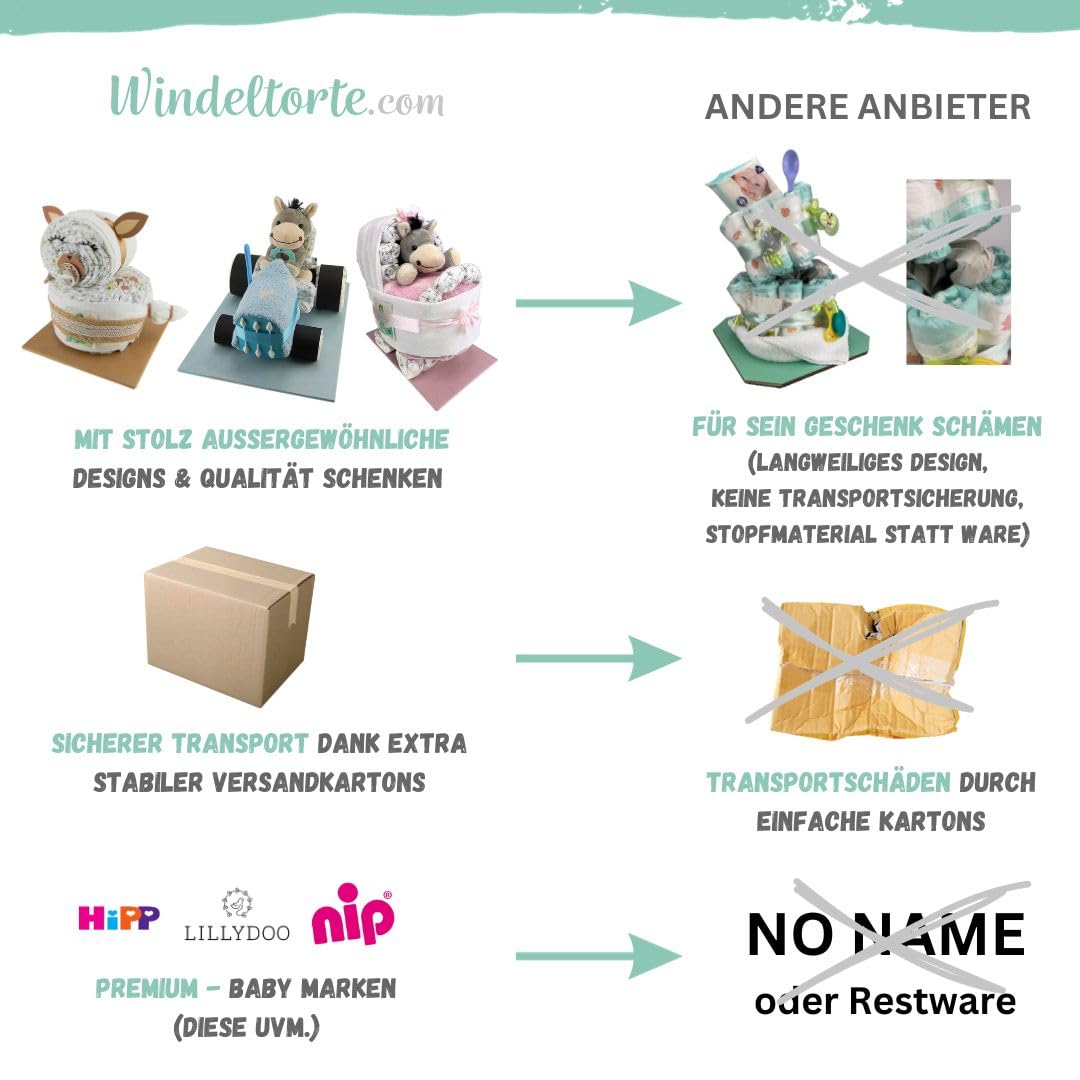 ["SKIN-FRIENDLY PREMIUM DIAPERS – The diaper car for boys & girls & gender-neutral - Unisex in Green contains skin-friendly premium diapers from the brand LILLYDOO in size 3 (13-22 lbs).","HANDMADE IN AUSTRIA – This diaper car is lovingly handmade in the workshop Gmünd (Austria). Every detail is perfectly arranged.","THOUGHTFUL BABY GIFT – High-quality products for baby care are hidden in a lovely race car design. An ideal gift for birth, baptism, or baby shower.","ALL USEABLE – All products in the diaper cake car are items from reputable brands, which can be fully utilized. We do not use seams or adhesives for the production of the diaper cake.","LOTS OF EXTRAS – In the diaper car, in addition to high-quality LILLYDOO diapers, there is also a plush giraffe stuffed animal / toy, a NIP teething toy, two NIP baby spoons, a cotton muslin cloth, and two packs of Dr. Kottas or HiPP BIO tea."]