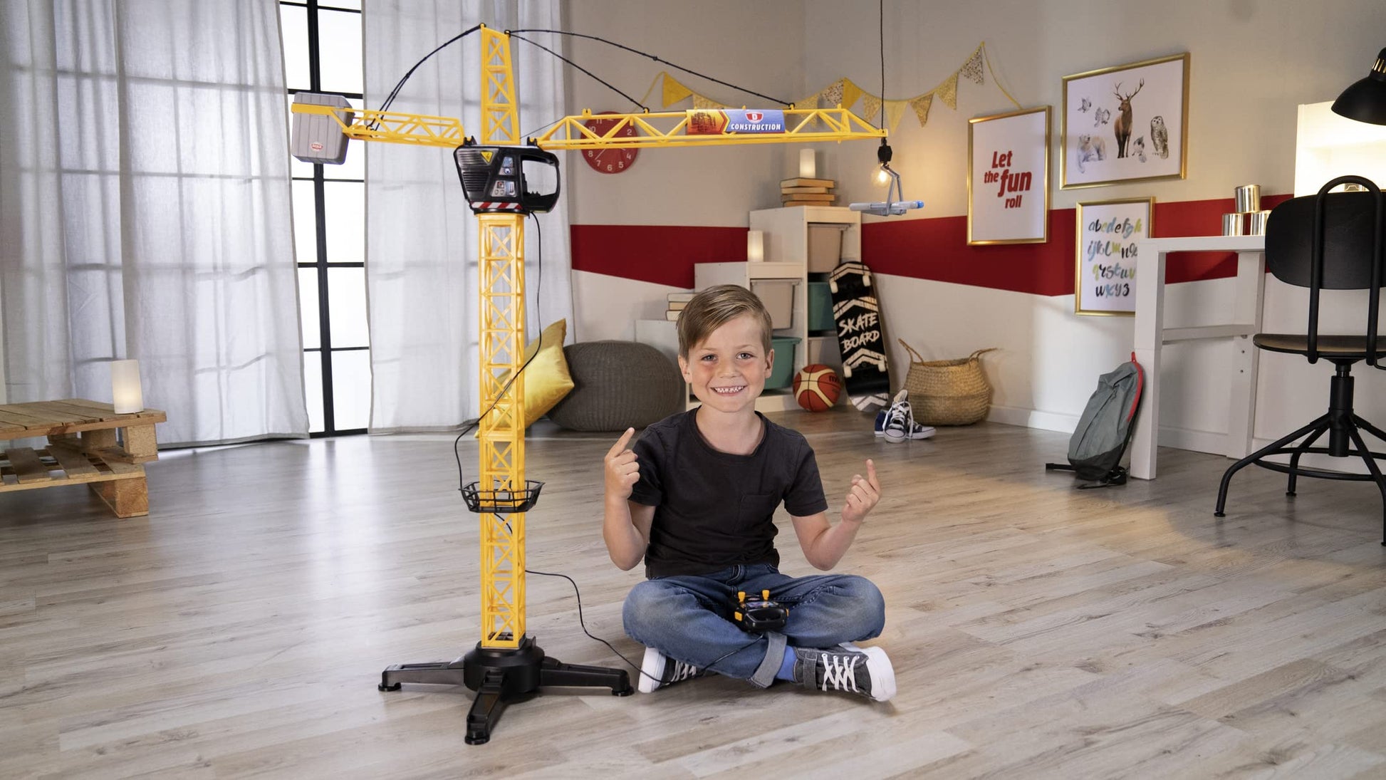 ["A must-have for any construction site - Whether in the playroom or sandbox, diligent builders can use the electric XL crane to move even the largest objects on their construction site.","Airy heights - With a size of 1 meter, the crane reaches far into the sky and can be seen from afar. Its impressive height and bright yellow color make it a real eye-catcher.","Various accessories - What needs to be transported today? In addition to the large bucket, the toy crane also has a cargo lift that can transport small cars high into the air, for example.","With remote control - The wired remote control can be operated intuitively and safely by young crane operators from 3 years old. (requires 4 x AA LR6 batteries, not included).","The fun starts with unpacking - The resource-saving product packaging provides children with a real unboxing experience while generating minimal packaging waste. Ideal transport protection included."]
