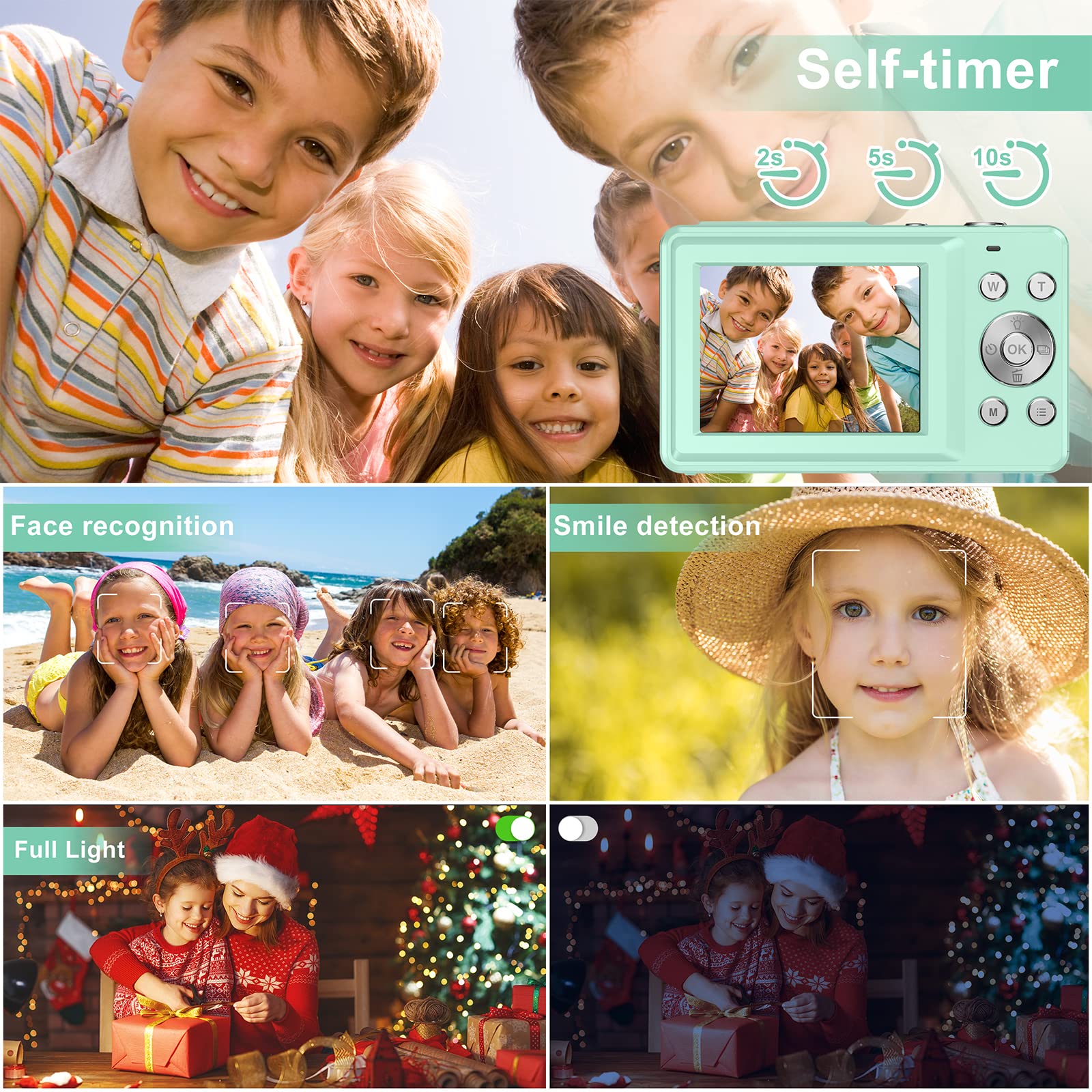 ["【44MP Photos and 1080P Videos】This kids camera can capture 44MP images and 1080P HD videos. It helps you capture and store unforgettable moments. If you are looking for a compact and elegant digital camera, then this camera is the right choice.","【Compact Digital Camera & Easy to Carry】This compact camera is small and lightweight, you can even put it in your pocket without feeling burdened. The camera comes with two batteries so you can replace them anytime. It is very suitable for kids in school, summer camp, or on vacation. With this digital camera for kids, you can capture beautiful moments with friends without taking out your phone.","【Easy to Use and Ideal Choice】This digital camera is designed for photography beginners. The menu navigation is intuitive and complete. Even for young children, it is easy to understand how to use the camera. It is the best choice for kids, teenagers, photography beginners, students, elderly people, boys, and girls.","【16X Zoom and Built-in Flash】This camera supports 16X digital zoom. You can adjust the W/T button to enlarge and reduce images and videos according to the distance and size of the target object to ensure that you can capture more details. The built-in flash in the digital camera helps you take high-quality photos even in low light or dark environments.","【Multiple Functions and Applications】This kids camera features face recognition, smile detection, anti-shake, continuous shooting, timed shooting, timed shutdown, and more. If you have any problems, please send us a message immediately and we will solve your problem within 24 hours."]