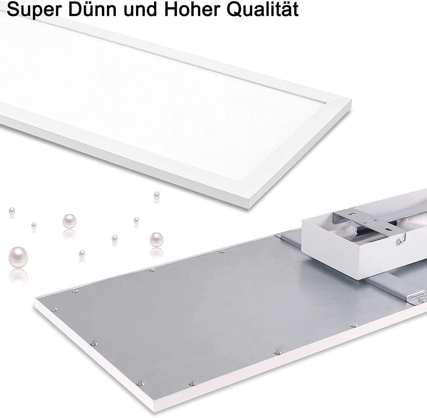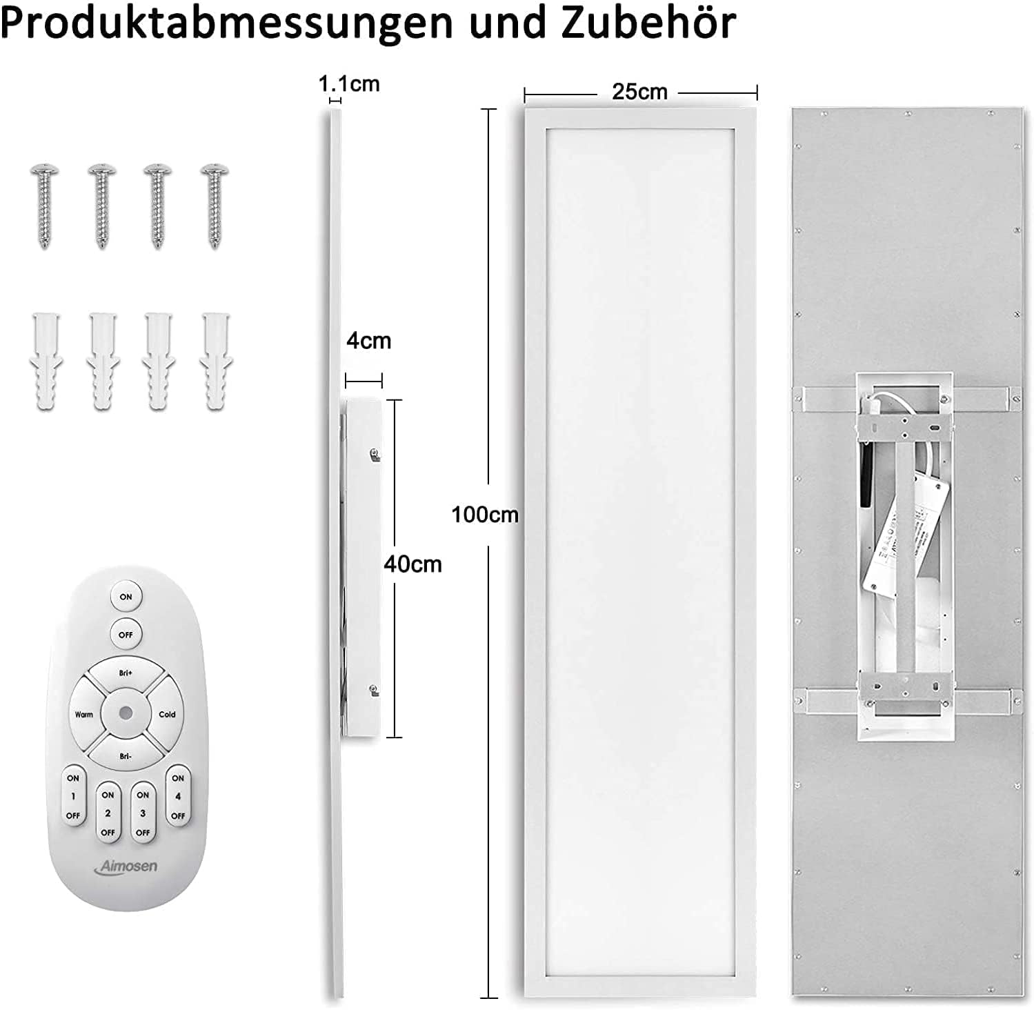 ["Large Ceiling Light - This surface mount panel is perfect for illuminating large spaces harmoniously. Equipped with high quality LED technology, this product is particularly durable and ideal for offices and common rooms. The combination of 2 LED panels is perfect for large living spaces and provides bright and beautiful light in meeting rooms, gyms, and restaurants.","Dimmable and Adjustable Color Temperature - This simple panel allows you to adjust the light temperature according to your preferences. With a spectrum from 2700 Kelvin (warm white) to 6500 Kelvin (daylight white), you can find the right light temperature for any time of day and situation. Adjustable light brightness from 5% to 100%. With the memory function, you can save the last setting of the lamp until you turn it on again.","Energy-saving and Longer Lifespan - Due to the high energy efficiency of our LED panels, you can save up to 90% on energy costs compared to traditional incandescent bulbs. At the same time, the average lifespan is over 50,000 hours.","Intelligent Remote Control Grouping and Reliable Quality - Our LED panels can be grouped and controlled simultaneously via the remote control. This makes them suitable for offices, dining rooms, hallways, and all living areas, such as dining rooms, living rooms, bedrooms, kitchens, and stores.","Ultra-slim and High Quality - Product size 100x25x1.1 cm, product weight: 4 kg. The height of the bracket behind the ceiling light is 4 cm."]