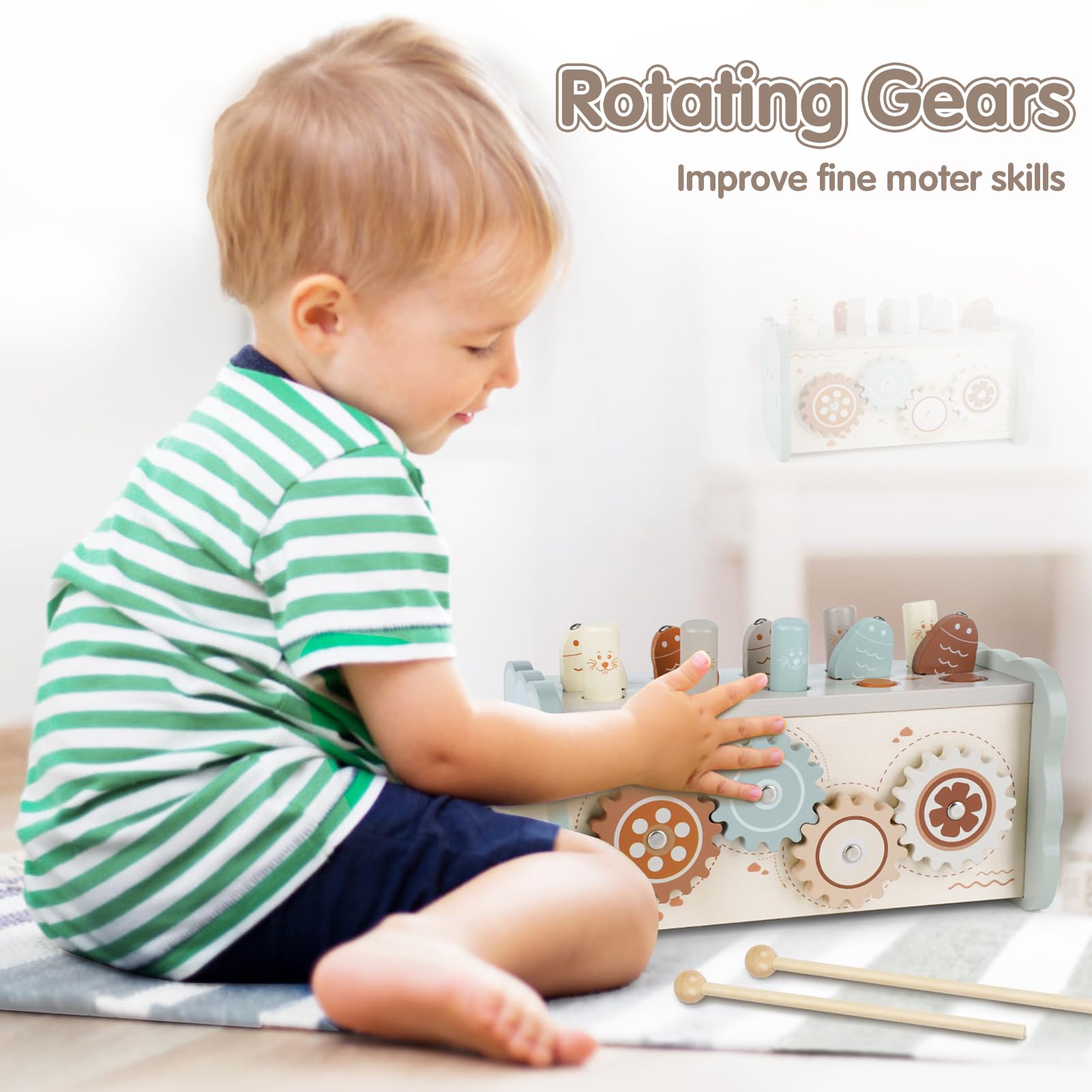 ["【4 IN 1 Montessori Toy】With this interactive toy, your child can play 4-in-1 activities like whack-a-mole, fishing, playing the xylophone, and turning gears. Your child will hardly be able to put down this multifunctional toy.",