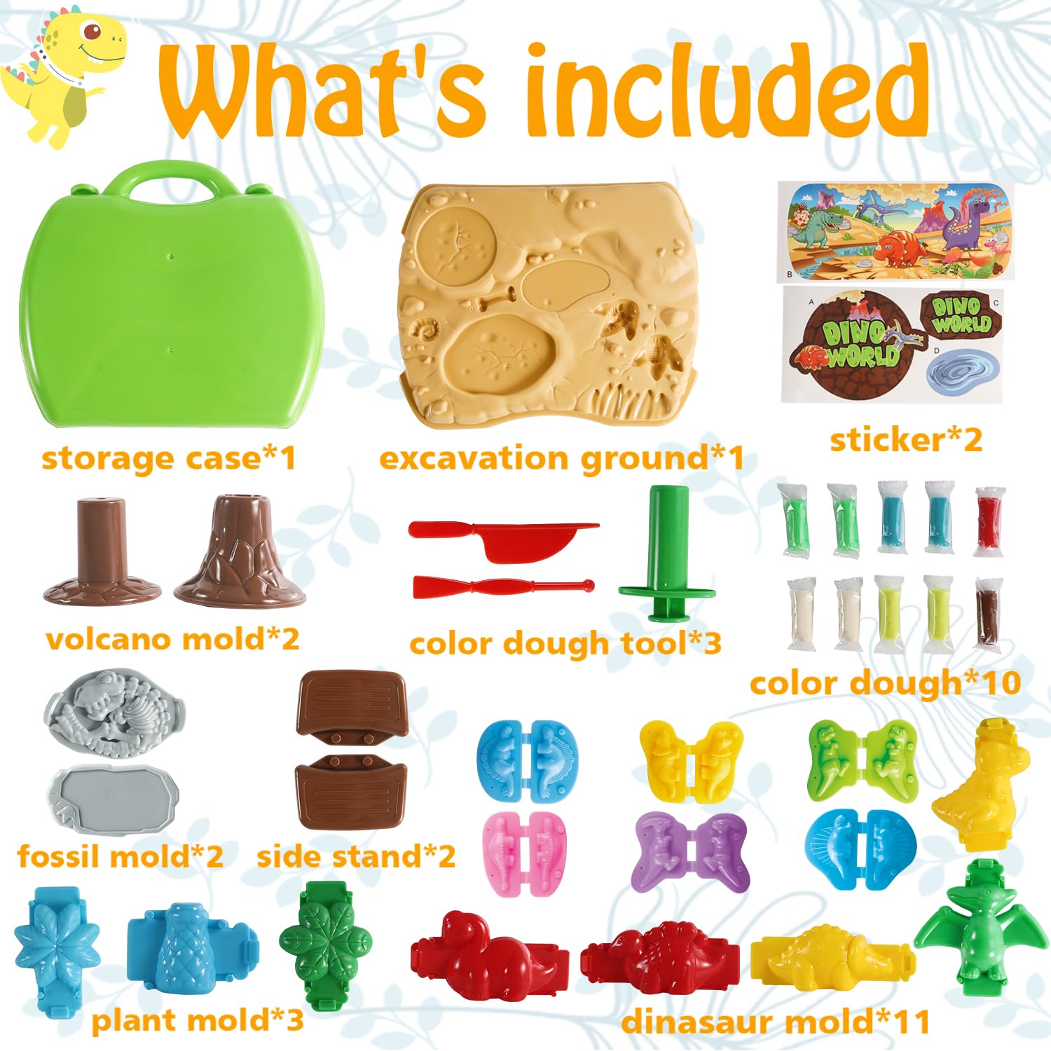 Dinosaur clay set for kids, 37 pieces, Dino clay tools and shapes accessories with volcano and fossils for boys and girls.