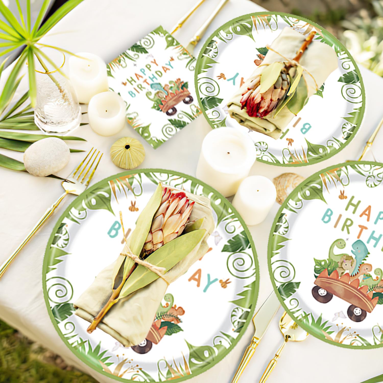 ["đŚăDino Birthday Decoră Dinosaur Party Decor Set: 16 x 9\" Dino Paper Plates, 16 x Dino Cups, 16 x Dino Napkins, 16 x Straws, 1 x Dino Party Tablecloth, 1 x Happy Birthday Banner, 2 x Dino Foil Balloons, 20 x 10\" Balloons, 7 x Cake Decorations, 1 x Roll of Ribbons.","đ´ăHigh-Quality Materială This beautiful Dino Birthday Party Decor tableware set is made of high-quality, heavy-duty paper materials that make the tableware set sturdy, soak-proof, and durable. The party tableware set is 100% food safe, secure, and non-toxic. Foil balloons and latex balloons are made of high-quality materials.","đŚăDinosaur Kids Birthday DecorăThe dinosaur pattern is clear, colorful, and very cute, making it very popular at kids' birthdays. With these vivid patterns and bright colors, they create a festive atmosphere for a dinosaur party kids' birthday, making your dinosaur party kids' birthday memorable and impressive.","đ´ăEnjoy Party and Save Timeă Our Dino Decor Kids Birthday party tableware is both beautiful and functional. You can clean up in minutes after the party, saving you time and effort. You can spend more time with family or friends, providing you with a more pleasant dinosaur party experience.","đŚăApplicable Occasionsă Our Dino Birthday Decor Party tableware set is perfect for boy and girl birthdays, dinosaur birthday parties, kids' birthdays, baby showers, gatherings, school festivals, picnics, suitable for all occasions. Make your Dinosaur Birthday Party livelier and more impressive with our Dinosaur Party tableware set."]