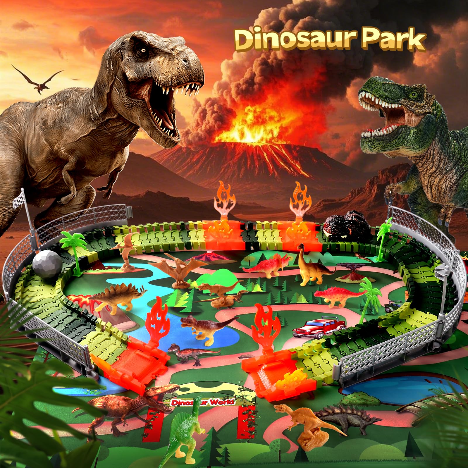 ["Dinosaur Cars Toy for 3+ Years"] Dinosaur Escape - The dinosaur car drives through oscillating flames to simulate a volcano eruption; Dinosaur Land - With 10 mini dinosaur figures and play mats with dinosaurs, volcanoes, rivers, and forests, kids can build their own dinosaur world; Realistic race track - The fences are set up and the challenge of pushing the ball with the small car can begin. Get ready, little racers!