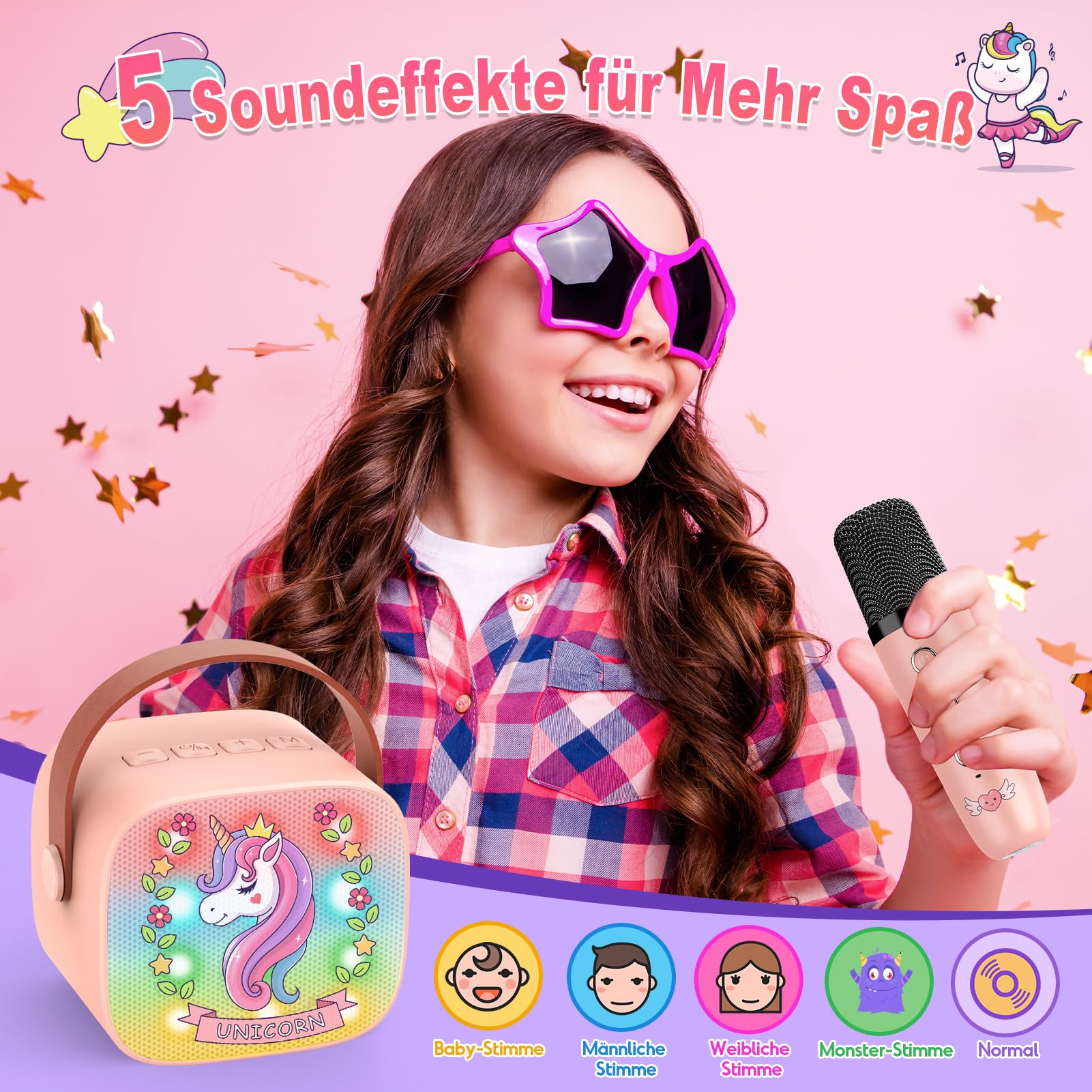["Unicorn Karaoke Microphone SetThis karaoke set with 2 microphones is equipped with high-quality speakers and a DSP noise cancellation chip, which perfectly reproduces the real sound without noise, allowing you to enjoy HiFi sound at home. The colorful LED lights change in rhythm with the music, creating a cheerful KTV atmosphere.","Easy to ConnectThis karaoke machine features a built-in Bluetooth 5.3 chip for fast connection speed and stable transmission. It also supports TF card, USB cable, and AUX connection. It can easily be connected to a variety of devices such as mobile phones, iPads, tablets, and computers.","Interesting Voice Change EffectsThe microphone has 4 amazing voice change effects: kid voice, man voice, woman voice, and monster voice. This way, you can have even more fun when singing and speaking into the microphone. It can also suppress the original sound so you can practice your singing with musical accompaniment.","Lightweight & PortableThis karaoke set weighs only 540 grams. The stereo system also comes with a leather handle, allowing you to take it anywhere. It is ideal for family outings, outdoor events, and any place where celebrations are happening. Any place can be your stage!","Ideal Gift for ChildrenA nice packaging and a cute unicorn design make it the perfect gift for a child's birthday, Christmas, or any other celebration! With this Bluetooth karaoke, you can enjoy music with your children, family, and friends! If you have any questions, please don't hesitate to contact us."]