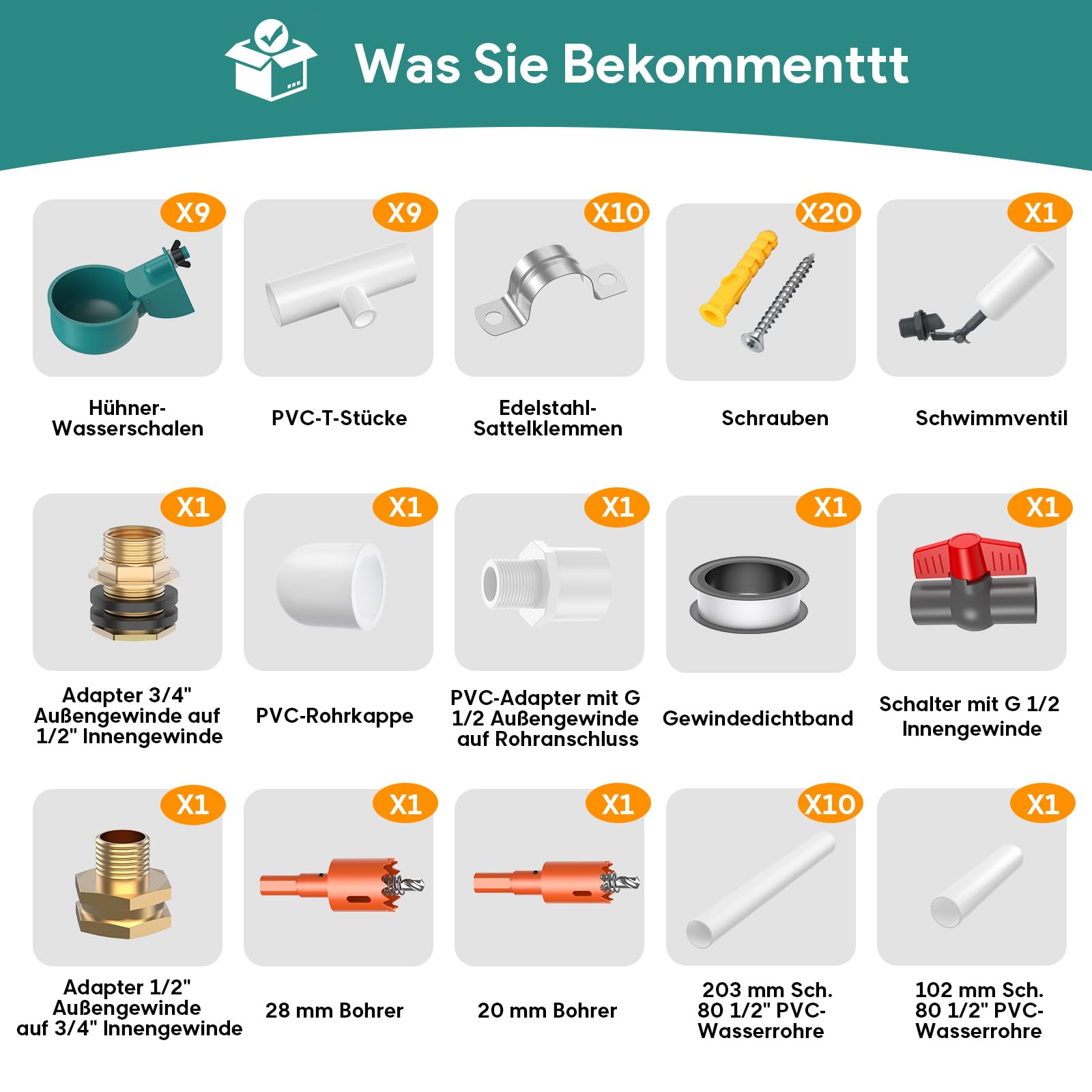 ["Automatic Chicken Watering System - When the water in the bucket reaches a certain height, the valve closes automatically. The chicken cups fill up automatically without having to worry about water overflowing. Once the water is connected, the chickens have a continuous supply of fresh, clean water. Your chickens can also be well taken care of during longer trips.", "Complete Accessories and Easy Installation - Includes 9 automatic drinking cups, 9 special T-pieces, 1 ball valve, 10 pipe clamps, 1 PVC pipe plug, waterproof tape, copper and PVC adapters, 10 PVC pipes (200mm) and 1 PVC pipe (100mm), as well as 2 hole saws. It can be flexibly installed to support different DIY chicken coops. All you need is a bucket to create an efficient poultry water system.", "Leak-proof Design - All parts can be securely connected together so you don't have to worry about water leaks; The waterproof tape in the set provides an additional protective layer for system safety and ensures a steady water supply.", "Sturdy Material - Not a cheap disposable product, it meets the requirements for years of use. Our automatic poultry water system is made of high-quality PVC, which is thicker than other chicken water systems; It is characterized by safety, cold and heat resistance, toughness, aging resistance, etc.", "Suitable for Various Poultry Species - Suitable for chickens, ducks, turkeys, quails, and even rabbits. Choose us to experience the fun of DIY building your own chicken water system."]