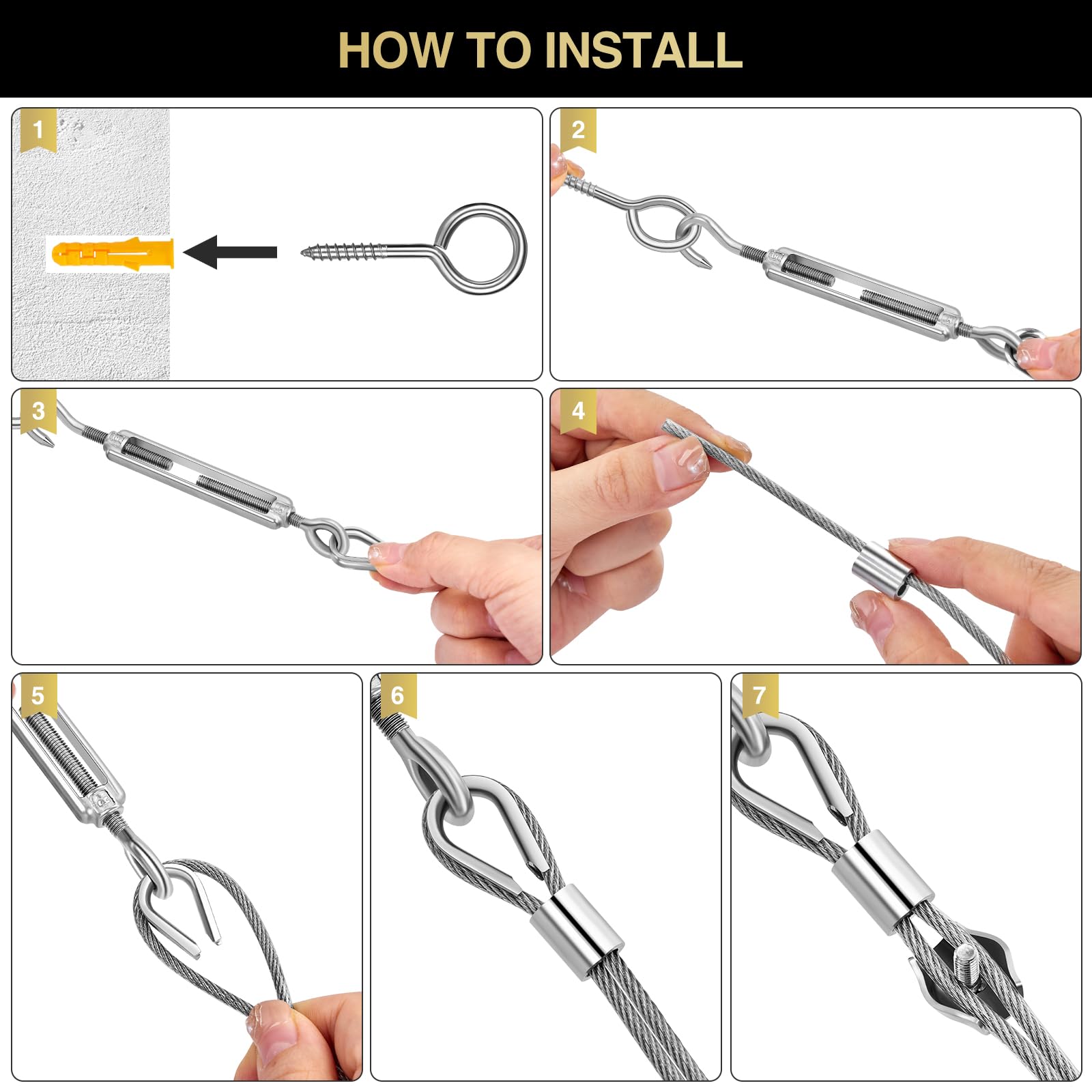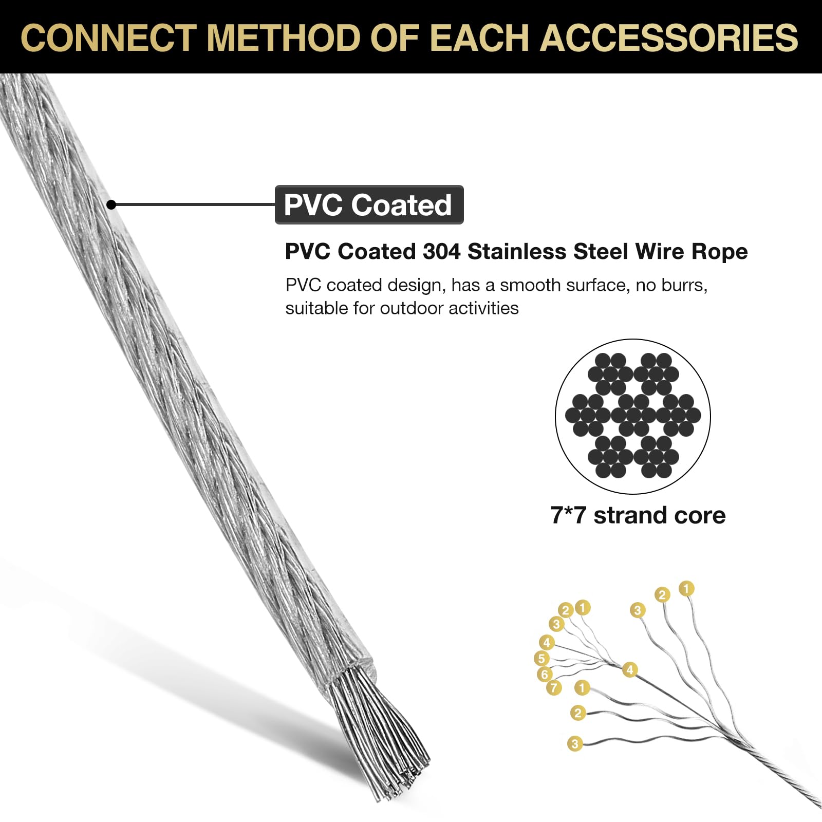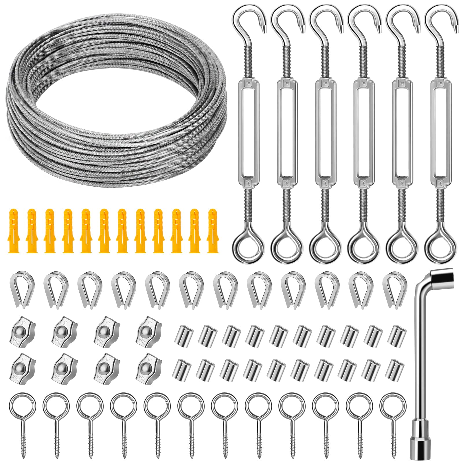 ["【HIGH QUALITY MATERIAL】: The wire rope is made of durable 304 stainless steel with PVC coated wire rope 7*7-strand core structure, the plastic-coated wire rope is soft enough, the surface of the wire rope is smooth and burr-free, waterproof, rust and corrosion resistant, Seiko quality, sturdy and durable","【EASY INSTALLATION】: Equipped with all necessary tools and components, including turnbuckles, expansion sleeve bolts, wire rope clips, thimbles, eye screws, crimp sleeves, and plastic anchors, with manual, complete accessories, easy and convenient","【WIDELY USED】: The garden wire kit is suitable for a variety of projects, such as sheds, clotheslines, garden wire for climbing plants, shading, grapevines trellis, laundry drying, lifting, fencing, installing outdoor equipment or DIY art installations, umbrella hardware, lamp hanging, marine and industrial rigging, homemade railings and more","【FULL SET OF TOOLS】: Includes 20 meters stainless steel wire rope (2mm), 6 pieces M4 turnbuckles, 8 pieces M3 wire rope, 20 pieces M2 aluminum crimp sleeves, 12 pieces M2 stainless steel thimbles, 12 pieces eye screws, 12 pieces expansion sleeve bolts, 1 piece elbow wrench, no additional parts required","【SAFETY & RELIABILITY】: Stainless steel wire rope for strength and durability, PVC coated stainless steel wire is more heat and sun resistant than vinyl coating, wire rope sleeves reduce rope friction during installation and protect the rope for longer rope life. Aluminum sleeve, tension nut single clamp double clamping for tightening the wire rope adds a certain level of safety"]