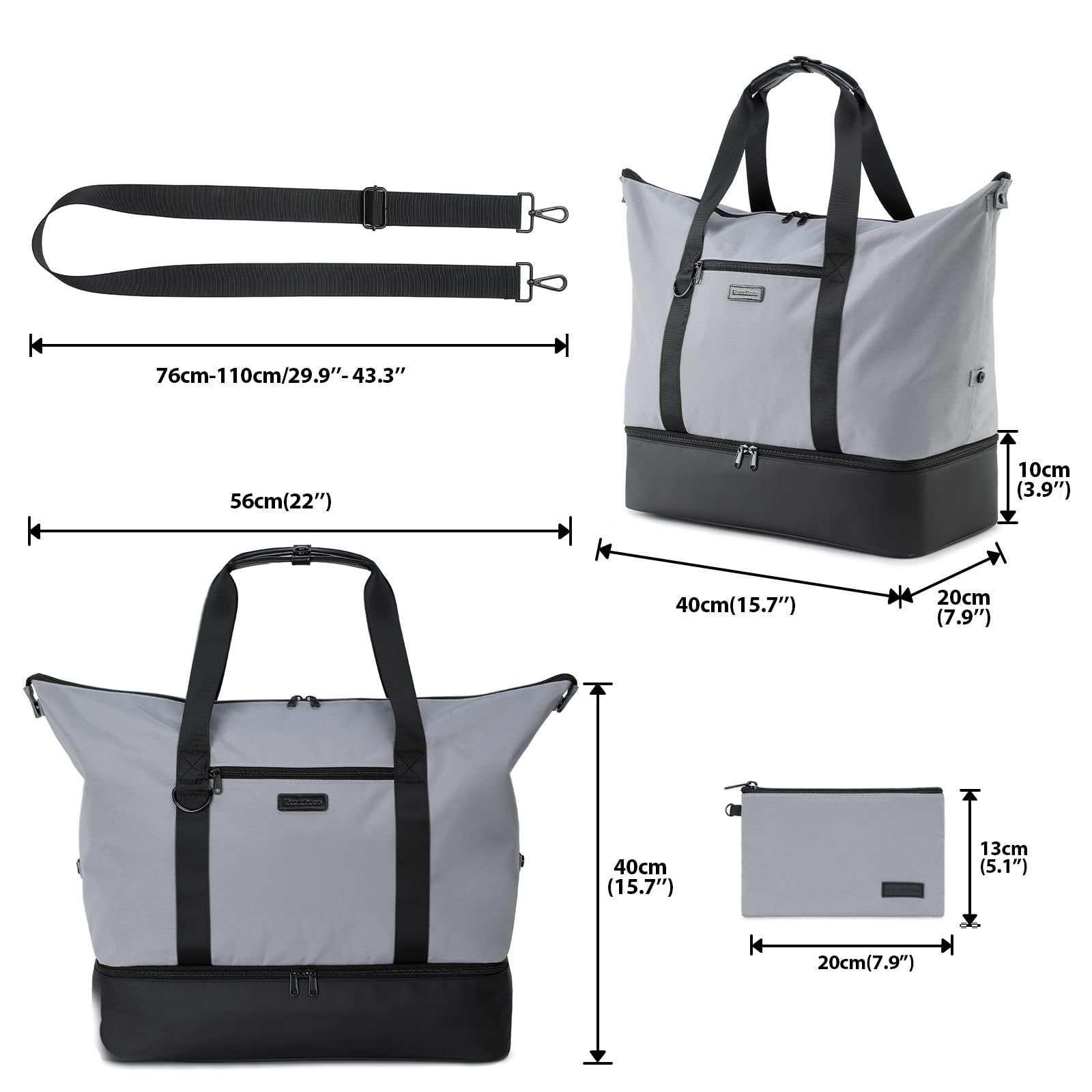 Well Organized: 11 compartments in total, 1 main compartment, 2 exterior pockets, 6 interior pockets, 1 zip pocket, 1 shoe compartment, and wet pocket. The compartment layout is convenient and the separate shoe compartment keeps shoes away from clothing. (Package included: Duffle bag x1, Shoulder strap x1, Zip pocket x1).