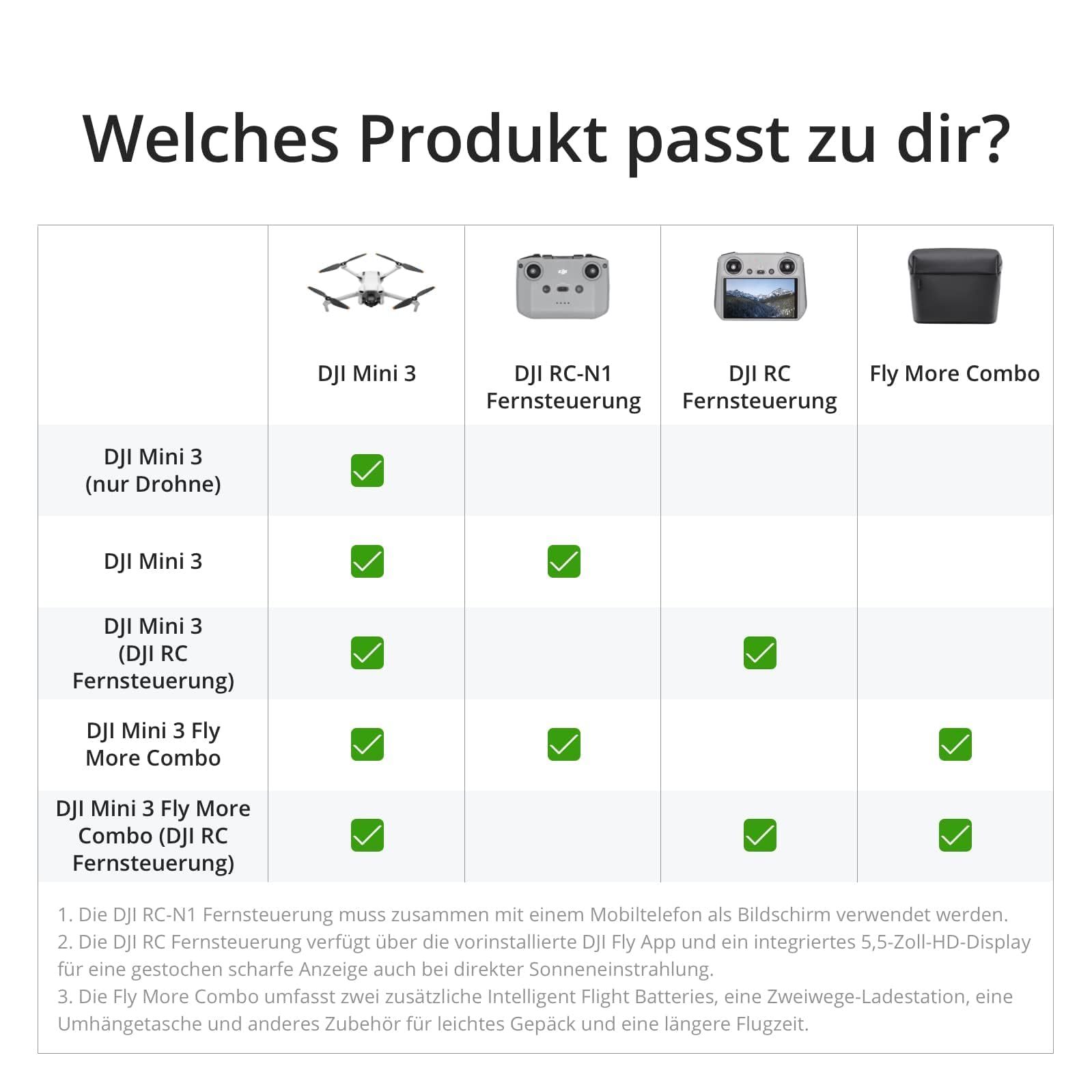 ["Ultra-light under 249g (C0) for spontaneous flying: This drone is compact, quiet, and safe to launch. As a 4K camera drone, it captures travels, walks, and family moments in detail. Please observe local regulations.","With 4K UHD and Dual Native ISO, the camera drone delivers clear aerial shots with a wide dynamic range. Compact and versatile, the DJI Mini 3 is ideal for vlogs, city trips, and nature tours – less post-processing, more creative flow.","The DJI drone rotates the camera by 90° for true portrait mode – perfect for Reels & Stories. With the Mini drone, you can fully capture tall subjects and easily share clips via mobile – social media posts are quick and professional.","Up to 38 minutes of flight time give you room for multiple routes, subjects, and perspectives. The DJI Mini 3 drone launches quickly, stays stable, and inspires drone enthusiasts who want to film on the go flexibly without constant battery changes.","Includes the new DJI RC remote control with integrated DJI Fly App and 5.5" HD display for sharp images even in direct sunlight.","38 km/h wind resistance (Level 5) & mechanical 3-axis gimbal – This drone remains stable on the coast as well as in the mountains and delivers smooth 4K clips. As a 4K camera drone with brushless motors, the Mini 3 starts powerfully – even up to about 4,000 m altitude.","Usable in categories A1/A3; usually without examination. The DJI drone for beginners is quickly ready to start and grows with your demands. Please always check local rules. DJI camera drones stand for reliable quality.","HD live transmission up to 10 km helps in selecting motifs in the great outdoors. Being a nimble quadcopter, it is easy to operate; the Mini drone for adults appeals to travelers, content creators, and outdoor enthusiasts who want to be easily on the go.","GPS-based return, precise hovering, and one-button start/landing make entry easier. The Mini camera drone guides you step by step via app tutorial; a camera drone that intelligently combines safety and comfort.","Photos/videos via QuickTransfer directly to your smartphone: Up to 25 MB/s nearby, even without remote control. The DJI Mini drone saves time in the workflow; with DJI Mini 3, you can share results immediately – ideal for weekend trips and quick edits on the go."]