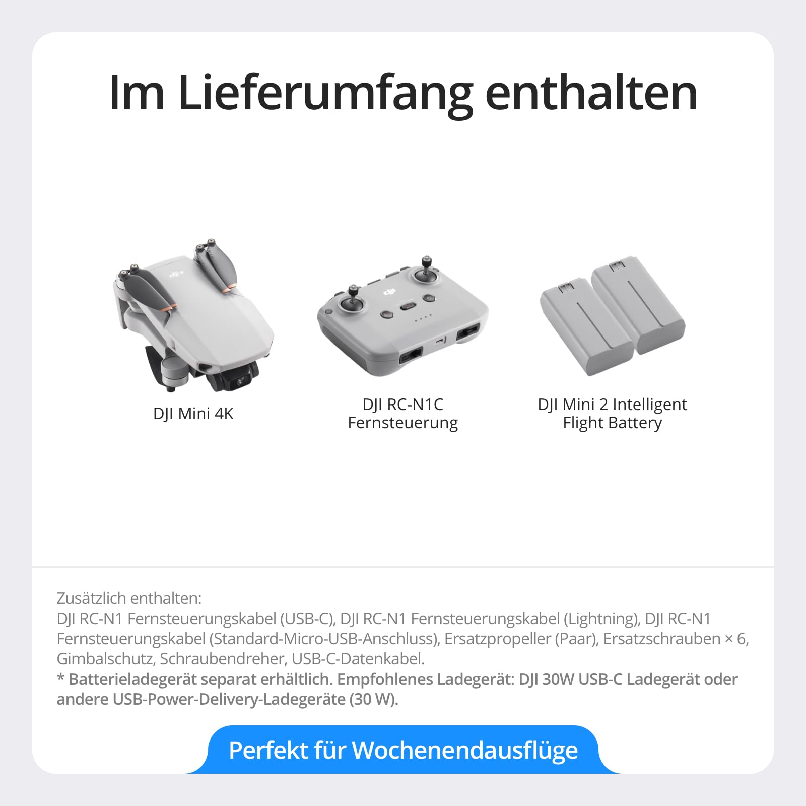 "Includes DJI Mini 4K, 2 batteries, and everything you need for simple and epic 4K flights. Ideal for short trips and weekend getaways."
