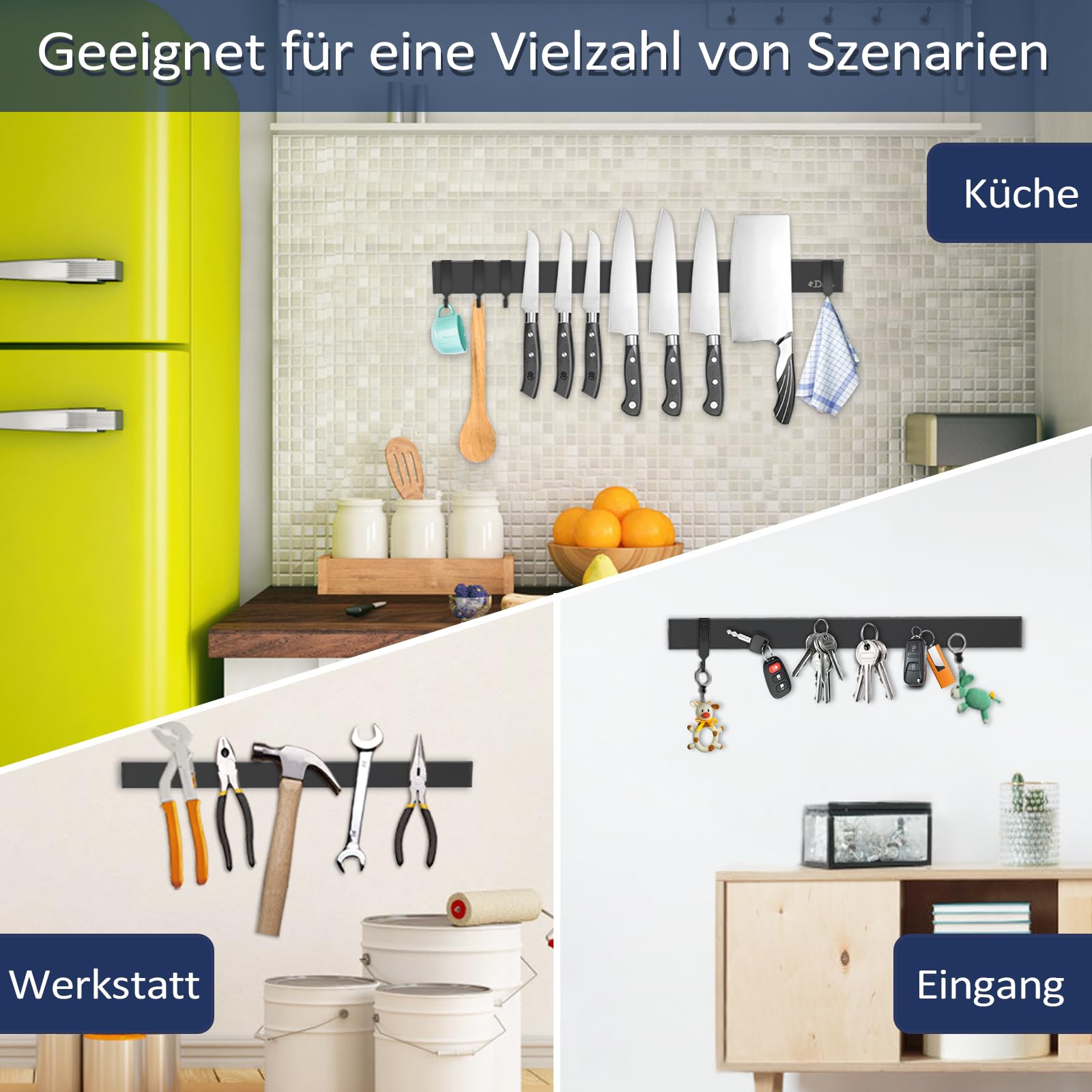 ["MULTIFUNCTIONAL & 2 INSTALLATION OPTIONS: We have added a hook design to this magnetic knife strip, not only for attaching but also for hanging. You can choose between self-adhesive tape (no drilling) or screw mounting to keep your kitchen, garage, workshop, etc. neat and tidy. If you need more hooks, you can purchase them at the Dmore store or contact us.",