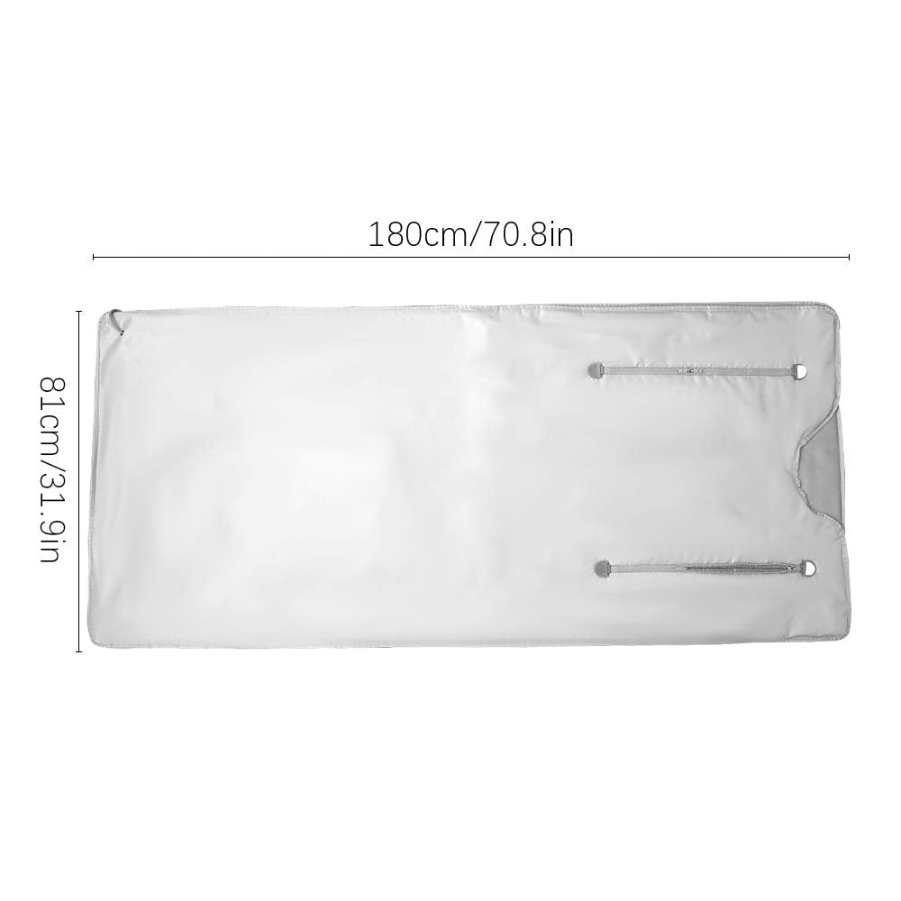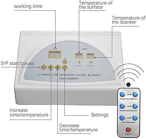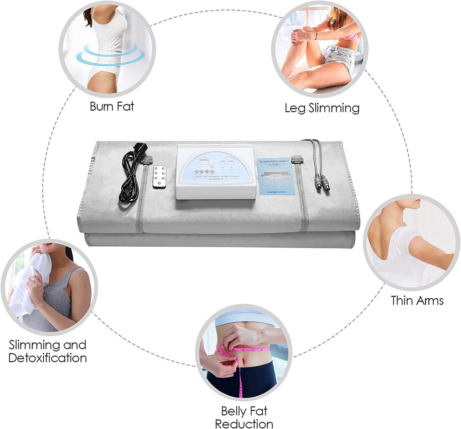 ["Intelligent temperature control. Temperature range: 77 °F – 176 °F, duration: 15 – 60 minutes, supports remote control without battery and host panel control methods. Temperature and time of coverage and cover can be individually adjusted.","SANITARY_FACILITY","Multiple safety protection Safety protection: If the sauna blanket exhibits abnormal conditions such as overvoltage, overload, leakage, etc., the switch will be disconnected within 0.01 seconds and will no longer function","Operating principle: Infrared rays have strong penetration power, can easily penetrate directly into skin cells, make your whole body feel warm from the inside out, effectively expand blood vessels and pores, accelerate blood circulation, increase metabolism, and eliminate toxins and metabolic waste.“"]