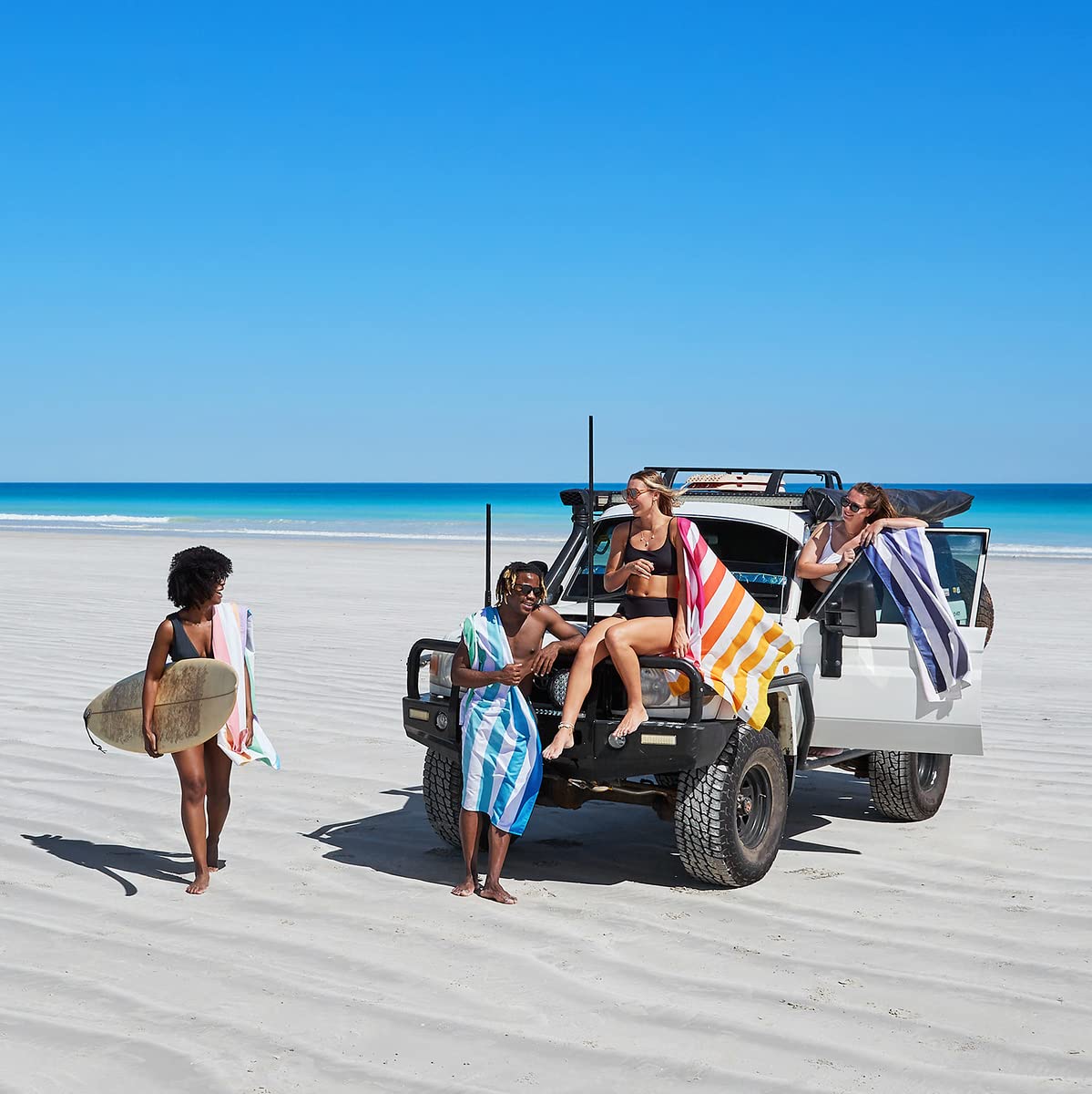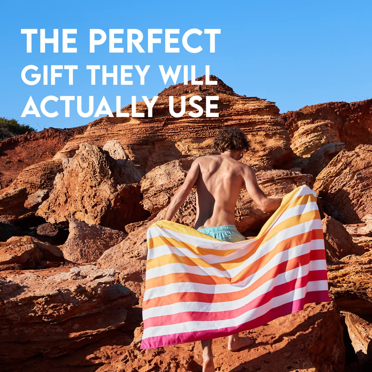 ["PERFECT FOR THE BEACH - Two great designs to choose from after a swim in the water: the two-tone Cabana or the colorful summer design. NO SAND ON THE TOWEL - The ultimate beach companion, as sand does not stick to the towel thanks to the high-quality material and can be easily shaken off. More material for the sandcastle. 100% RECYCLED MATERIAL - Our towels are made from 100% recycled material, which consists of a mix of 83% polyester and 17% polyamide. They are not only extremely soft and comfortable to touch, but also environmentally friendly. QUICK DRYING & SUPER ABSORBENT - Drying off is quick and easy, as the microfibers quickly absorb water. Our beach towel dries 3x faster than conventional cotton towels and remains free from unpleasant, musty odors. IDEAL SIZES - Choose the size that suits you best. The extra-large towel (78x35"/200x90cm) is perfect for sunbathing without sand on your body, while the large towel (63x35"/160x90cm) is ideal for wrapping yourself up after a swim."]