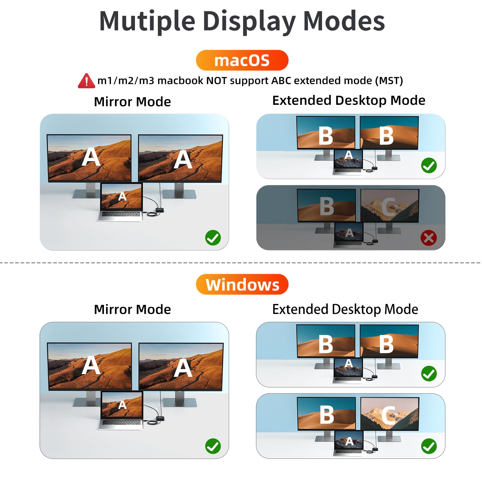 "This USB-C hub only supports mirror mode for MAC, not extended mode for MAC. Dual 4K60 USB C Docking Station: This 60 cm USB C hub features 2 HDMI ports that support dual monitors up to 4K@60Hz output, 100W PD for fast charging, 2 USB A 3.0 ports, and a USB C 3.0 for fast data transfer. This USB C Hub HDMI optimizes device output capacity and provides a simple but sufficient solution for lack of ports in places like home theaters, live gaming, and office meetings. 4K60 Crystal Clear Visual Impact: The USB C HDMI adapter supports up to 4K@60Hz simultaneously when the laptop supports DP 1.4, delivering smooth and realistic video/image playback, perfect for presentations, games, and home theaters. Note: Only 4K@30Hz output if your devices only support DP 1.2. Long Cable Docking Station USB C: Upgraded 60 cm USB C Hub 4K 60Hz meets your requirements for a long cable docking station with 2 HDMI ports, allowing you to use it over long distances for PC, computers, and TVs. This USB C to HDMI adapter is compatible with Windows 7 or higher, Linux, MacOS 10.3 or higher. 100W PD Charging: Our HDMI docking station with 2 monitors features a 100W PD fast charging port, providing up to 80W continuous power for the USB-C device, ideal for MacBook Air/Pro and similar products. Note: The PD USB C port does not have data transfer function. 5 Gbit/s High-Speed Data Transfer: This USB C Hub 2 HDMI includes 2 USB-A ports with a transfer speed of up to 5 Gbit/s and power supply of 5v@0.9a (not recommended for charging purposes). HD photos, videos, and file transfers can be done in seconds."