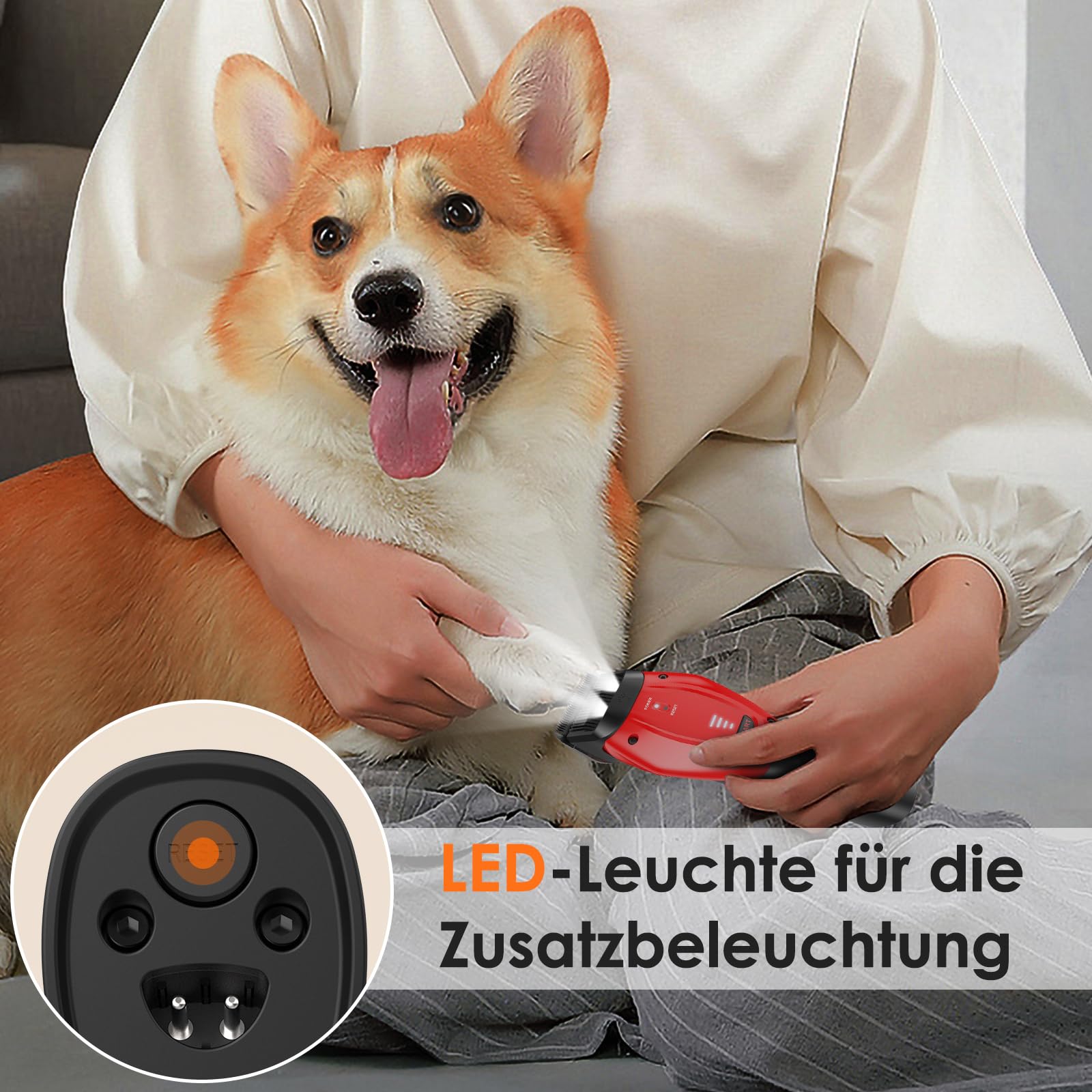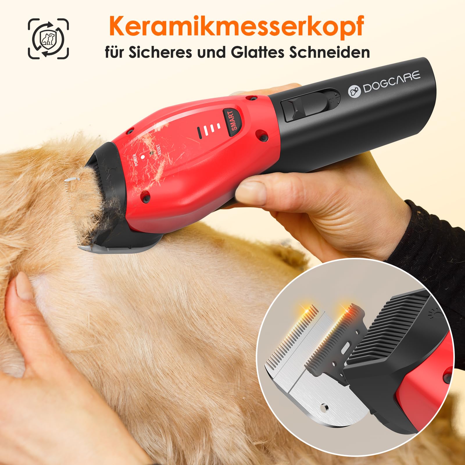 ["Intelligent Adaptation: The DOGCARE dog grooming machine automatically adjusts to the hardness and length of the animal hair, ensuring optimal cutting speed and power. Ideal for pet owners who want professional grooming at home","Recommended by professionals: Recommended by professional groomers, our grooming machine offers the precision and quality expected from a salon, perfect for home use as well as small pet grooming shops","Protection against overheating: With the integrated overheating protection technology of the DOG CARE dog clipper, the risk of skin burns in your pet is avoided. Safety is a top priority for all those who perform regular grooming sessions","Silent and Soothing: Our dog grooming machine works extremely quietly, keeping even the most nervous pets calm during the cutting process. A must-have for pet owners who value stress-free trimming","Powerful Drive: This powerful dog hair clipper cuts quickly and cleanly without pulling on the hair. Three different power levels make it versatile for any type of fur","Lighting for Precision: The unique design lighting of the DOGCARE clipper increases visibility and makes precise cutting easier, especially suitable for dark or hard-to-reach areas","Interchangeable head: Our dog grooming machine can be easily converted to a MAGICLIP head at any time, providing additional protection against overheating and ideal for long grooming sessions","Long-lasting battery life: With one battery charge, the DOGCARE clipper can be operated for up to 180 minutes, meaning you can groom up to six dogs in a row without having to recharge - ideal for multi-dog owners or small grooming studios"]
