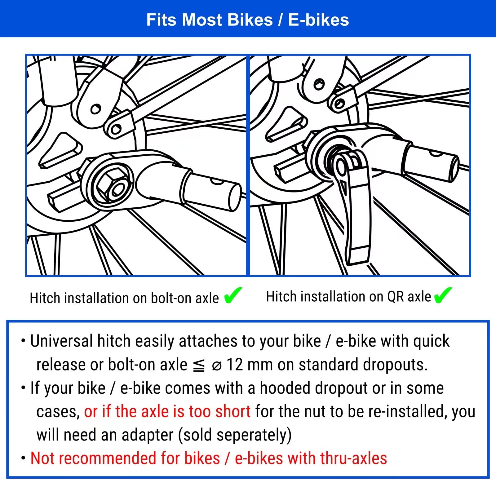 "The universal coupling fits most bikes/E-bikes between 24 inches + 29 inches with quick release or bolted axles. Can be folded flat for easy storage and transport."