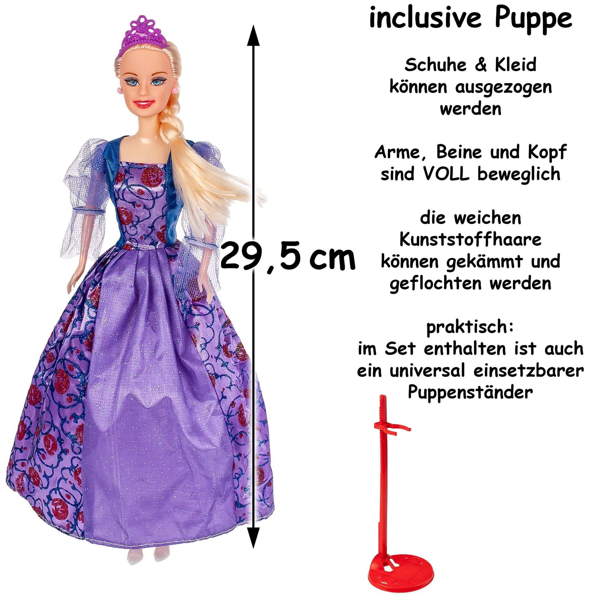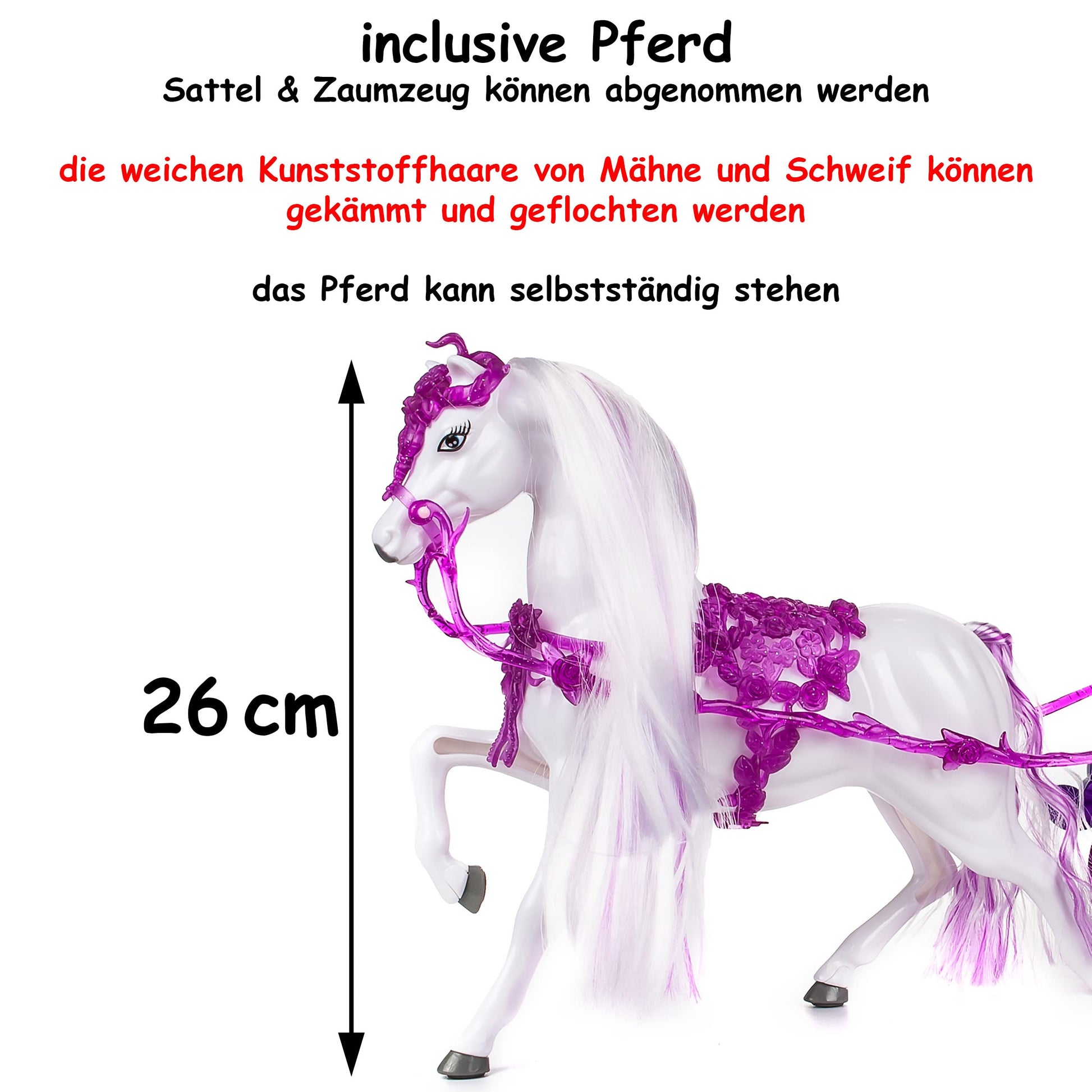 "Great playset: a fairy tale & dream for girls ____ Horse carriage with white Shetland Horse and princess doll ___ with beautiful glitter & shimmer effects __ Color: purple / white ______ the set is suitable for example for Barbie dolls - Steffi Love - Lol Surprise ____ and many other toy dolls or stuffed animals ( ideal for 8 to 13 inches )"