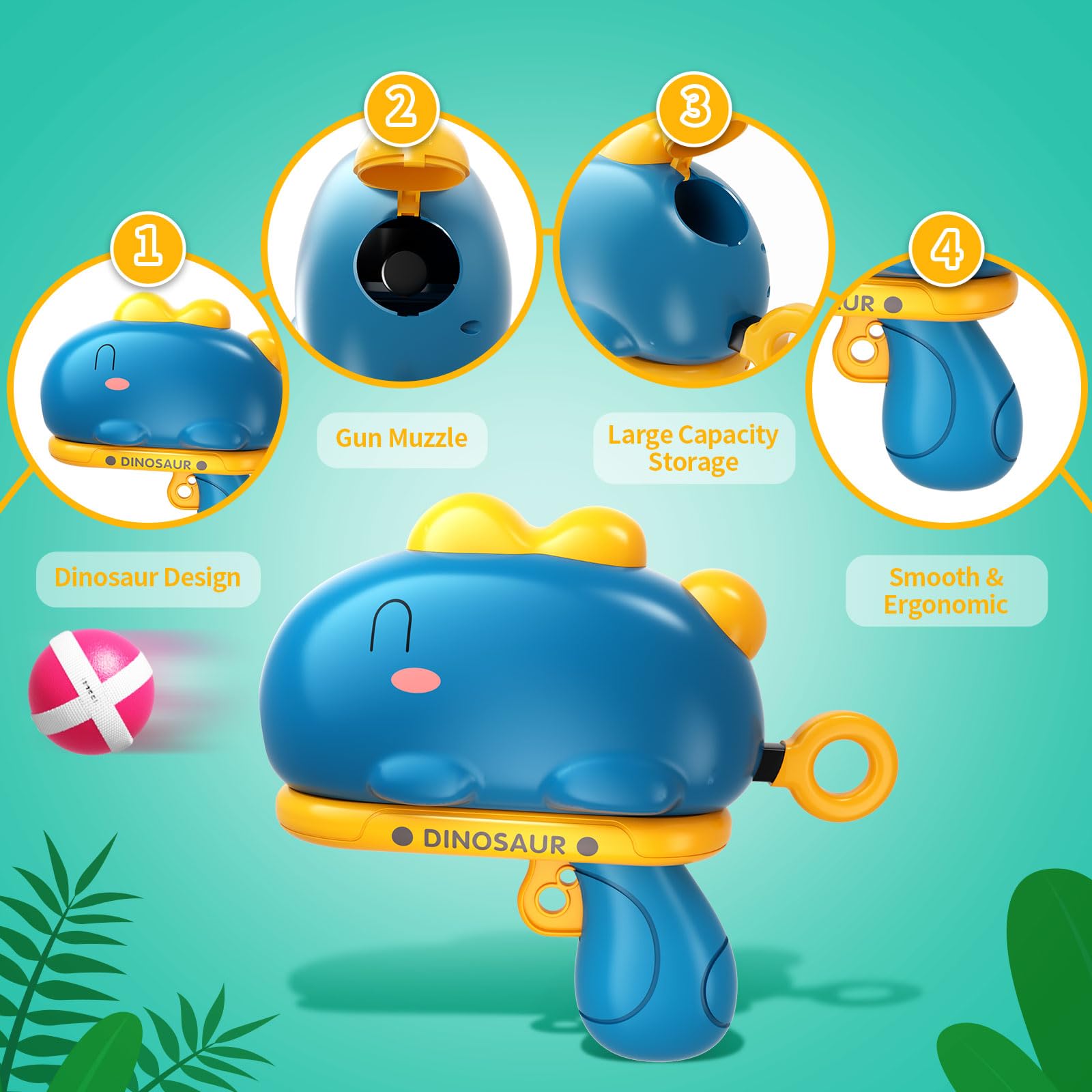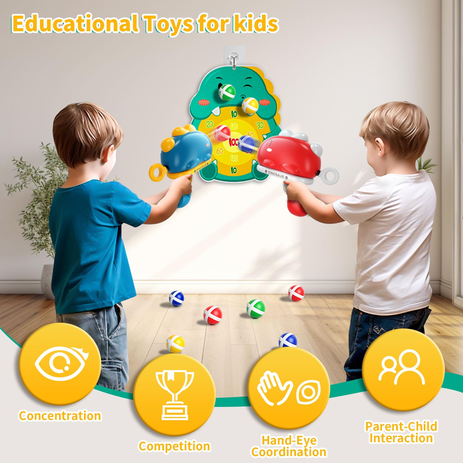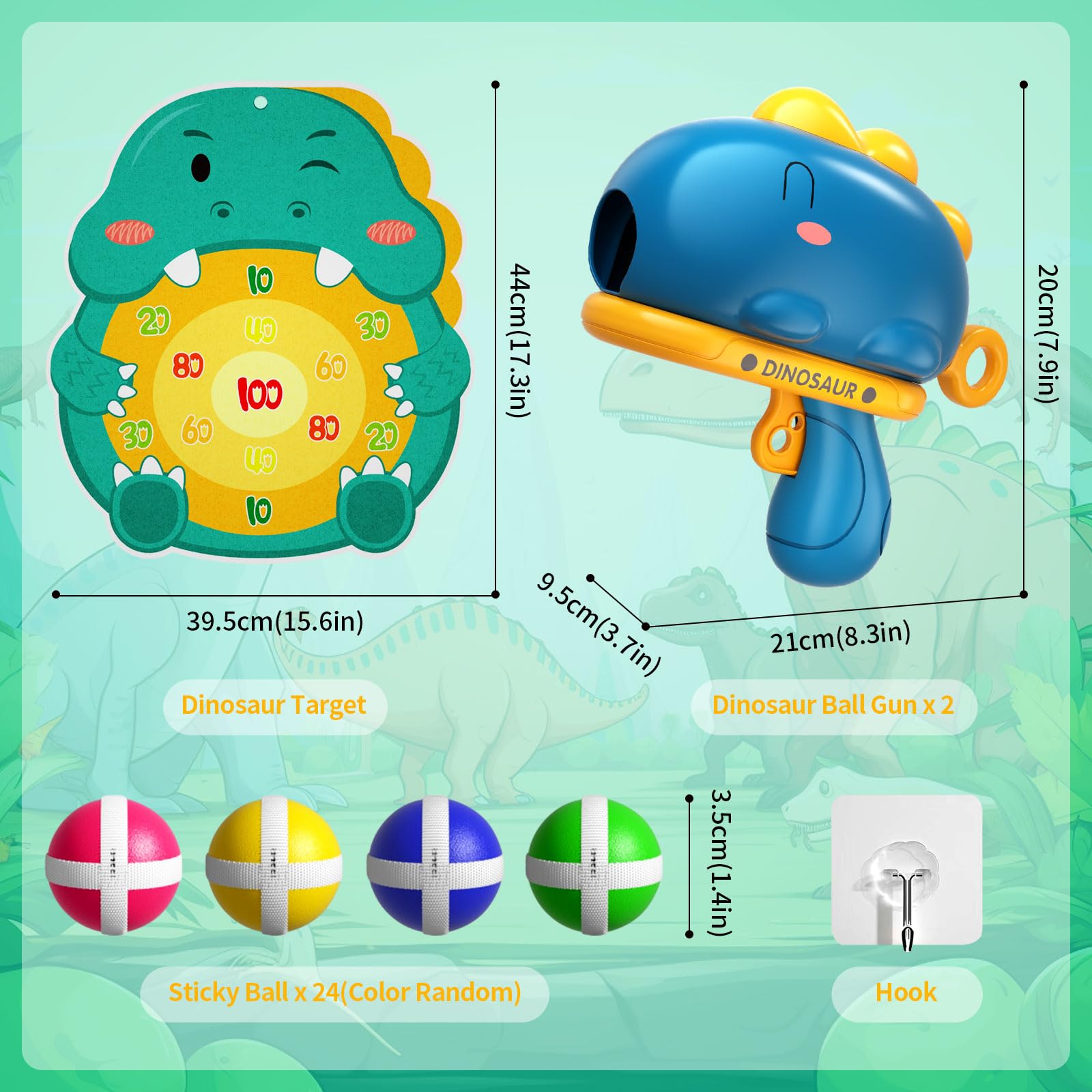 ["Dinosaur Dartboard for Kids: This dinosaur shooting toy features a cute cartoon dinosaur design with 1 dinosaur launcher, 1 dinosaur dartboard, 12 sticky balls (random color), and 1 hook. Your child can enjoy a fun shooting game with friends, classmates, and family in the living room, at a party, on the lawn, or in the backyard.","Two ways to play: Our dinosaur sticky ball dartboard has two ways to play, children can shoot the darts with the gun to feel the excitement of shooting or throw the ball with their hands to practice accuracy and hand-eye coordination.","High quality material: Our sticky ball launcher toys are made of high-quality ABS material and the dinosaur sticky ball dartboard is made of soft, durable fabric that is durable and sticky. The lightweight sticky plastic balls will not harm your children or damage walls, so you can rest assured.","Easy to use: Our dinosaur guns are easy to use and require no assembly. The dinosaur dartboard has a foldable and portable design, making it easy to hang on a wall or tree. Simply place the sticky ball in the cannon, pull the dinosaur's tail, aim at the target, and press the trigger to shoot.","Perfect gift for boys and girls: Our dinosaur catapult cannon is suitable for both boys and girls. If you are looking for a gift for a child aged 4-10, this dinosaur sticky ball shooter is a fun and unique gift, great for children's days, birthday parties, family gatherings, and outdoor events."]