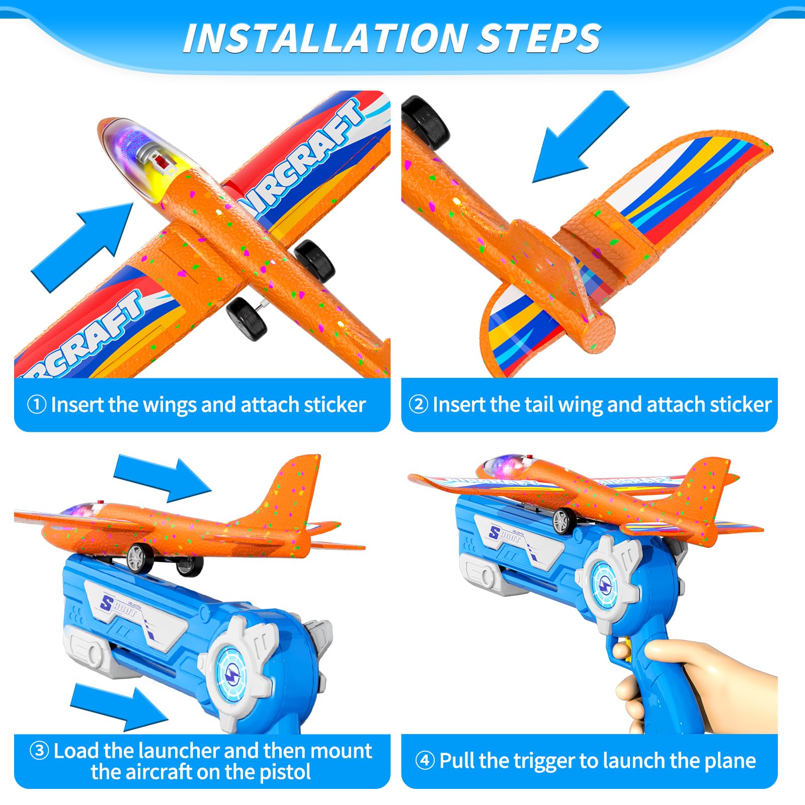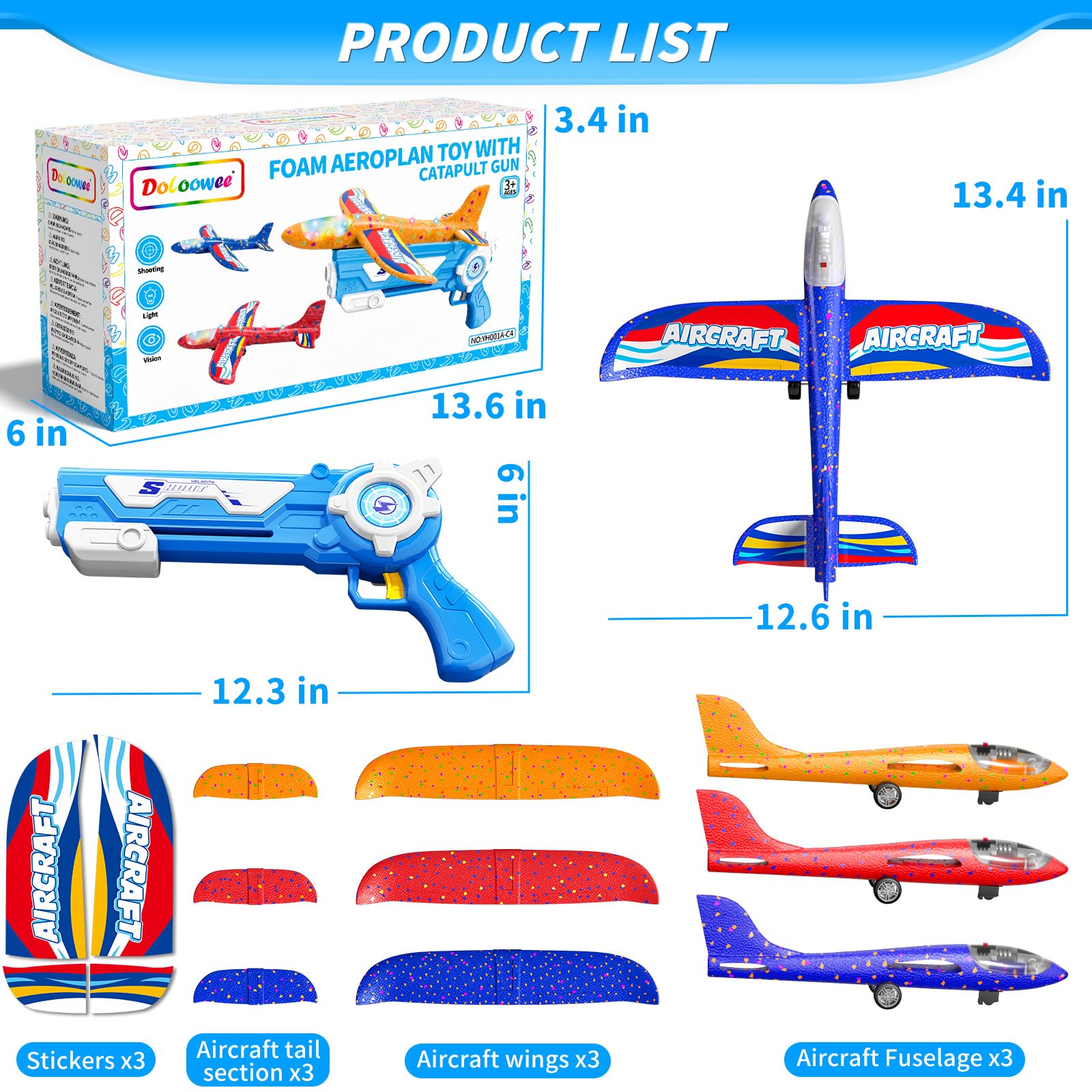 ["UPGRADE 3 PACK AIRPLANE TOYS - The glider toy comes with 3 different colored foam glider planes and 1 airplane launcher. Throw the plane by hand or fly it with the launcher. Kids can enjoy the visual effect of the gliding plane and develop their hand-eye coordination, observation, and sense of direction.","Two Flight Modes of the Foam Plane - By the forward and reverse installation mode of the tail, you can also achieve different types of straight flight or turning. Glider Mode: The plane glides straight after takeoff; Circle Mode: The plane automatically turns around and flies back after takeoff.","LONG FLIGHT DISTANCE - can be thrown by hand or played with the launcher, the toy plane can soar up to 15 meters, providing kids with more playing options. Perfect for children to play with friends and enjoy hours of outdoor fun.","EASY TO OPERATE - 1. Insert wings. 2. Insert the tail. 3. Attach stickers. 4. Attach the plane to the toy gun. 5. Pull the trigger and the glider takes off. Equipped with colorful LED lights, kids can also enjoy the flying toy at night.","SAFE MATERIAL - The flying plane is made of molded foam that is safe and flexible, not hurting your child's hands or feet, with the benefits of lightweight, impact resistance, good flexibility, easy portability, and powerful free flight."]