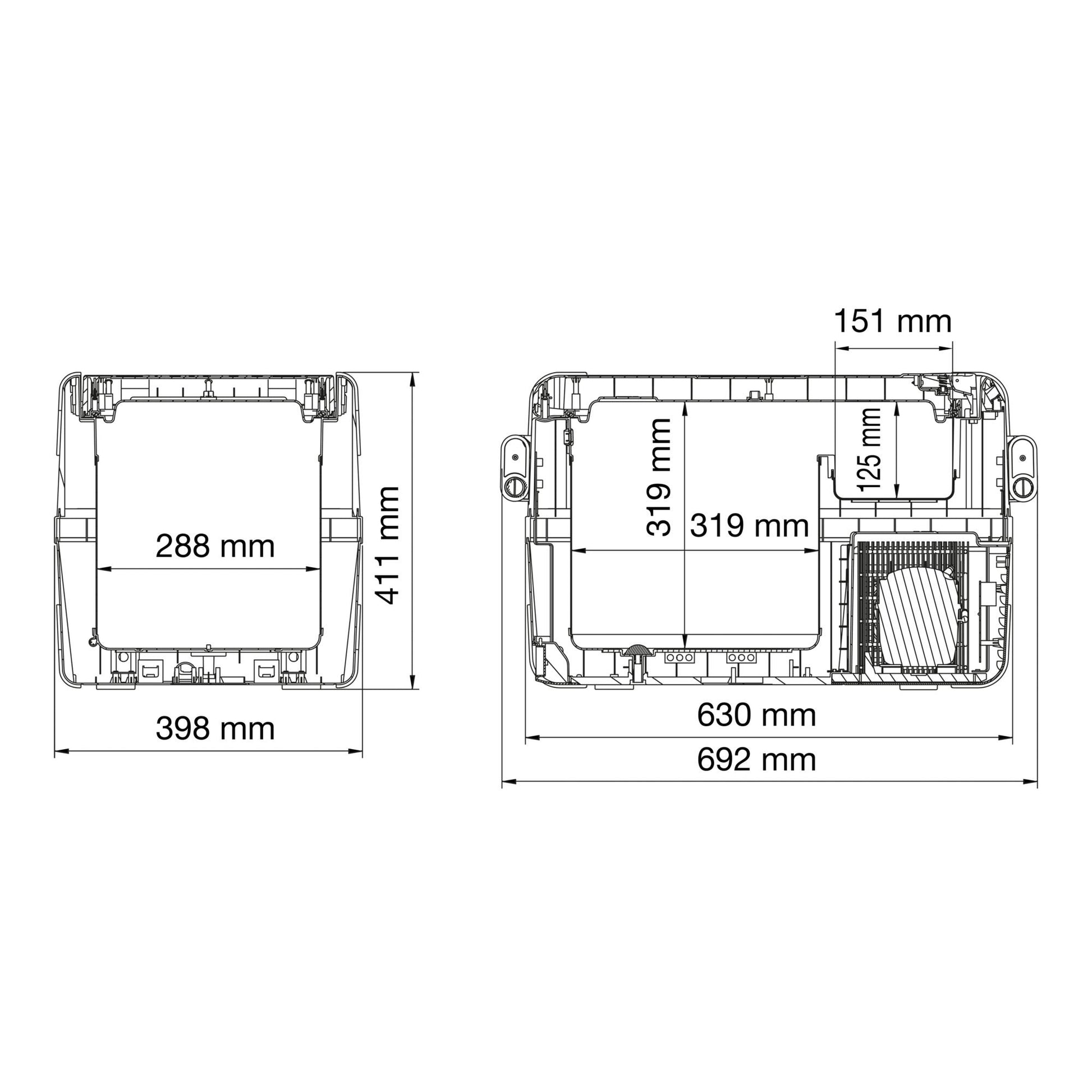 ["Mobile mini fridge for camping, vacations, leisure, and work. Energy-efficient and quiet operation","Cooling and freezing: Excellent cooling results even at extremely high outside temperatures, adjustable from 10 to -22 °C","Operates on 100V to 240V AC power as well as on 12V or 24V DC power in the car, truck, or socket. 3-stage battery monitor to monitor the car battery. Input frequency 50-60 Hz","32 liters capacity. Robust, durable housing with corner reinforcements, stainless steel hinges, and lid coating","Control panel with digital display, operating status and error display, memory function, USB port for charging small devices","Suitable for freezing up to -22 °C","Excellent cooling results even at extremely high outside temperatures","12/24 Volt DC and 100-240 Volt AC","CFX special electronics with digital temperature display","USB port for charging small devices"]