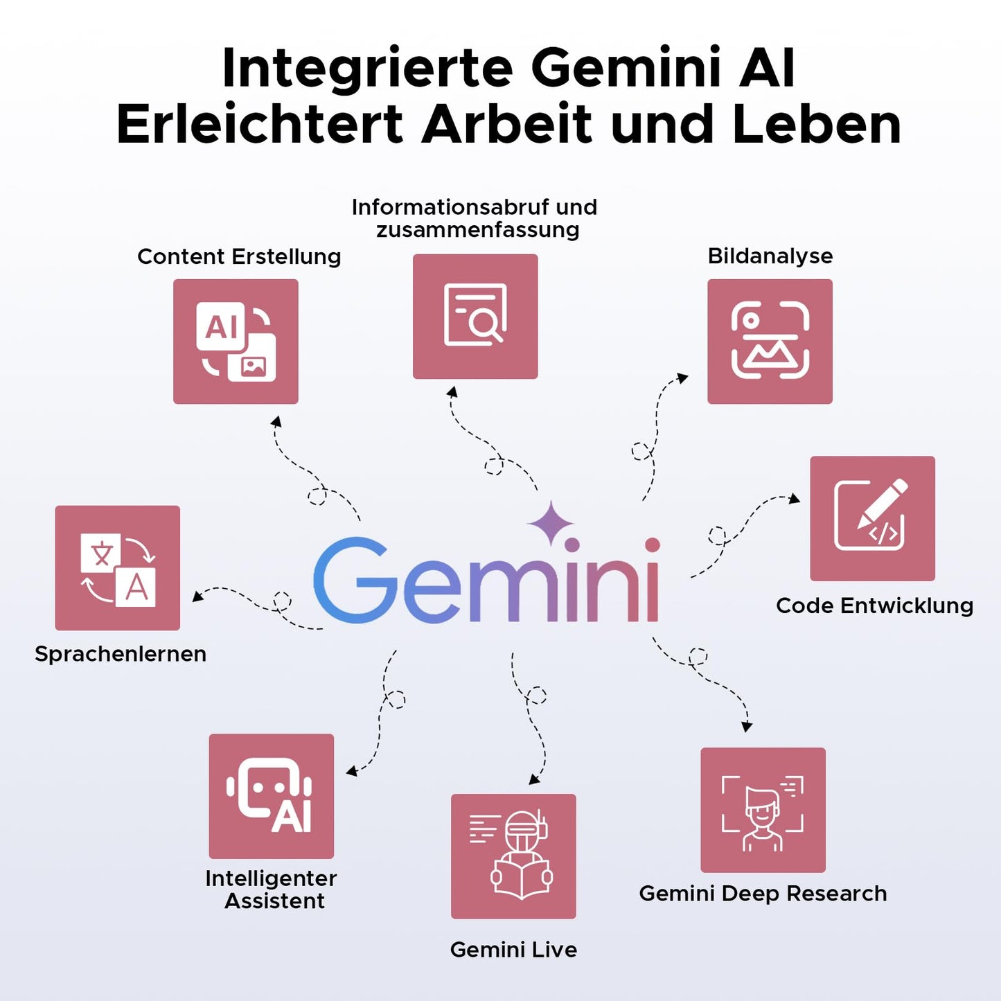 "Android 15 Tablet + Gemini AI: DOOGEE Tab G6+ Tablet 11 Zoll, Ihr bisher intelligentestes Tablet. Erleben Sie die Zukunft mit Android 15 und Gemini AI und erleben Sie ein ultra-reaktionsschnelles, intelligentes Erlebnis. Profitieren Sie von Echtzeitübersetzung, intelligenten Textvorschlägen und KI-gestütztem Multitasking, das Ihre Nutzungsgewohnheiten lernt und die Leistung optimiert. Ihr Tablet arbeitet jetzt schneller und intelligenter – wie ein persönlicher Assistent in Ihren Händen"
