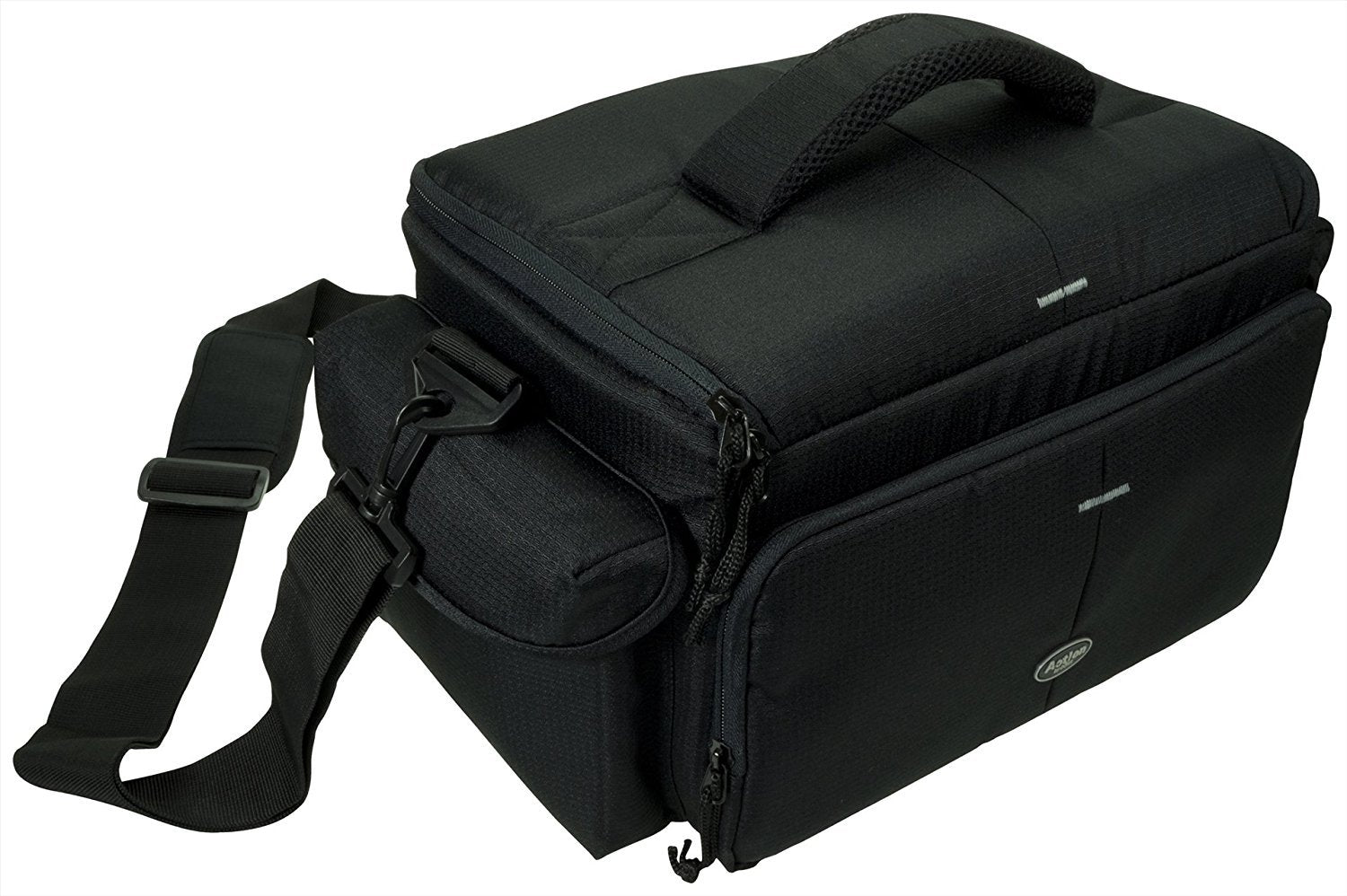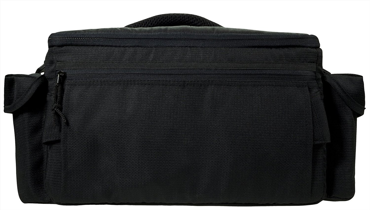 ["Affordable and functional | Splash-proof | Tear-resistant nylon exterior | Soft-line interior | Rubberized bottom dirt protection", "Good padding protects equipment optimally | Variable photo interior division | Open away from the body to quickly have the camera ready", "Front pocket, side pockets & accessory compartment in the lid provide ample space for accessories (e.g. spare battery, filters or memory cards)", "Comfortable handle and padded shoulder strap | Double zipper | Space for large photo and video equipment | Interior dimensions (HxWxD): 6.9 x 12.2 x 7.7 inches | Exterior dimensions (HxWxD): 8.3 x 16.1 x 9.1 inches"]