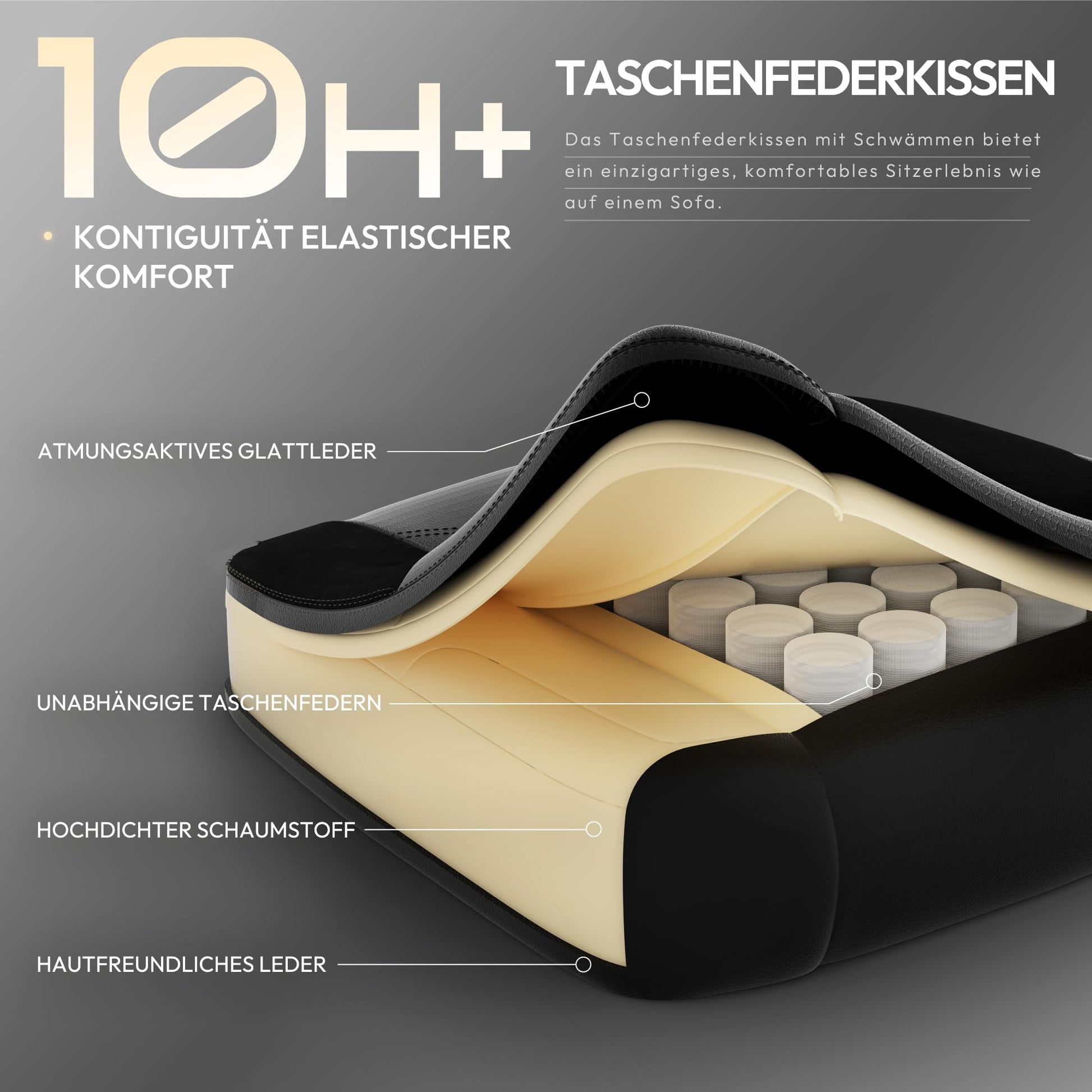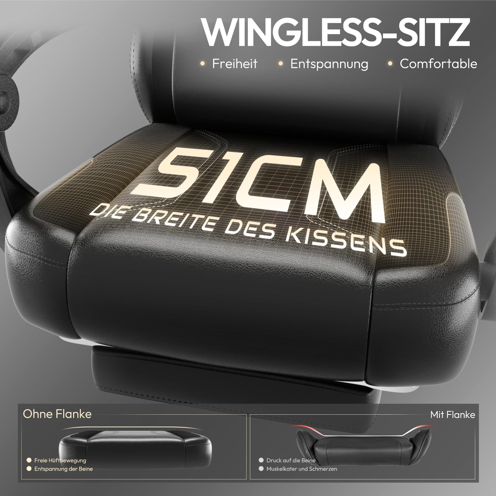 ["Advanced spring core technology for maximum seating comfort: The Dowinx Gaming Chair ergonomically with integrated pocket coil padding offers a unique seating experience like on a sofa. The intelligent adjustment to your body movements provides targeted support during long gaming or work sessions. Ideal for those who value durable comfort","Optimized seating - more space, more freedom: This gaming desk chair is specially designed for gamers of all body types. The wingless design allows for maximum freedom of movement - whether you want to stretch out, cross your legs, or lean back. For long-lasting seating comfort while gaming, working, or studying","Ergonomically designed with massage function and storage space: Equipped with an extra-large headrest and integrated massage function in the lumbar area, the chair offers first-class relaxation - perfect for long gaming nights. The clever back pocket provides space for accessories such as controllers, books, or snacks - organization on every gaming spot","Versatile adjustable - gaming or relaxing: The gaming chair with footrest can be flexibly tilted from 90° to 145°. The extendable footrest makes it the ideal recliner after the game. The reinforced mechanism and Class 3 gas lift provide reliable stability in any position - whether playing, working, or relaxing","Customer service and warranty - worry-free shopping: With easy-to-understand assembly instructions, 30 days return policy, and one year repair service, your satisfaction is guaranteed. Our German-speaking customer support is friendly and competent at your disposal anytime"]