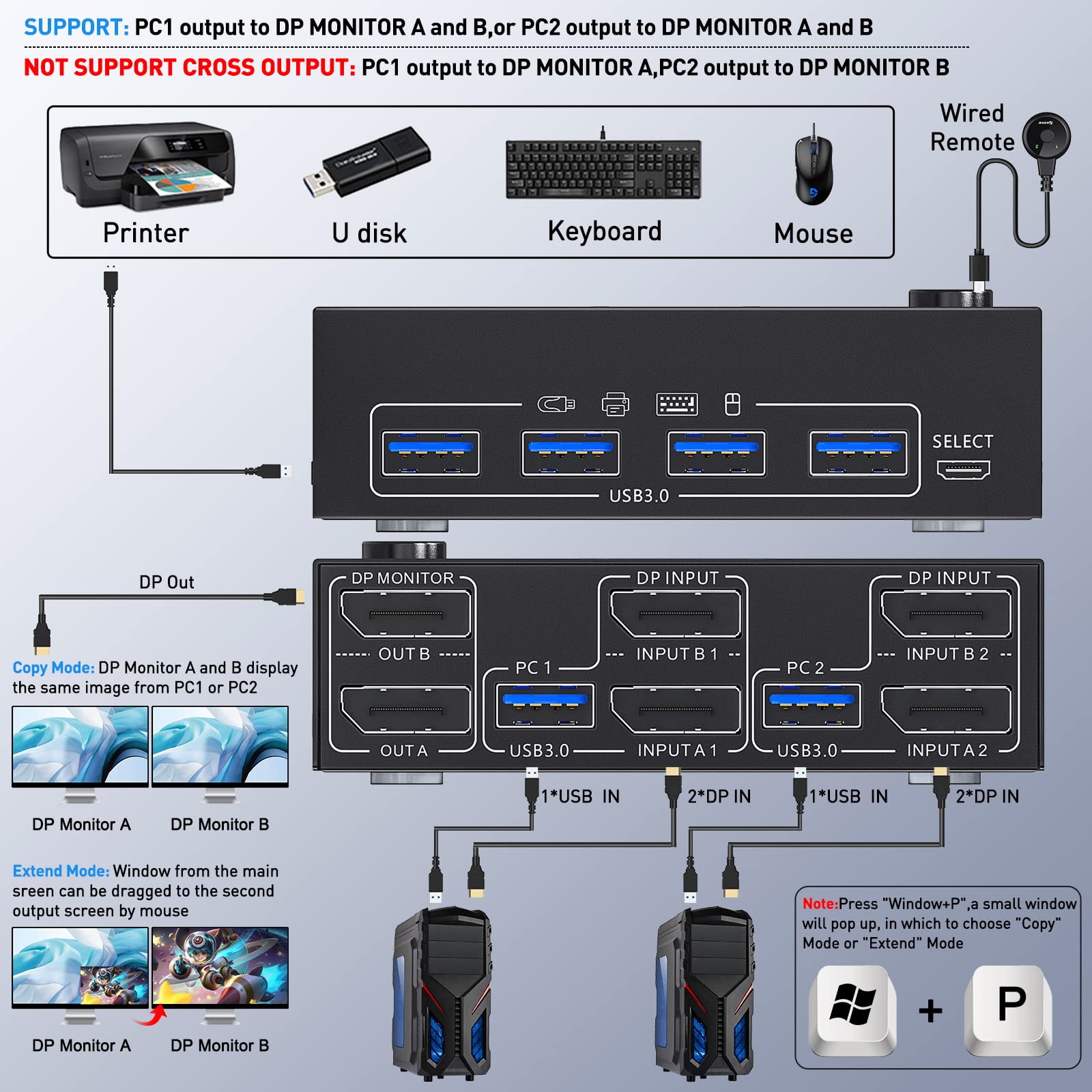 DP KVM Switch supports 2 computers and 2 monitors, allowing them to share keyboard, mouse, and monitor with USB 3.0 and DisplayPort connections. Supports 4K@60Hz resolution.