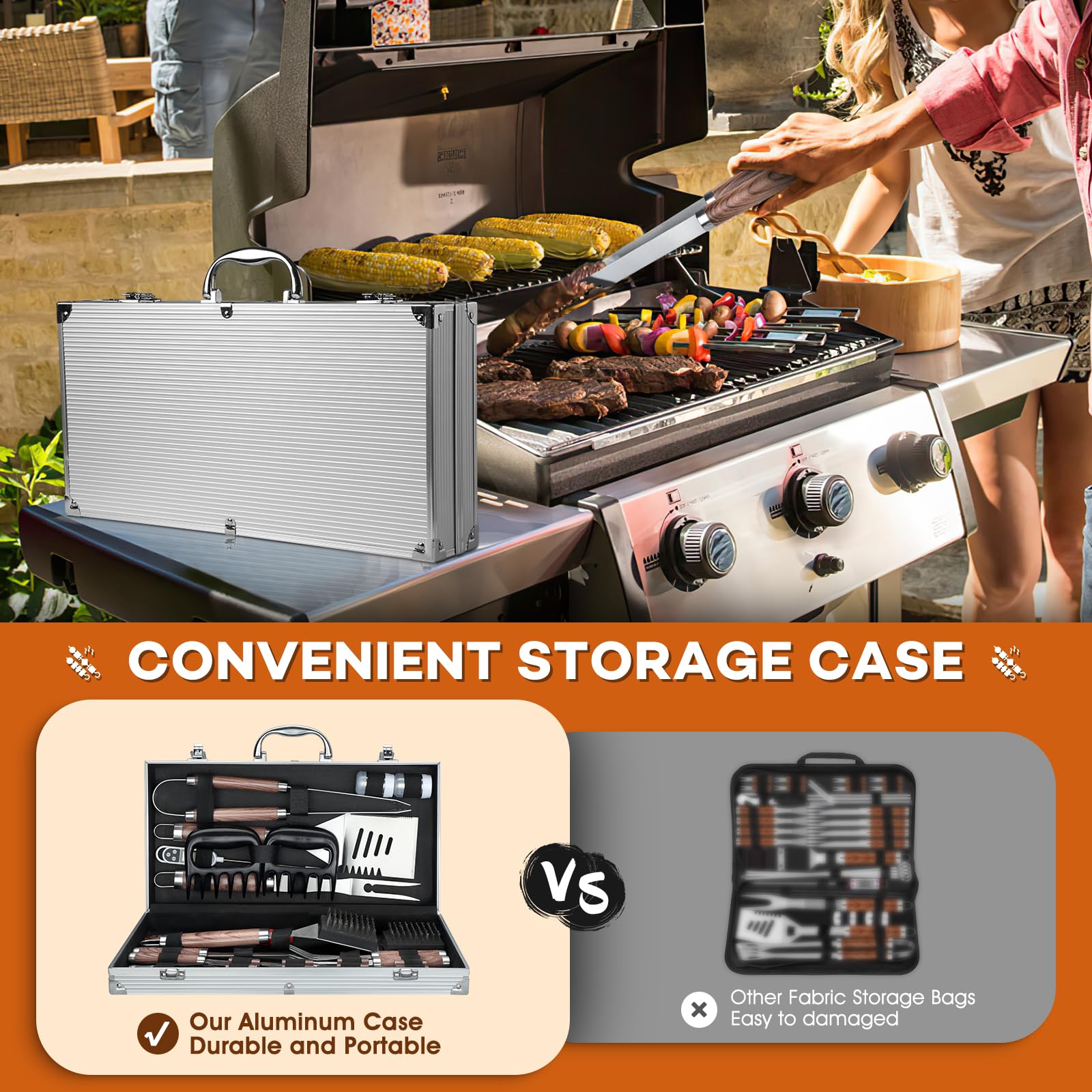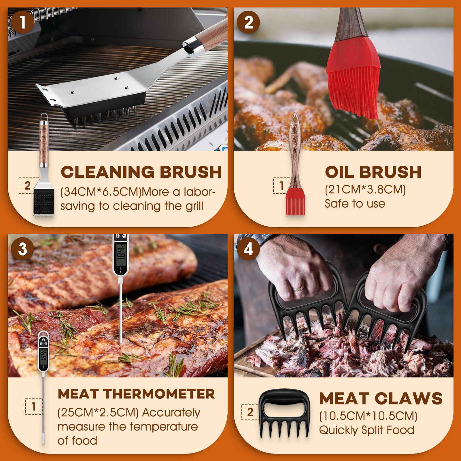 ["High-Quality Stainless Steel"] The grill tools are made of professional stainless steel with excellent high-temperature resistance and rust protection. The thickened steel structure makes the grill set case stable and not easily bent. And the metal part of the grill tools, formed in one piece, has superior toughness.