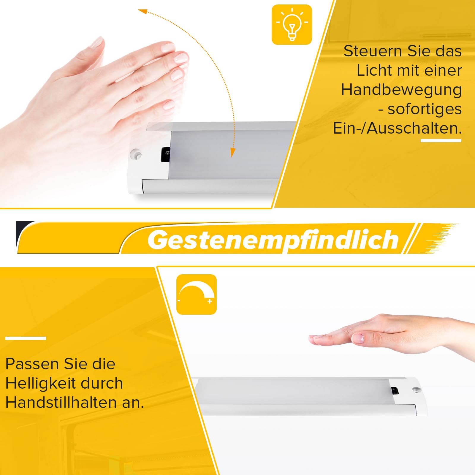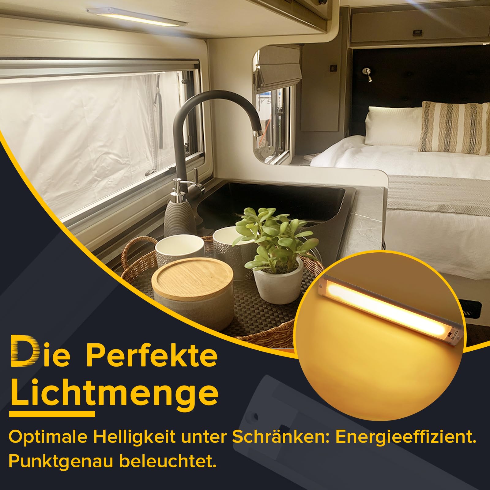 ["Ultra-thin 9mm design for tight spaces - Specifically designed for installation under motorhome or caravan cabinets: With only 9 cm thickness and modern, minimalist look, this LED strip fits perfectly into tight areas without being visually intrusive.","Sturdy aluminum housing & optimized light distribution - The heat-dissipating aluminum housing ensures durability and efficient cooling, while the white PC diffuser filters aggressive light - for uniform, eye-friendly lighting of your kitchen counter or storage areas.","Touchless gesture control with stepless brightness - Easy on/off switching with hand movement and stepless brightness adjustment (5-100%) - hygienic, practical, and ideal for mobile living spaces with changing lighting needs.","Energy-saving 12V LED technology & fixed installation - Thanks to the 12V DC connection (secured with cable and screws) and LED technology up to 80% more energy efficient than halogen lamps - no need for battery replacement, environmentally friendly, and consistently reliable.","Customizable & complete range - Available in various lengths and housing colors - discover more tailored lighting solutions for motorhomes in our 'Dream Lighting' brand shop."]