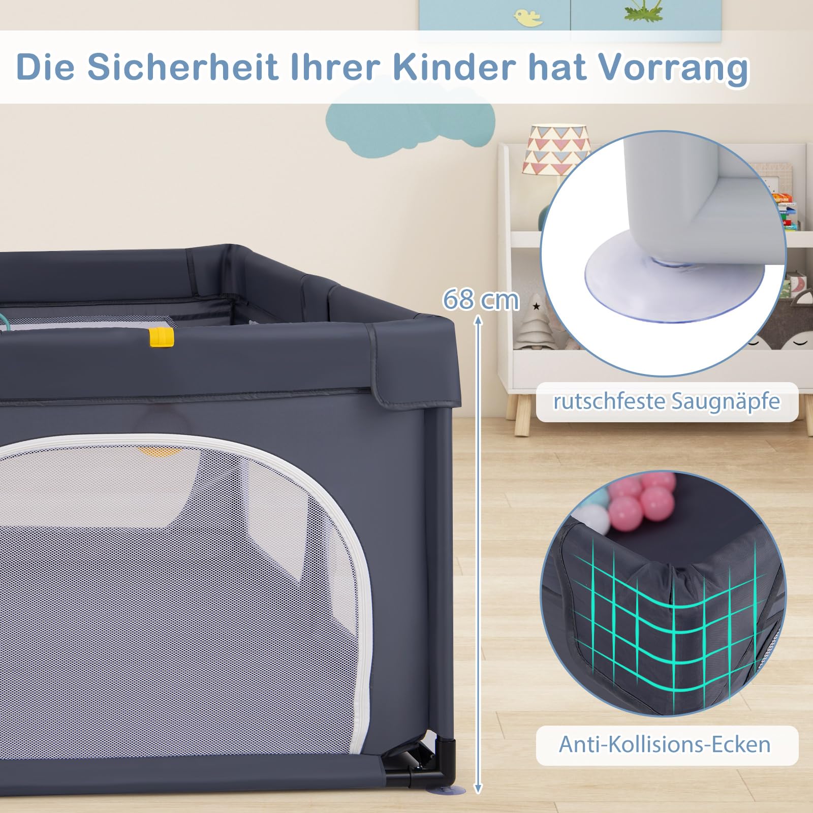DREAMADE Playpen for Baby, 189 x 158 cm Play Yard with 4 Pull Rings & 50 Ocean Balls & Carrying Bag, Large Safety Fence for Babies & Toddlers 0-3 Years (without Mattress, Dark Gray)