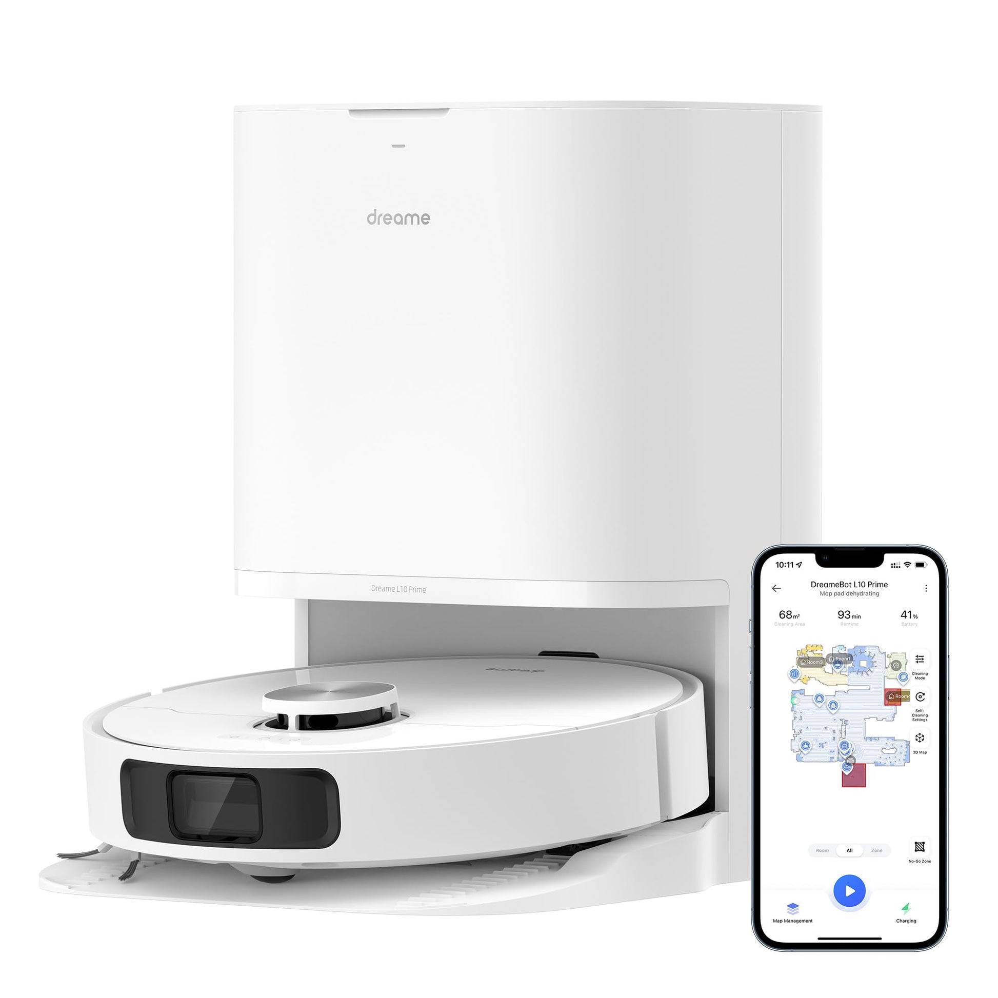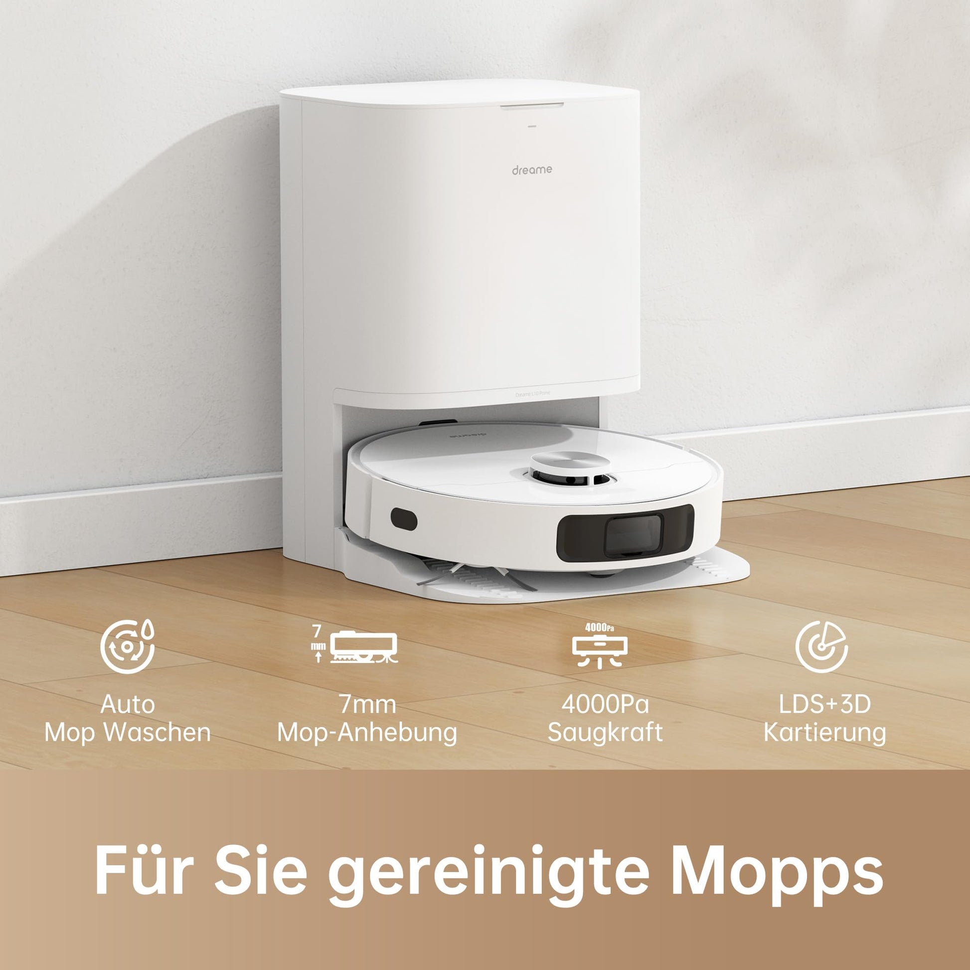 ["Automatic mop cleaning pads: The L10 Prime robotic vacuum with mopping function washes the mops automatically after each cleaning unit; Air dryer prevents mold and bacteria growth; Effortless freshness! Better cleaning","7 mm rising mops for carpet cleaning: With the rising mops of Dreame L10 Prime robotic vacuum, your carpet remains wet and prevents the need to re-mop when returning to the base station, avoiding further carpet soiling","2 rotating mop heads: How to scrub sauces or spilled cola from the floor? Our mop heads with two spinners mimic hand rotation and eliminate household dirt in no time","Strong suction power, thorough cleaning: 4,000-Pa power ensures powerful, easy dirt and hair pickup; Adjustable suction power for different surfaces like hardwood floors, crevices, or corners; Carpet floors can be detected and the mop can be lifted up to 7 mm* to keep carpets clean and dry","LDS navigation & 3D mapping: The Dreame L10 Prime vacuum robot uses LDS technology to intelligently plan routes, avoiding repetitive cleaning for effective results; With 3D maps in the app, you can visualize usage details and virtually design your home","Package list: a robot with self-cleaning charging station x1, side brush x1, power cord x1, mop pads x2, mop pad holder x2, user manual x1"]
