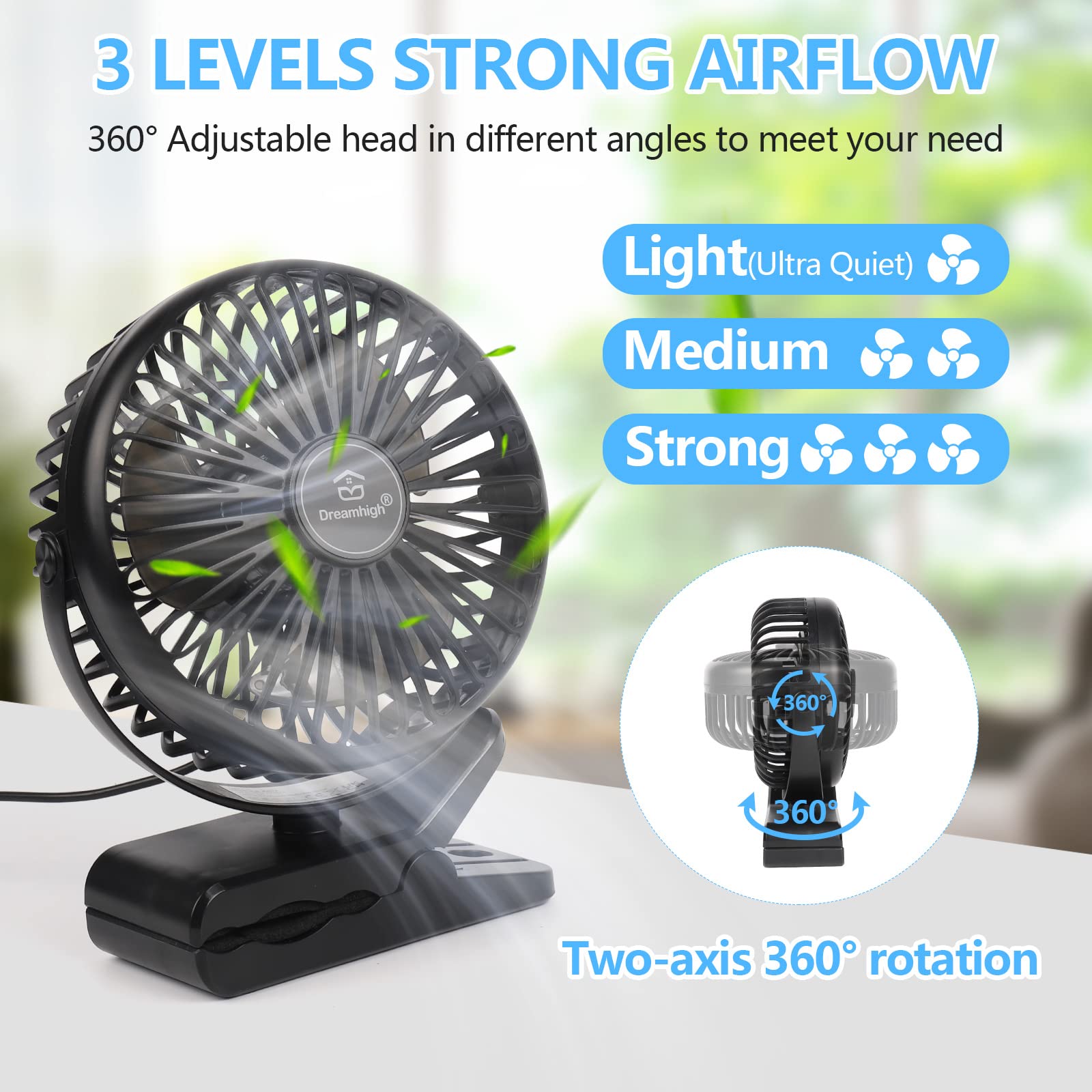 Dreamhigh® Mini USB Fan, 360° Rotatable Portable Clip Fan, 3 Speeds, Quiet Desk Fan for Desktop, Home, and Office, Black (USB Powered)