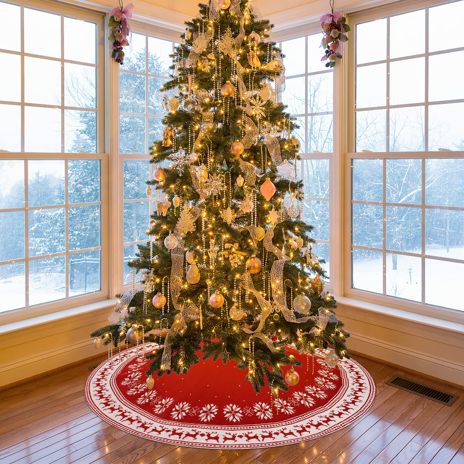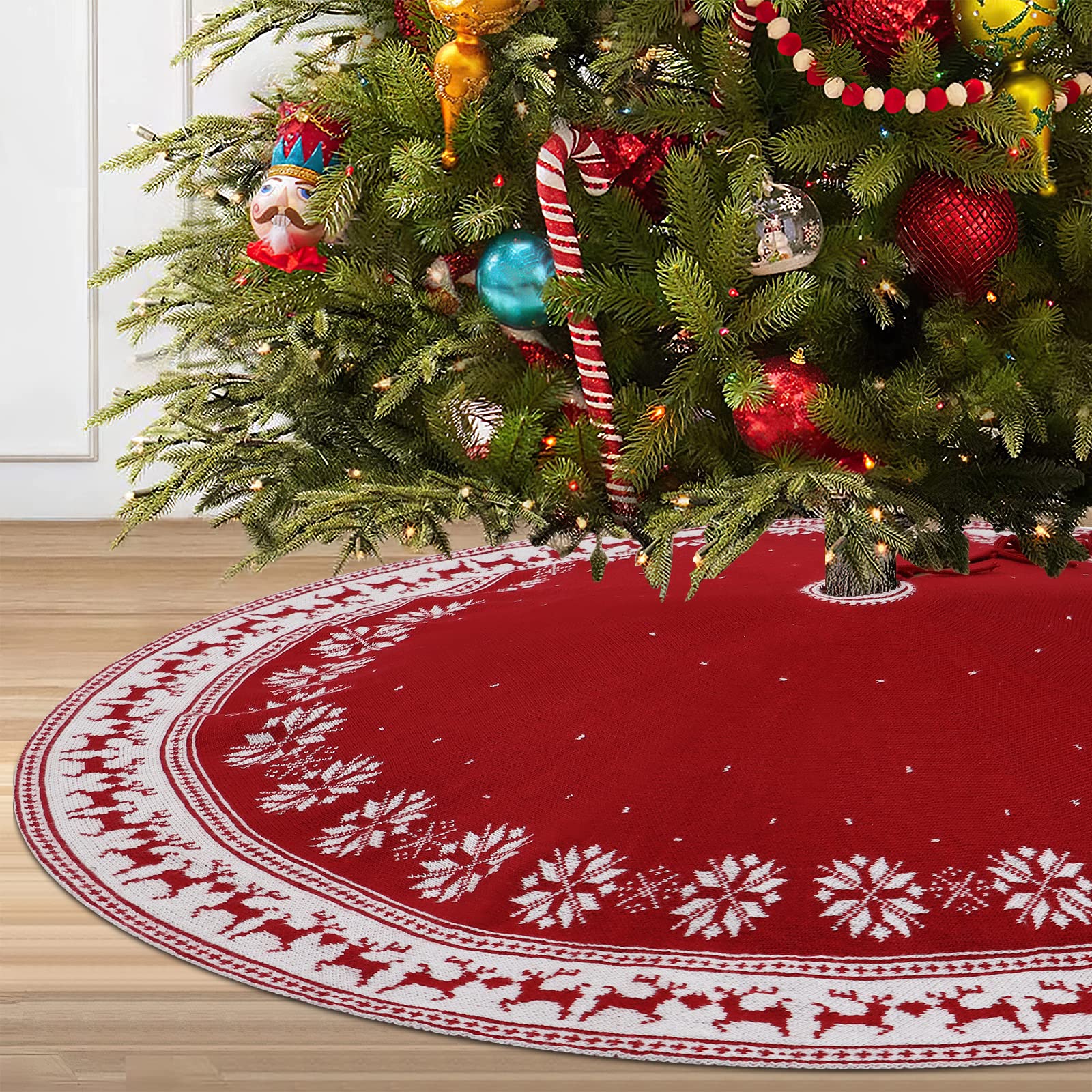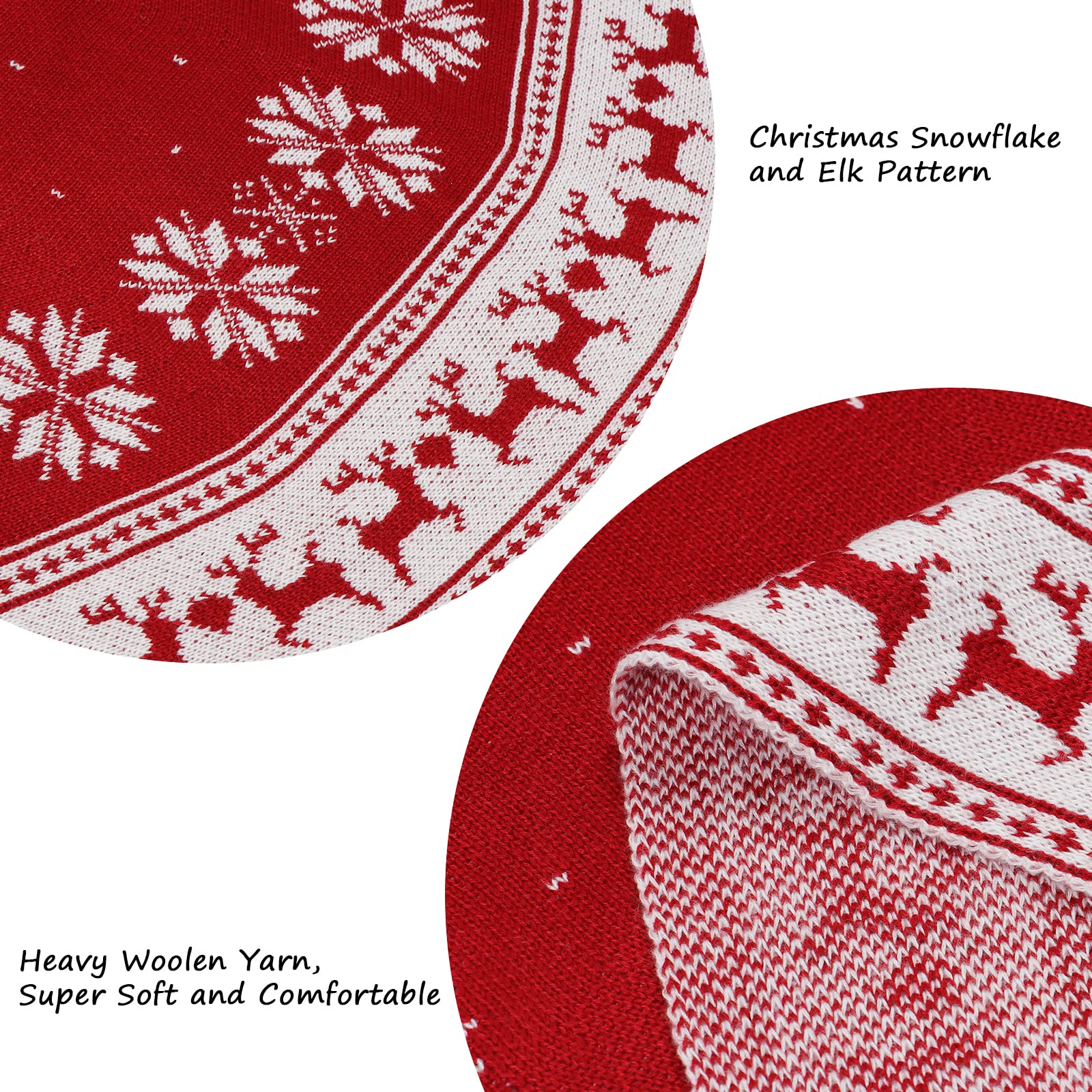 ["","🎄【Design】Christmas tree skirt has a unique design, the perfect combination of beautiful snowflakes and cute reindeer. The edges are sewn, 3 ribbons at the opening allow you to secure the tree skirt under the Christmas tree.","🎄【Premium Christmas Tree Skirt】Made of high-quality acrylic yarn, excellent workmanship and exquisite knitting technology make the red tree skirt thicker and more durable. The popular red is full of festive motifs that perfectly match the Christmas theme color.","🎄【Perfect Size】 The diameter of the knitted Christmas tree skirt mat is 35.4 inches/48 inches, fits any Christmas tree size, and keeps your floors clean from pine needles or tree resin. This Christmas tree skirt looks very beautiful under the Christmas tree, you can put many gifts on it and perfectly decorate your Christmas tree.","🎄【Use Anywhere】Snowflakes Christmas tree stand carpet is the best Christmas decoration. The rustic knitted Christmas tree skirt is great for family gatherings, living rooms, bedrooms, gardens, bars, hotels, school parties, supermarkets etc. as Christmas decor. Can also be a Christmas gift for your family and friends. No matter where you place them, you can add a festive atmosphere.","🎄【Easy to Use】These knitted tree skirts are very easy to use. You can easily complete the Christmas decoration by simply tying the knot. Place it on the bottom of the Christmas tree and you can prepare gifts. Whether it is a white or red Christmas tree, it fits perfectly with our tree skirts and brings you a strong Christmas atmosphere.",""]