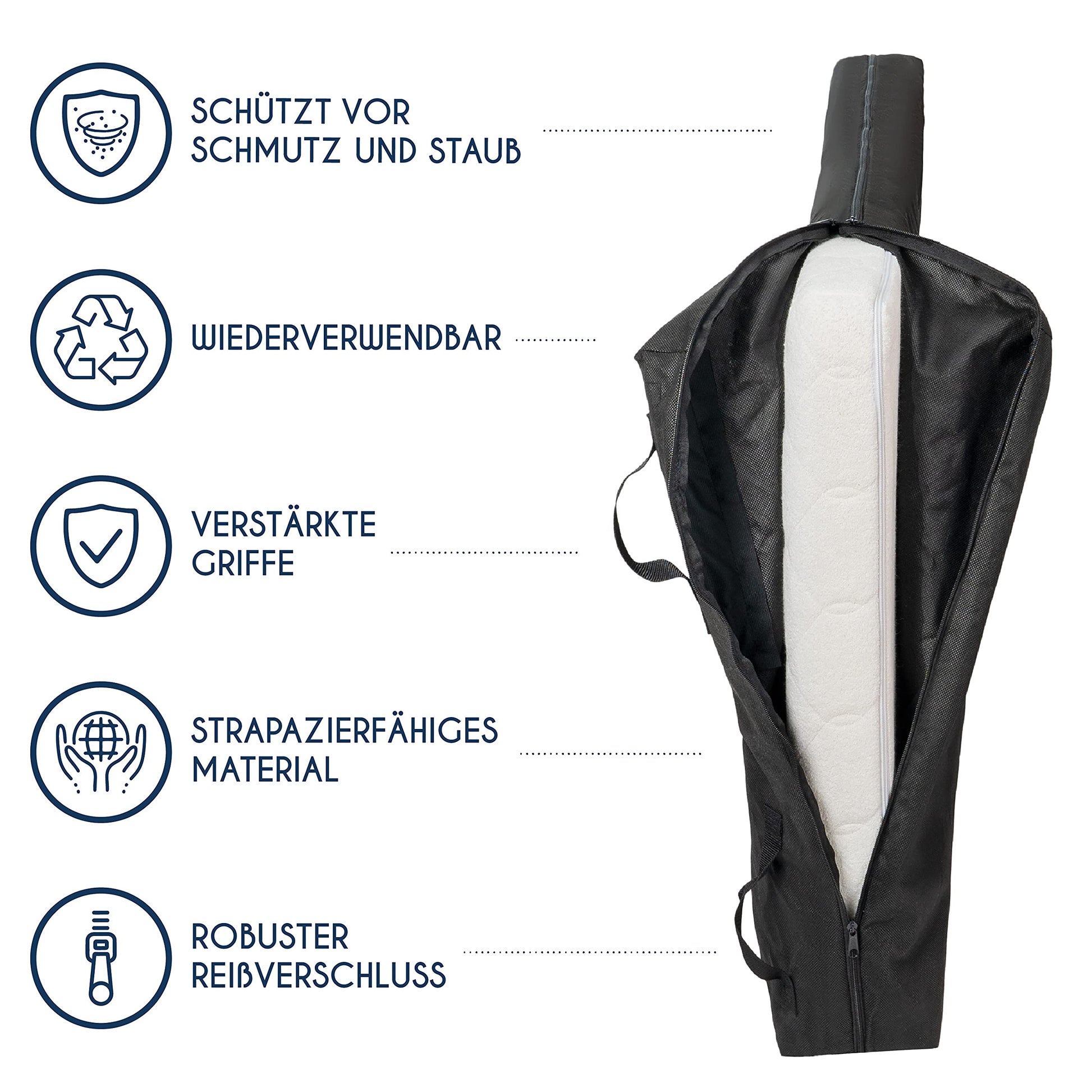 "Sorgenfrei umziehen - Moving can often be stressful and hectic, causing accidents like dropping a mattress in the stairwell and getting it dirty. With our mattress protectors, these problems will be a thing of the past. 160 X 200 (30 cm thickness) refers to the size of the mattress, with the cover dimensions varying slightly to fit better.","Optimal for your mattress and the environment - To ensure effective protection for your mattress, each mattress protector is made of 100% polypropylene. It is reusable and biodegrades 100 times faster than alternatives made of other plastic materials.","Practical and user-friendly - The protective cover makes your life easier: With its 3-sided zipper opening, the mattress cover can be quickly put on, and the sturdy carrying handles allow you to transport the mattress without any problems.","Optimal for mattress storage - The mattress storage bag is designed for long-term storage in the basement or attic: The material is durable, acts as an insulator, and protects your mattress from water, insects, or other unpleasant surprises.","Chemical-free - While you don't sleep directly on it, our mattress protector tightly encases your mattress, so we put great emphasis on a pollutant-free production, certified by the independent testing institute OEKO-TEX."